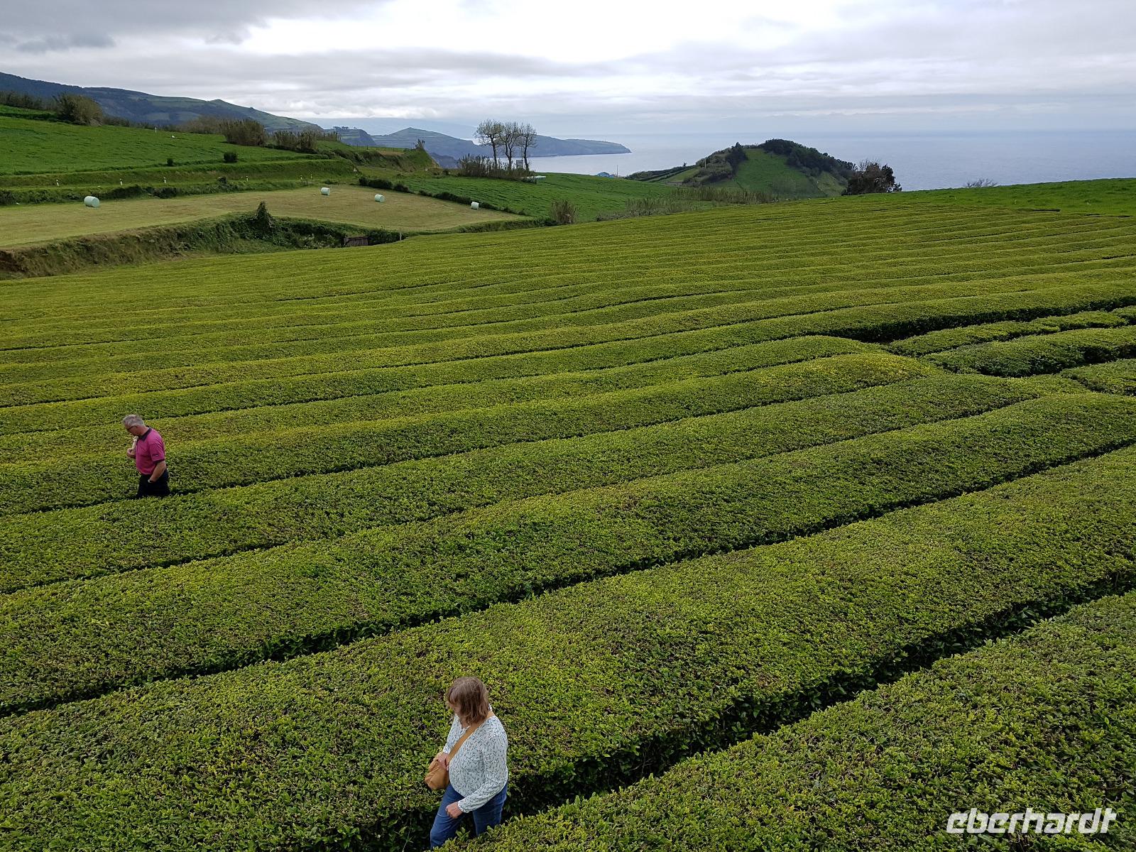 Auch Heilwasser und Heilerde für Kuren gewinnt man aus diesen Quellen. Wir besichtigen diese bei einem Spaziergang. Es sieht aus wie die Küche des Teufels. Einen Fotostopp legen wir oberhalb des Kraterrandes ein und fahren weiter entlang der Nordküste bis Gorreana, der einzigen Teeplantage Europas! Hier sehen wir aus der Nähe, wie die Teepflanzen aussehen und der Tee verarbeitet wird. Am Ende der Besichtigung verkosten wir grünen und schwarzen Tee. Auf der Rückfahrt zum Hotel legen wir noch einen Fotostopp am heiligen Iria Aussichtspunkt ein, wo wilde Callas einfach in der Natur von allein wachsen. Herrlich. Zurück im Hotel gucken viele von uns heute das Champions League Spiel Real Madrid gegen Bayern. Ein Spanier gegen viele nette deutsche Gäste ?? Es ist 20.30 Uhr und immer noch hell.