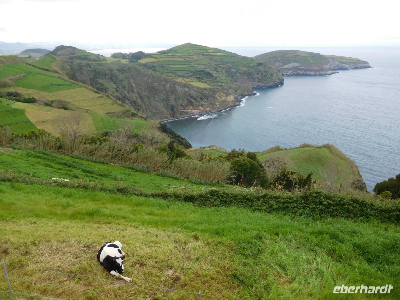prägt die bäuerliche Lebensweise das Gesamtbild der Insel. Alice erklärt uns auch, dass nicht alle auf den Azoren sich zu 100% portugiesisch fühlen, da über die Jahre nicht nur die Portugiesen, sondern auch die Spanier, aus Flammen, Kanada oder die USA. Direktflugverbindungen machen es möglich, dass die Verwandten aus der ganzen Welt ihre Familien besuchen können. Die Fahrt führt entlang der Südküste nach Sao Sebastiao, der ältesten Siedlung Terceiras. Hier machen wir eine Kaffeepause und besuchen die Kapelle des Heiligen Geistes. Weiter fahren wir hoch auf den Serra do Cume Gipfel mit total freier Sicht auf fast die gesamte Insel. Toller Blick aus 545 Metern Höhe. Man könnte glauben, dass man auf Irland ist mit den grünen Wiesen und den Kühen. Am größten Strand der Azoren, Victoria Praia mit 21.000 Einwohnern machen wir Mittagspause in der Sonne, nachdem wir vom Aussichtspunkt do Facho den Hafen und die Ferienstadt betrachtet haben..
