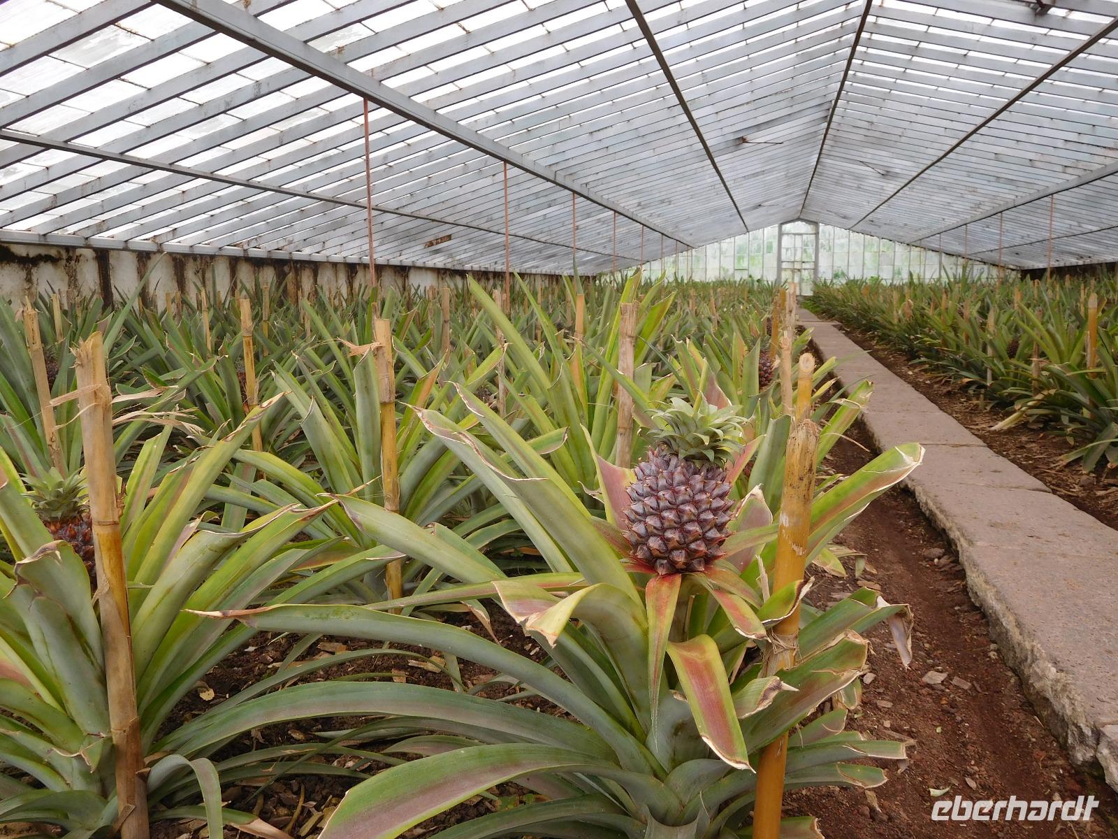 Auf den Azoren wechselt das Wetter ständig. Heute ist es nicht so sonnig wie gestern, aber kein Regen. Wir fahren erstmal an der Südküste entlang zu einer Ananas-Plantage, wo wir mehr über den Anbau der leckeren Früchte erfahren. Viele von uns wussten noch nicht, dass es von der Zucht bis zur Frucht ca. 18 MonateZeit braucht. So viel Zeit für eine einzige Ananas. Auf dem Weg erzählt uns Alice im Bus, wie man damals hier die Orangen, Tabak, Tee oder Ananas eingeführt hat. Mit dem Bus fahren wir an der Unileite vorbei, Portugals größter Milchfabrik und Milchlager. Die Fahrt ist schön. Entlang an grünen Wiesen und Bauern mit ihren Kühen. Hortensien und wilde Callas wachsen auch hier überall. Vom Pico do Carvao Aussichtspunkt haben wir einen tollen Blick auf die Nord- und Südseite gleichzeitig und von hier sieht man auch die engste Stelle der Insel mit Ponta Delgada und die über 65 Vulkankegel um uns herum. Weitere Fotostopps sind an einem Aquädukt und zum Lagoa do Canario oder Kanarienvogelsee. Die Vegetation hier oben, über 800 Meter, hat sehr dichte Märchenwälder.
