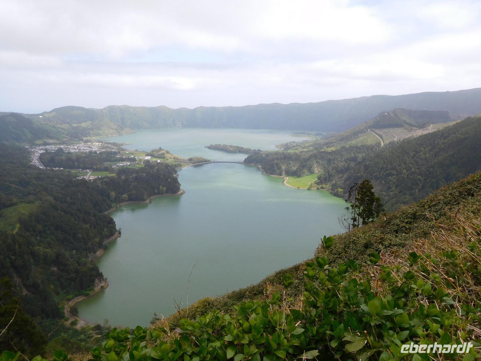 Gleich kommt das Highlight des Tages: der Aussichtspunkt Vista do Rei, von wo wir einen außergewöhnlichen Blick auf die atemberaubende Landschaft bestaunen können. Die zwei Seen Lagoa Azul und Lagoa Verde, die in blau-grünen Farben schillern, von hier oben zu betrachten, ist wie eine lebendige Postkarte. Alice erklärt uns, wie durch die Sonnenstrahlung und die Algen in den Seen, diese eine solche Farbe bekommen. Heute gibt es ein paar Wolken. Die beiden Seen sind mit einer Brücke getrennt, die in 1958 gebaut wurde und von hier oben sieht das Ganze einfach herrlich aus. Weiter unten machen wir auch einen Fotostopp am Santiago See. Ganz unten, fast neben den Seen liegt das Dorf Sete Cidades mit nicht mehr als 800 Einwohnern. Hier machen wir erstmal eine Mittagspause und danach besuchen wir gemeinsam die Kirche San Nicolas. In Sete Cidades sieht man einige schöne Herrenhäuser, die im 19. Jahrhundert als Sommerresidenzen gebaut wurden. Auf der anderen Seite des Kraters, der Nordseite der Insel, machen wir einen unvergesslichen Fotostopp am Aussichtspunkt do Escalvado oder ehemals Wal- Aussichtspunkt.