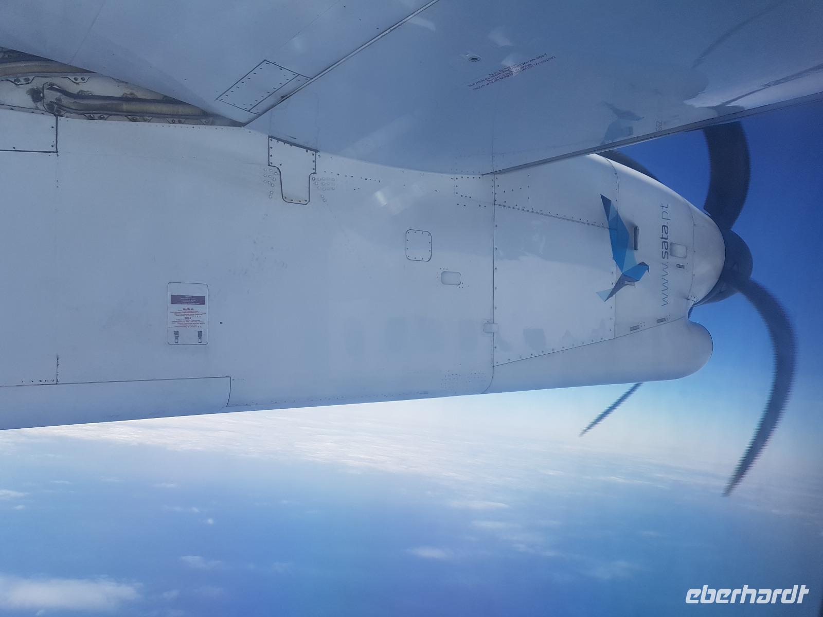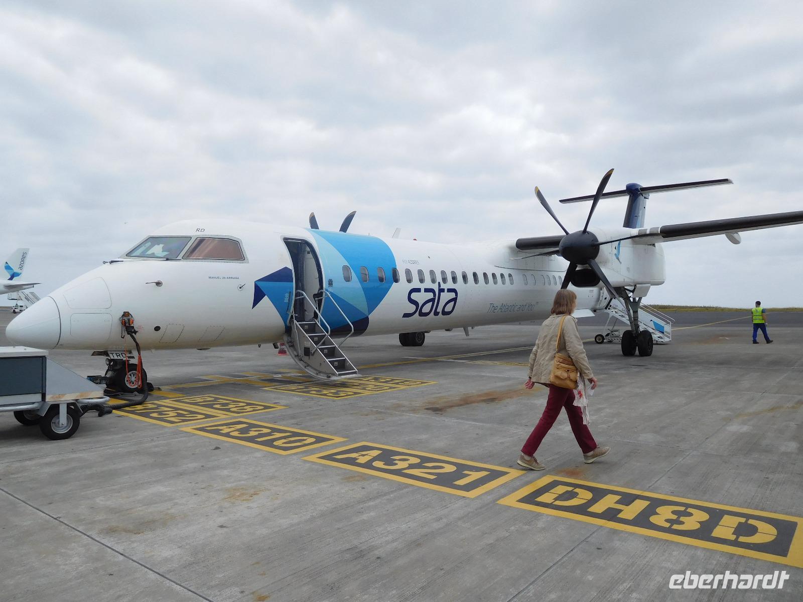 Wir fliegen von Ponta Delgada nach Terceira erst am frühen Nachmittag, so dass wir den Vormittag zur freien Verfügung haben. Wir sehen uns beim Frühstück und viele entscheiden sich dafür, bis 11 Uhr einen Spaziergang am Meer entlang zu genießen. Um 12.30 Uhr werden wir vom Hotel abgeholt und zum Flughafen gebracht. Für viele von uns ist so eine PropellerMaschine was ganz Neues und wir sind total begeistert. Die Flugdauer beträgt ca. 25 Minuten. Während des Fluges kann man schon den Gipfel des Vulkans Pico erkennen und natürlich den tiefen, schönen, blauen Atlantik. Wunderschön!