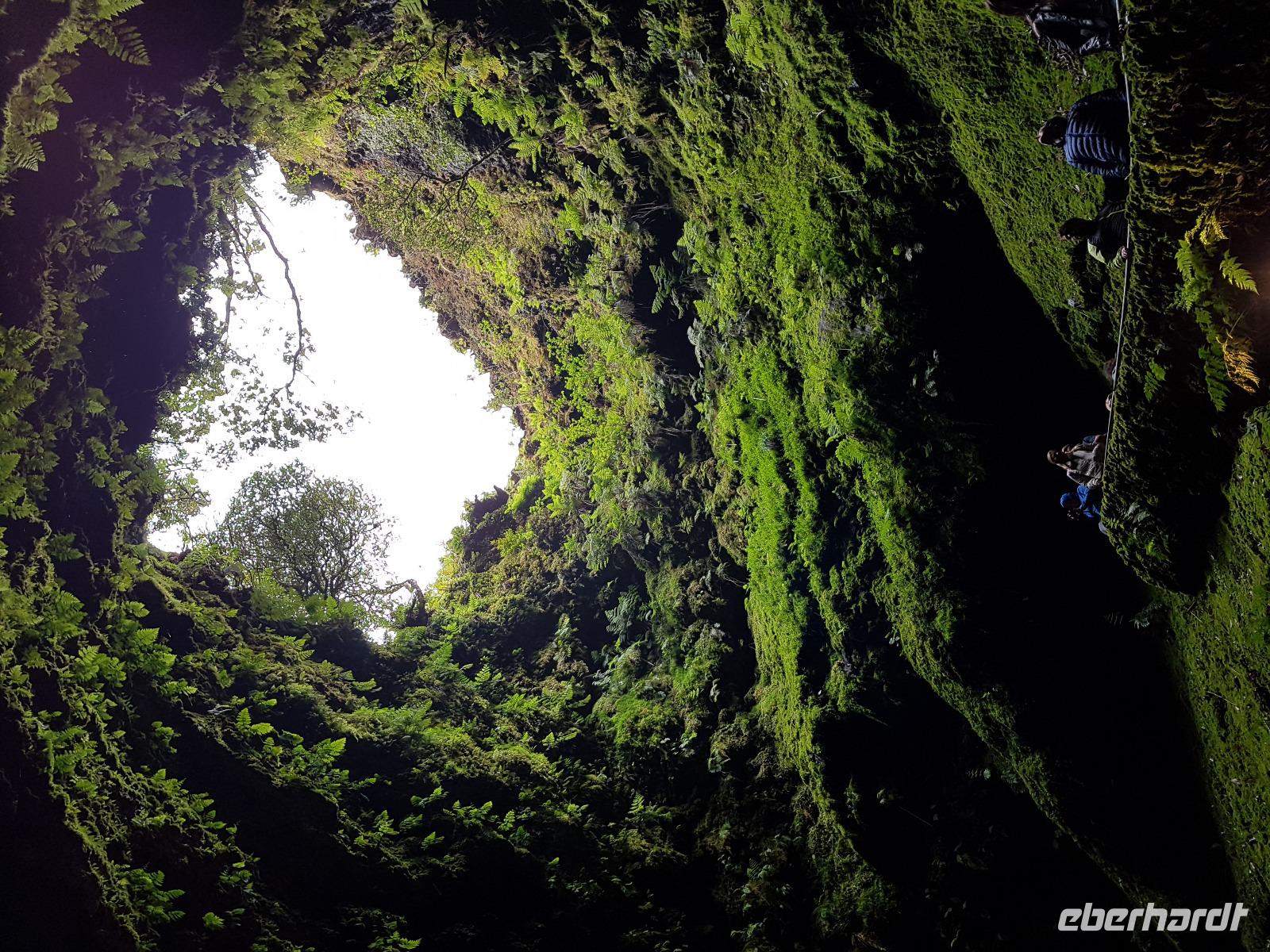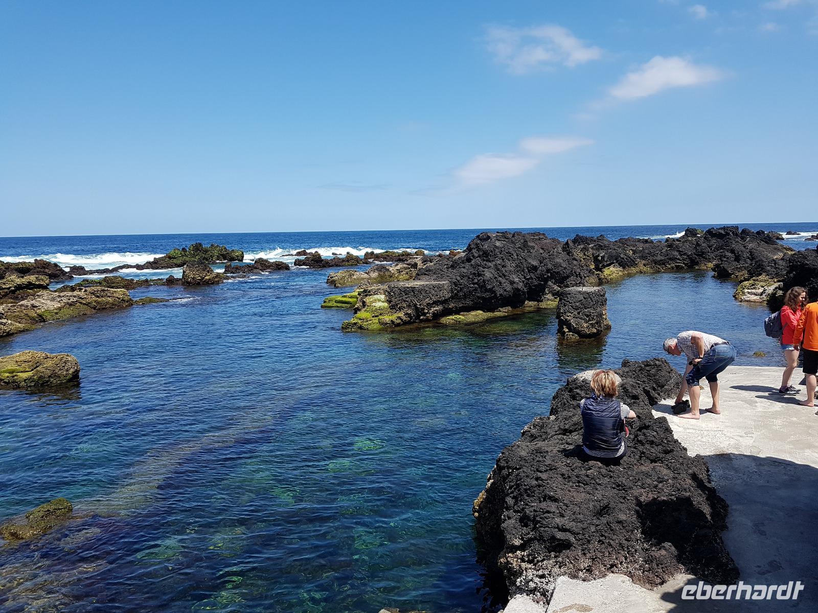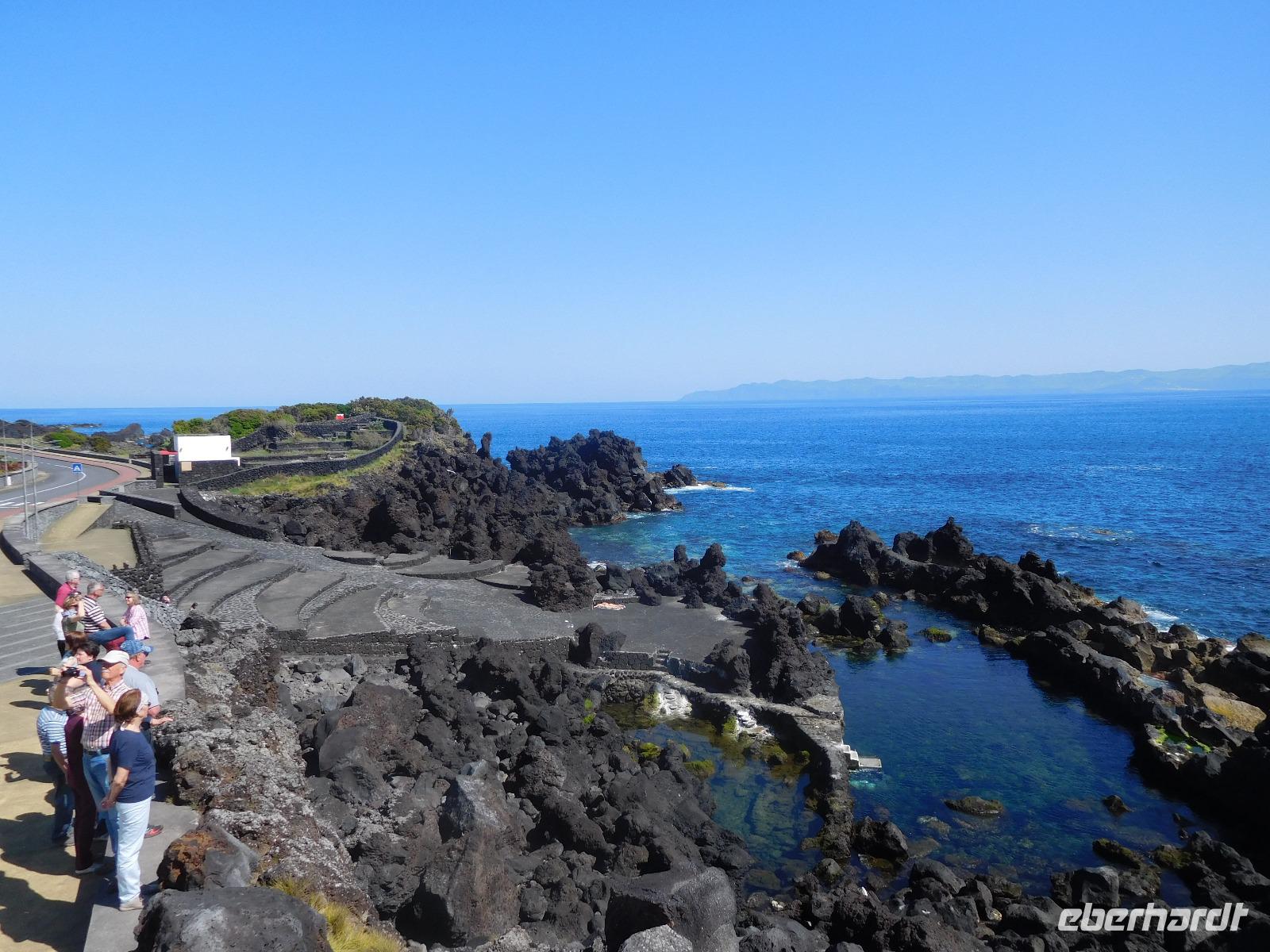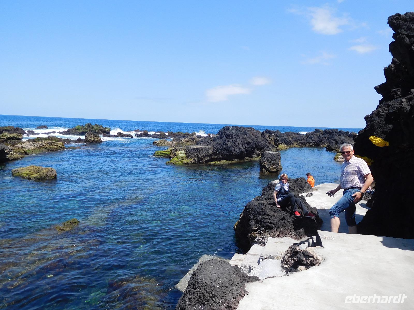 Nicht weit von Biscoitos sehen wir natürliche Schwimmbäder, die mit der Lava Zunge vom Vulkan perfekt sind um hier am Meer ohne Wellen zu baden. Im Weinort Biscoitos besuchen wir natürlich auch das Weinmuseum der Familie Brumm. Während einer süßen Weinprobe lernen wir den Inselwein kennen. Unser Ausflug bringt uns weiter in den nördlichen Inselteil durch die Caldeira oder Kessel de Guilherme Moniz, dem größten Krater des Archipels. Wir besuchen die wohl bekannteste und eindrucksvollste Vulkanhöhle der Azoren, Algar do Carvao. Ein Highlight der Reise auf jeden Fall. Mit einer Tiefe von mehr als 100 Metern und den vielfältigen vulkanischen Formen und Gesteinen bestaunen wir ein Naturwunder ... Die viele Treppen, die zu überwinden sind, sind für uns kein Hindernis. Einfach unglaublich. Wir brauchen eine Jacke, da es ab und zu von oben tropft. Bevor wir im Hotel ankommen, gibt es noch als Überraschung von Alice eine Käseverkostung bei „Queiso Vaquinha". Danach gehen einige von uns ins Meer baden. Das Wasser ist noch ein bisschen frisch, aber wenn man dann drinnen ist, ist es einfach herrlich. Abendessen will heute jeder individuell gestalten und einige von uns entscheiden sich, gemeinsam zum Hafen zu gehen.