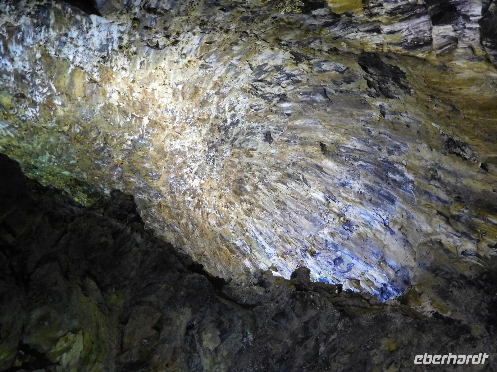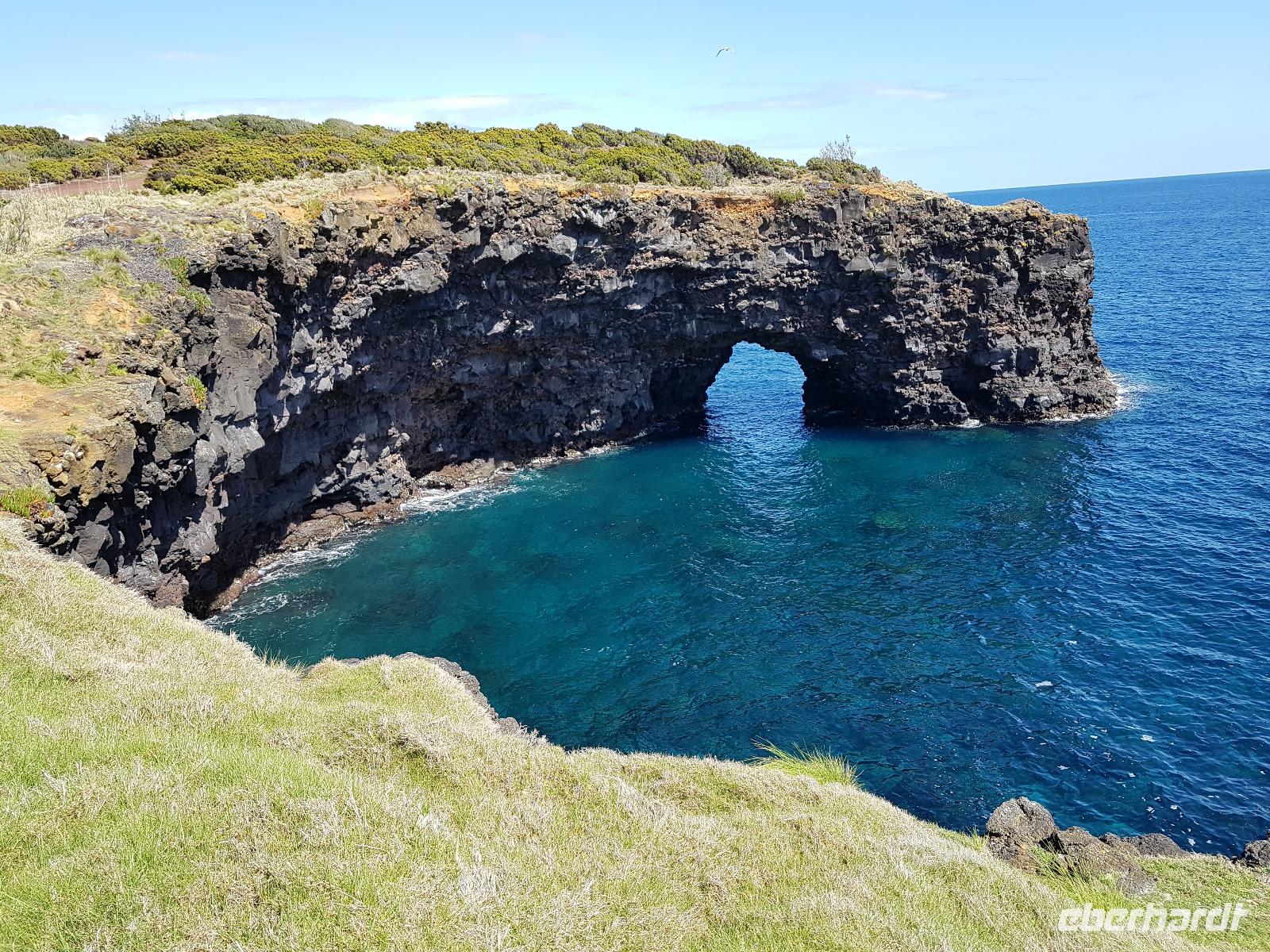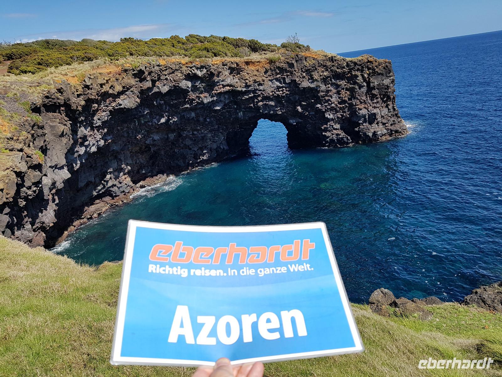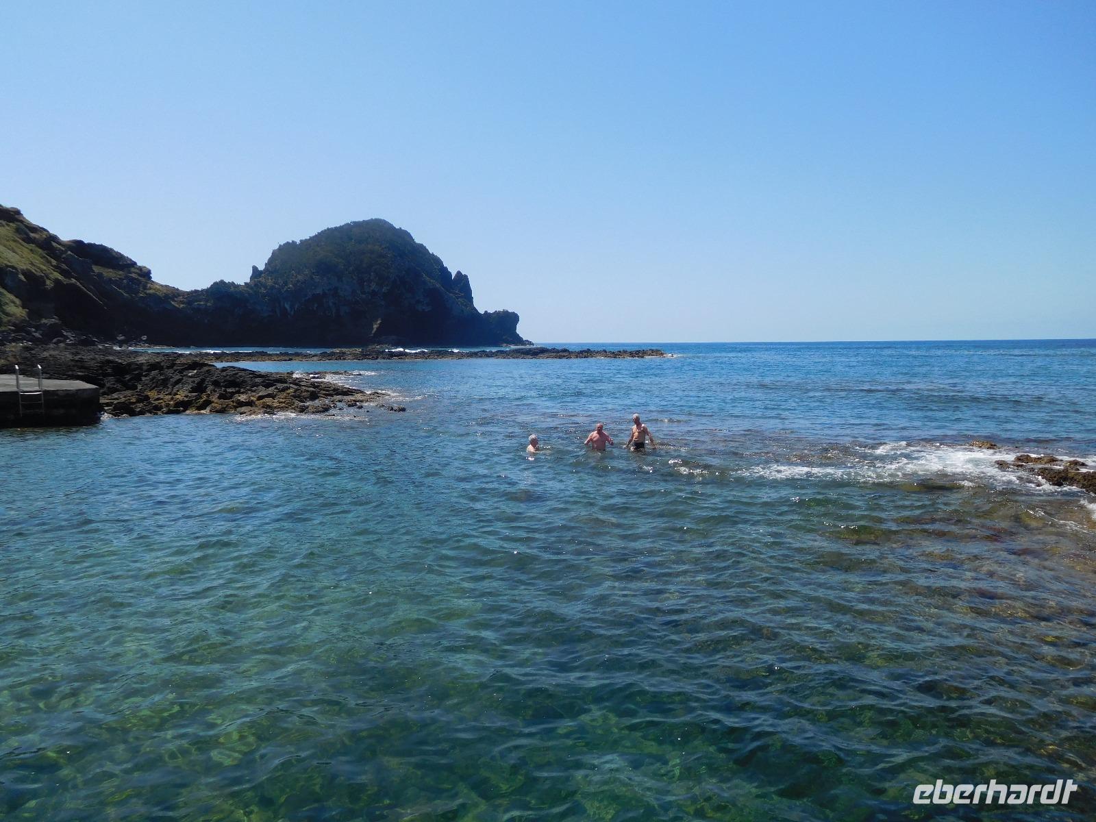 Nicht weit von Biscoitos sehen wir natürliche Schwimmbäder, die mit der Lava Zunge vom Vulkan perfekt sind um hier am Meer ohne Wellen zu baden. Im Weinort Biscoitos besuchen wir natürlich auch das Weinmuseum der Familie Brumm. Während einer süßen Weinprobe lernen wir den Inselwein kennen. Unser Ausflug bringt uns weiter in den nördlichen Inselteil durch die Caldeira oder Kessel de Guilherme Moniz, dem größten Krater des Archipels. Wir besuchen die wohl bekannteste und eindrucksvollste Vulkanhöhle der Azoren, Algar do Carvao. Ein Highlight der Reise auf jeden Fall. Mit einer Tiefe von mehr als 100 Metern und den vielfältigen vulkanischen Formen und Gesteinen bestaunen wir ein Naturwunder ... Die viele Treppen, die zu überwinden sind, sind für uns kein Hindernis. Einfach unglaublich. Wir brauchen eine Jacke, da es ab und zu von oben tropft. Bevor wir im Hotel ankommen, gibt es noch als Überraschung von Alice eine Käseverkostung bei „Queiso Vaquinha". Danach gehen einige von uns ins Meer baden. Das Wasser ist noch ein bisschen frisch, aber wenn man dann drinnen ist, ist es einfach herrlich. Abendessen will heute jeder individuell gestalten und einige von uns entscheiden sich, gemeinsam zum Hafen zu gehen.