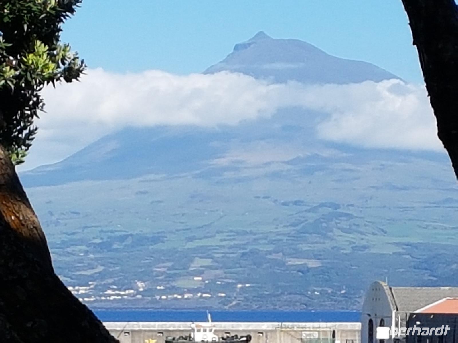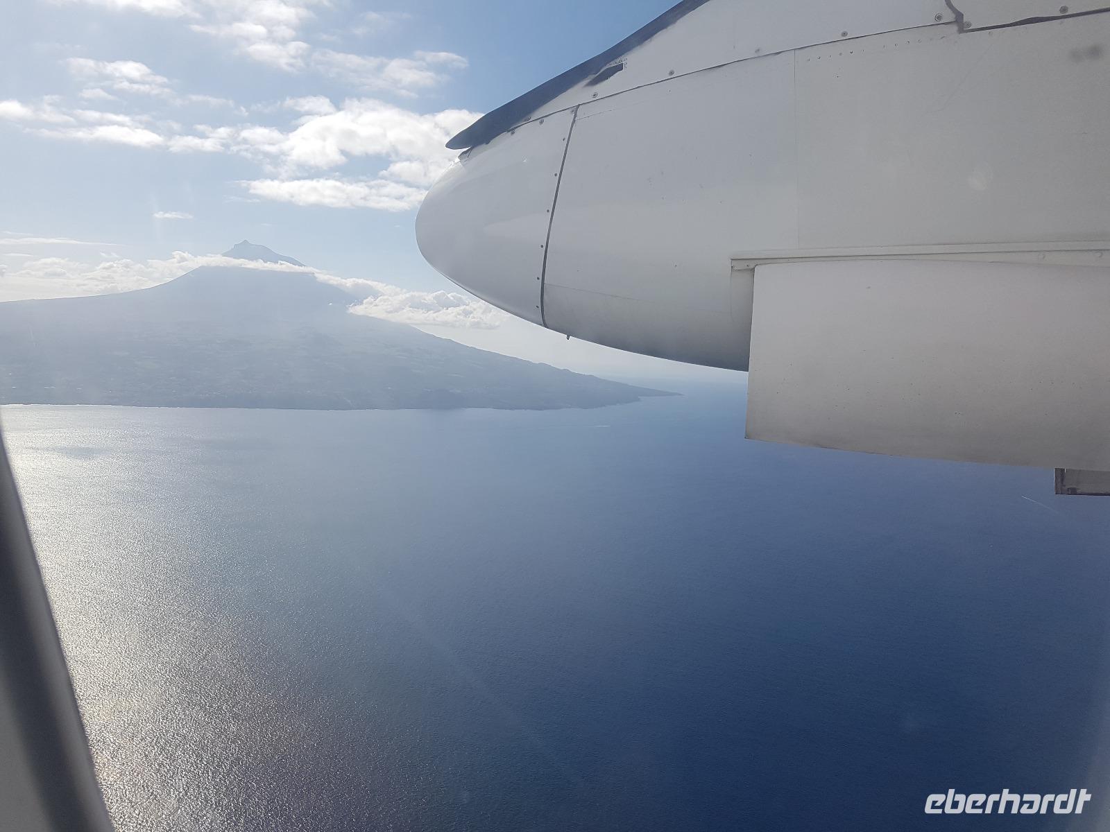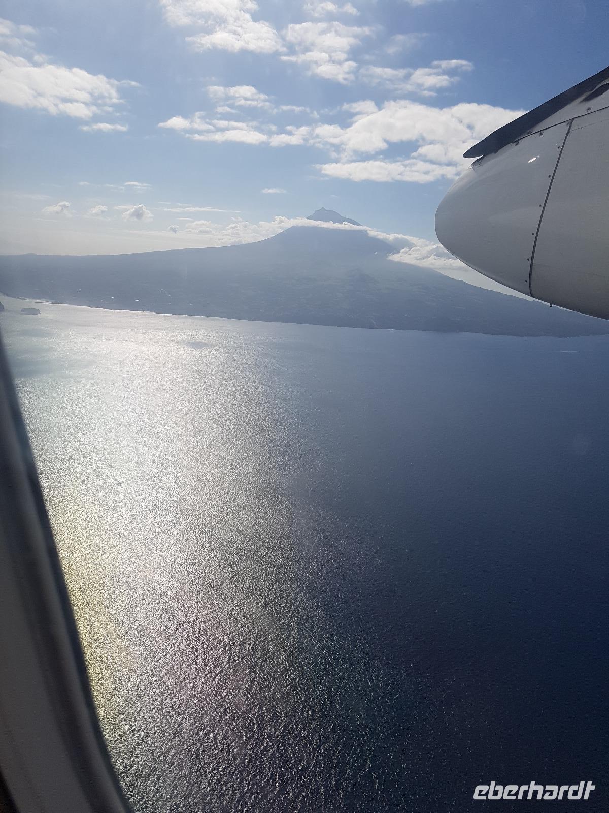 Heute klingelt der Wecker ganz früh um 5.30 Uhr da unser Flieger zur Faial Insel schon um 9.40 Uhr weiterfliegt. Wir möchten heute das Hotel nicht verlassen da uns die Anlage sehr gut gefällt. Nach dem Frühstück geht es los zum Flughafen in Terceira, von wo wir nicht pünktlich abfliegen können, da die Maschine irgendein kleines Problem hat. Angeblich mit dem Gewicht. Viele Koffer von uns kommen nicht mit dieser Maschine, sondern werden erst heute Nachmittag mit der letzten Maschine ankommen. Während des Fluges können wir schon den Pico Vulkan von oben sehen, welchen wir für morgen auf dem Tagesprogramm haben.