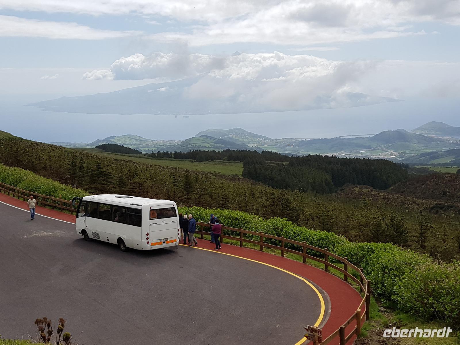 unvergleichlichen Ausblick in den riesigen Krater und auf den Vulkan Pico. Die Azoren sind voll mit riesigen Kratern. Einige mit Wasser und andere, wie hier, nicht. In 3 bis 4 Stunden kann man oberhalb vom Krater an der über 400 Meter hohen Wand am Rand entlang wandern. Da es noch April ist, ist es noch nicht wie später im Sommer, wenn alles mit blühender Fülle voller Hortensien ist. Deswegen wird sie auch die "Blaue Insel" genannt. Alice erzählt uns im Bus über Politik und Gesellschaft und sagt uns, wie die Azoren nach der Nelkenrevolution in eine