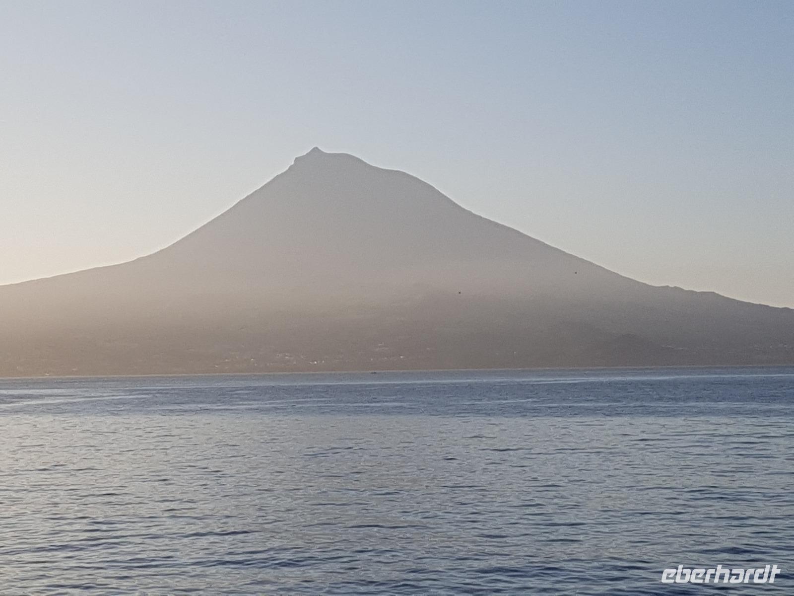 Der frühe Vogel fängt dem Wurm und schon um 7 Uhr fahren wir vom Hotel mit dem Bus zum Hafen. Aber erstmal bestaunen wir beim Frühstück einen unvergesslichen Sonnenaufgang. Gegenüber von uns der Vulkan Pico und links davon die Sonne.