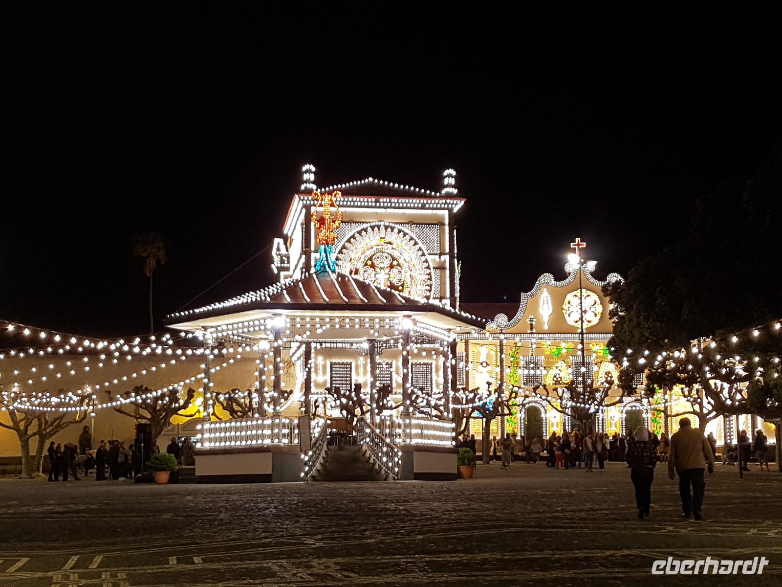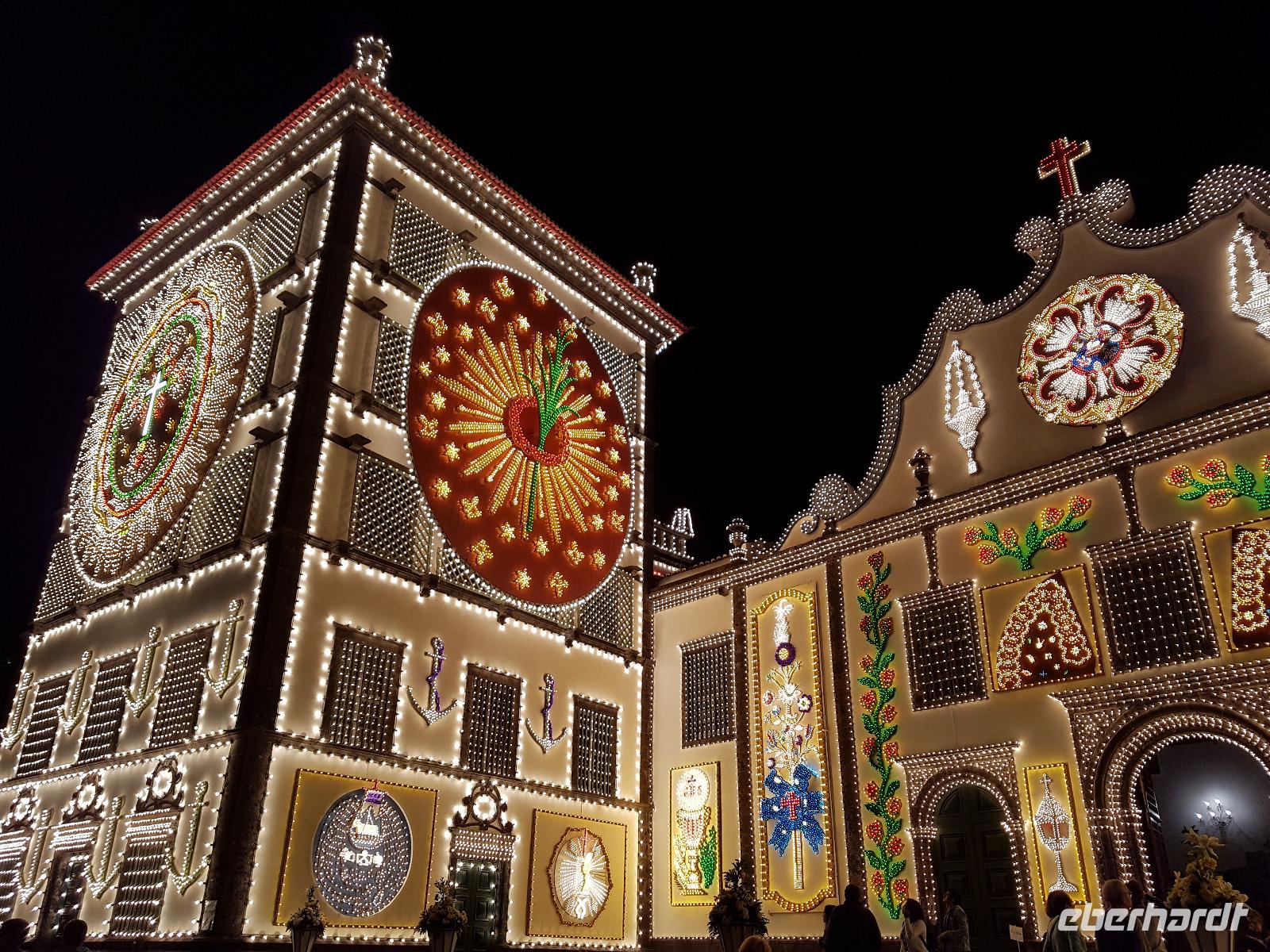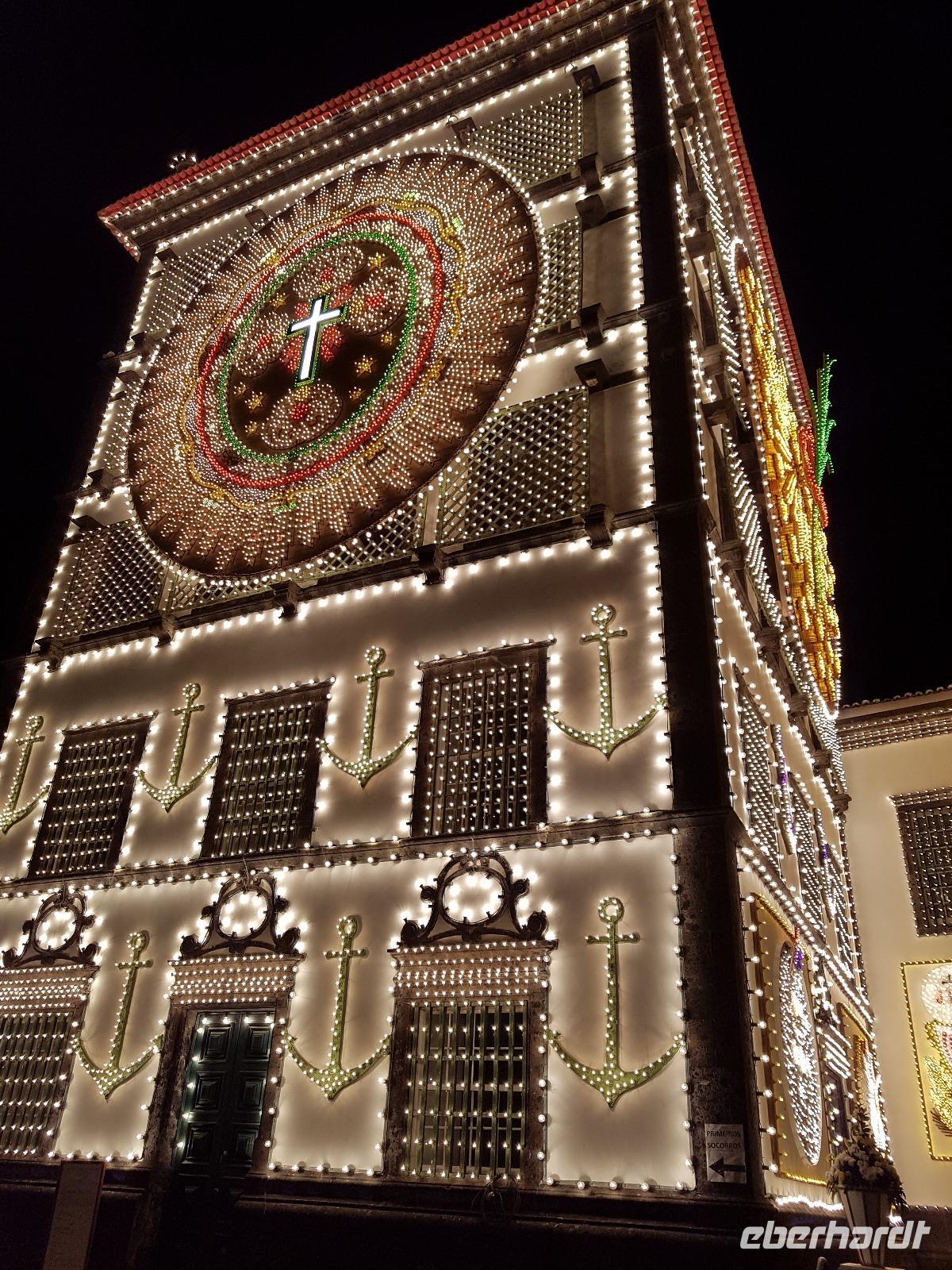 Als Abschluss und Dankeschön an die Bedienung singt Benjamin wieder ein Lied, das alle schon gut kennen. Zurück im Hotel gehen noch einige von uns in das Zentrum, da das Volksfest von Ponta Delgada immer noch läuft und man gerade am Abend die Beleuchtung der Kirche bestaunen kann, welche die Einheimischen für Christus so besonders schön