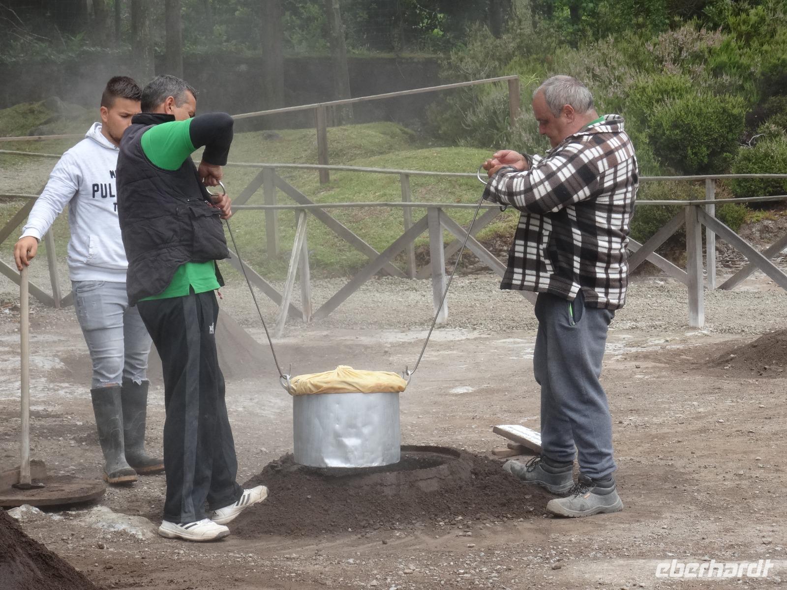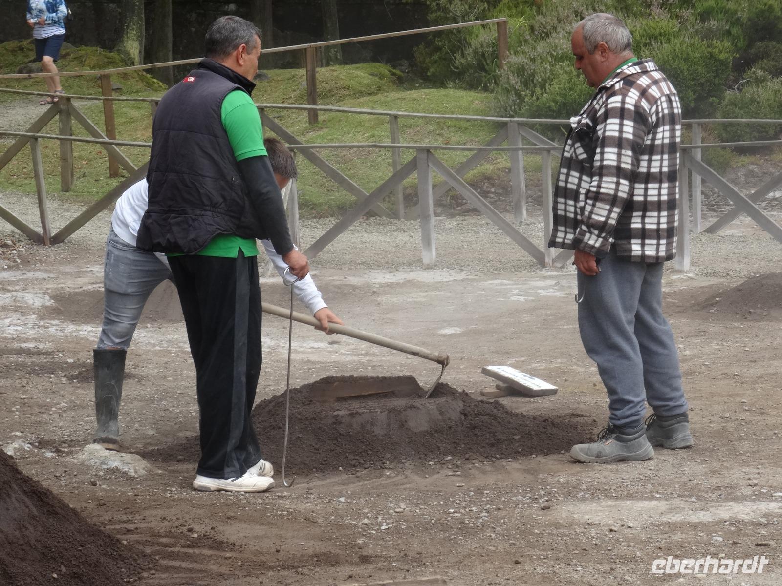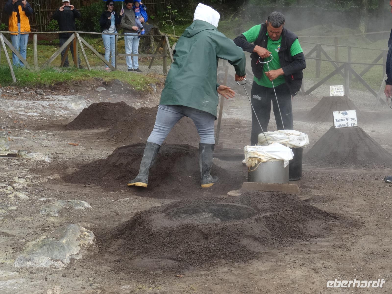Hier bot sich uns ein besonderes Schauspiel. In den hier ebenfalls sich befindenen Dampfquellen lassen die Restaurants von Furnas das Cocido (= Eintopf)-Essen sechs Stunden lang bei fast 90 Grad in der Erde erhitzen. Danach werden die 60 Kilogramm schweren Töpfe wieder ausgegraben und zu den Restaurants gebracht. Unseren Eintopf bekamen wir im "Tonys".