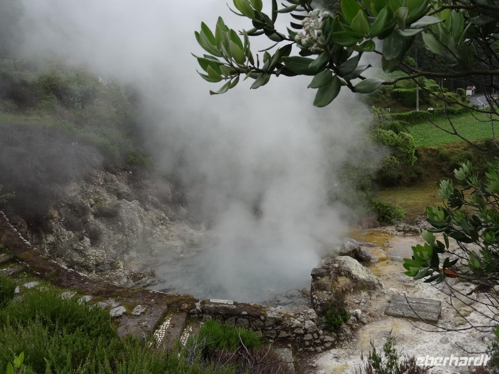 Danach sollte es zum sogenannten "Eisenberg gehen", um schon einmal einen Blick auf den Lago de Furnas zu erhalten. Doch leider spielte der hier vorherrschende Nebel nicht mit. Deshalb fuhren wir erst einmal zur Besichtigung der Caldeiras (=heißen Quellen) in Furnas - ein Hauch der Geysire auf Island wehte um unsere Nasen.