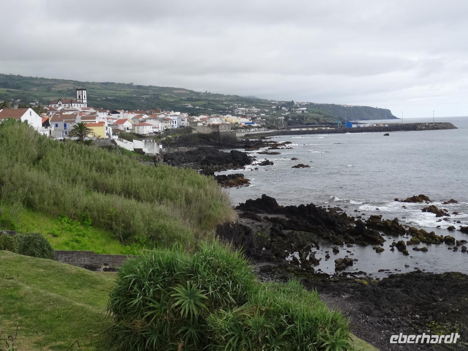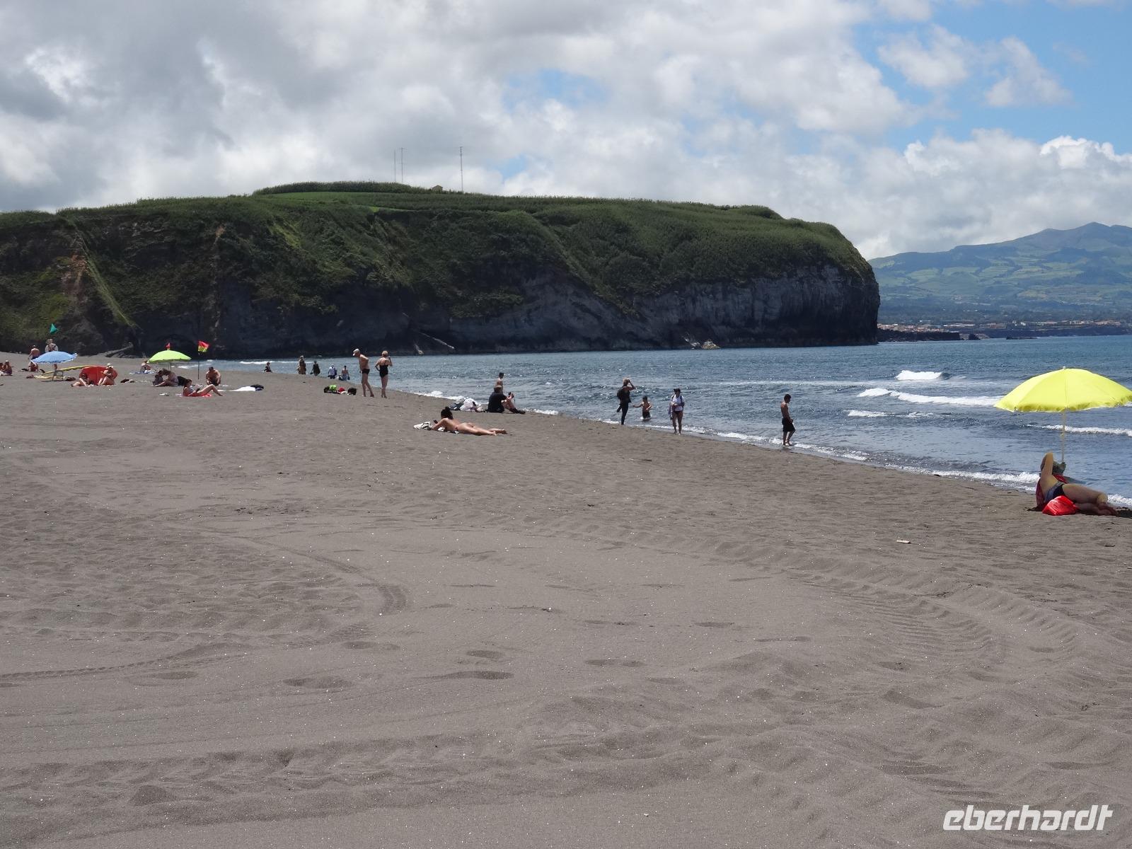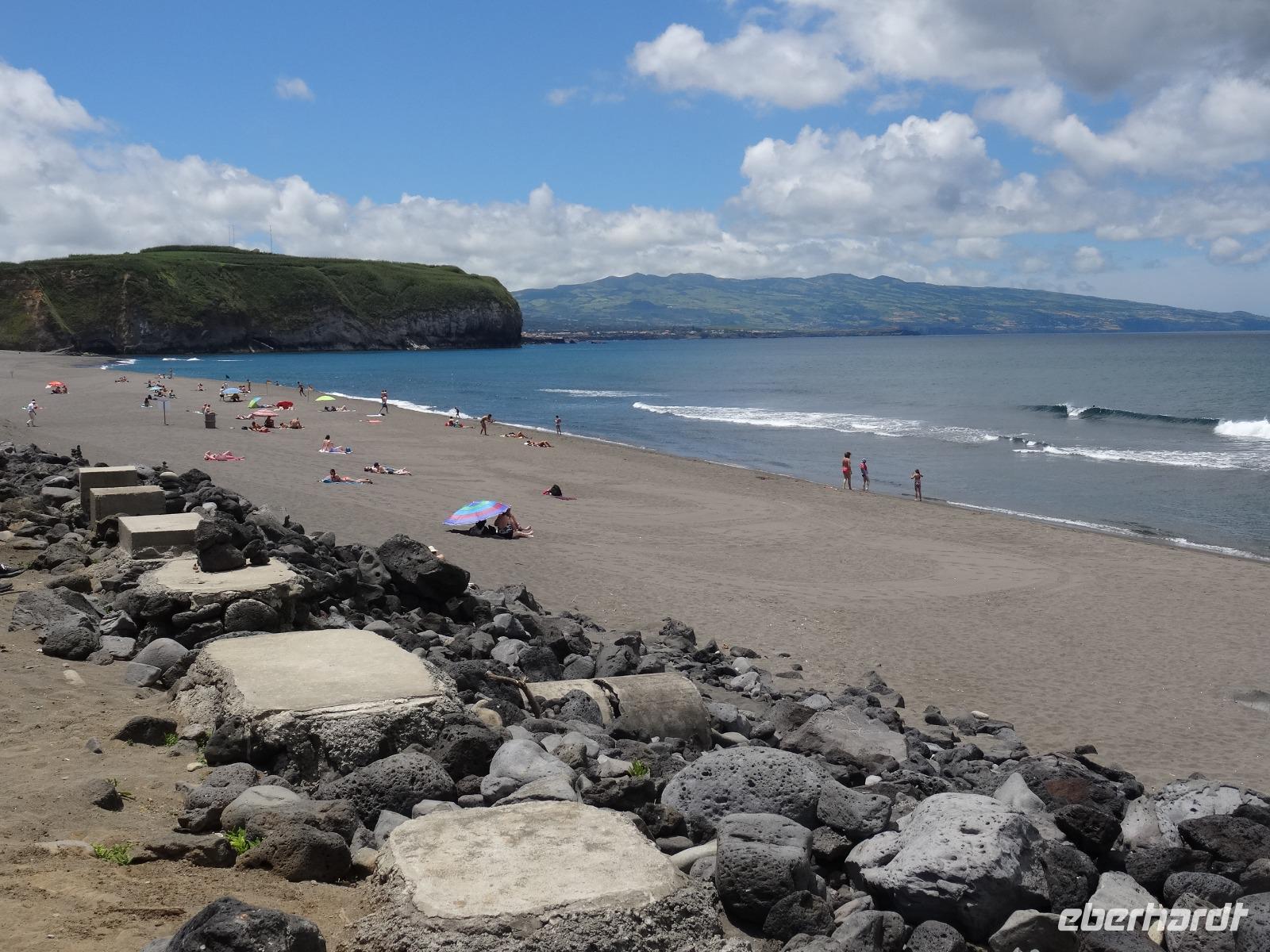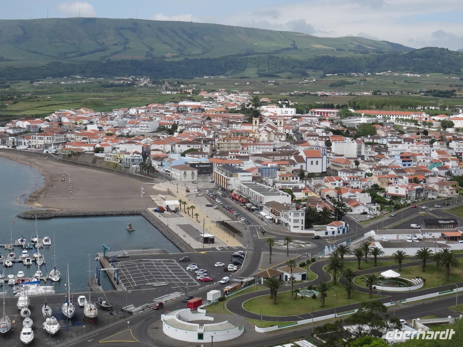 Zunächst ging es hinauf zur Landzunge Ponta de Ma Meranda für einen Blick auf den längsten Sandstrand der Azoren und die Stadt , um an der Strandpromenade(= Praia)des Ortes unsere Mittagspause zu verbringen.