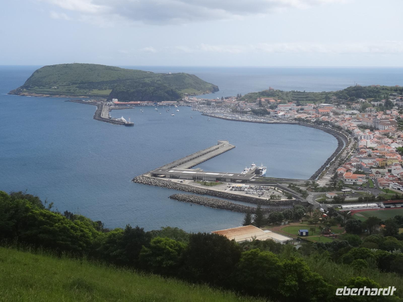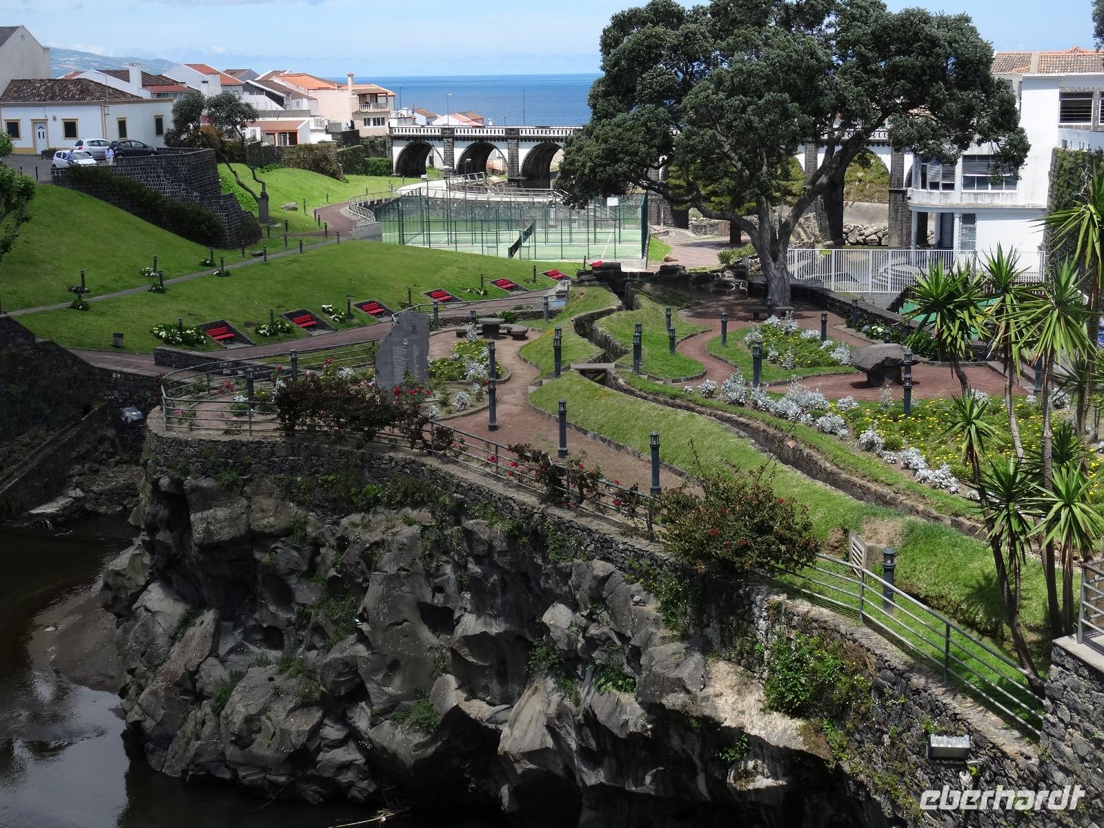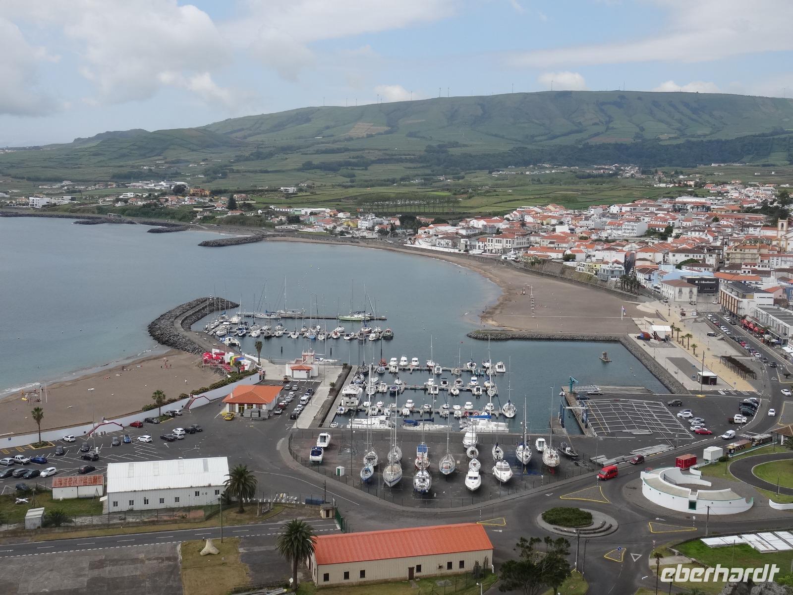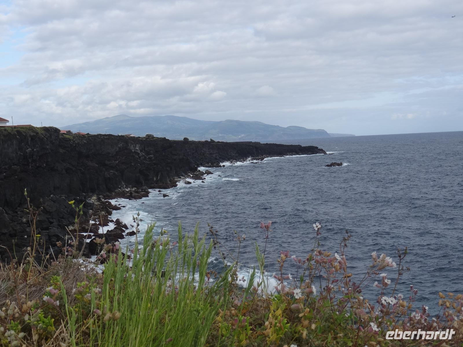 Zunächst ging es hinauf zur Landzunge Ponta de Ma Meranda für einen Blick auf den längsten Sandstrand der Azoren und die Stadt , um an der Strandpromenade(= Praia)des Ortes unsere Mittagspause zu verbringen.