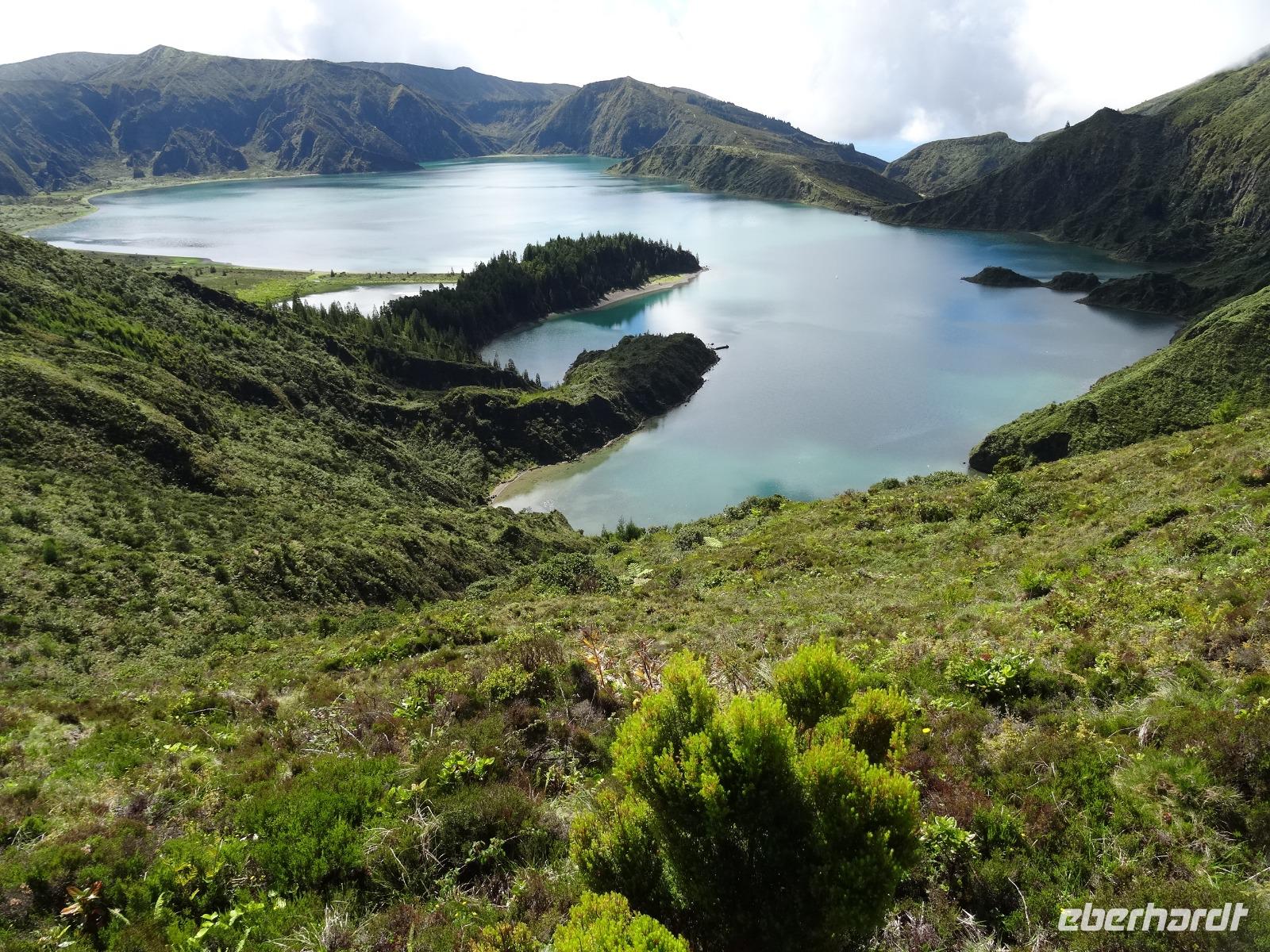 Dann fuhren wir 950 Meter hinauf auf den Pico de la Barossa. Von hier bot sich uns eine bezaubernde Aussicht auf den 300 Meter tiefer liegenden Kratersee "Lagoa do Fogo"= Feuersee. Wir konnten nicht genug von dem tollen Panorama bekommen. Deshalb legten wir gleich noch einen weiteren Fotostopp nach. Dieses Mal mit einer wieder ganz anderen herrlichen Perspektive.