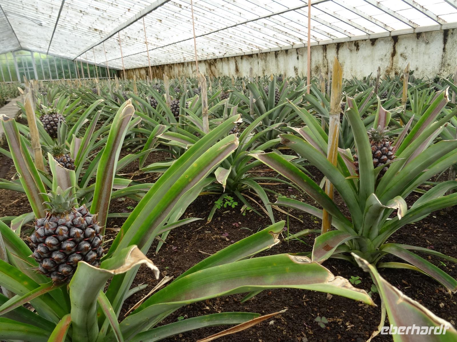 Apropos Gewächshäuser - nur hier wird die Ananas im Gewächshaus angebaut. Bis zu ihrer Ernte vergehen 18 - 24 Monate. Die Zeitspanne hängt mit dem Reifeprozess zusammen, den die Züchter steuern. Deshalb ist der Preis einer Ananas von den Azoren auch relativ hoch.