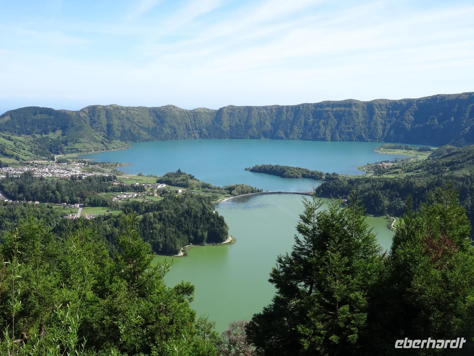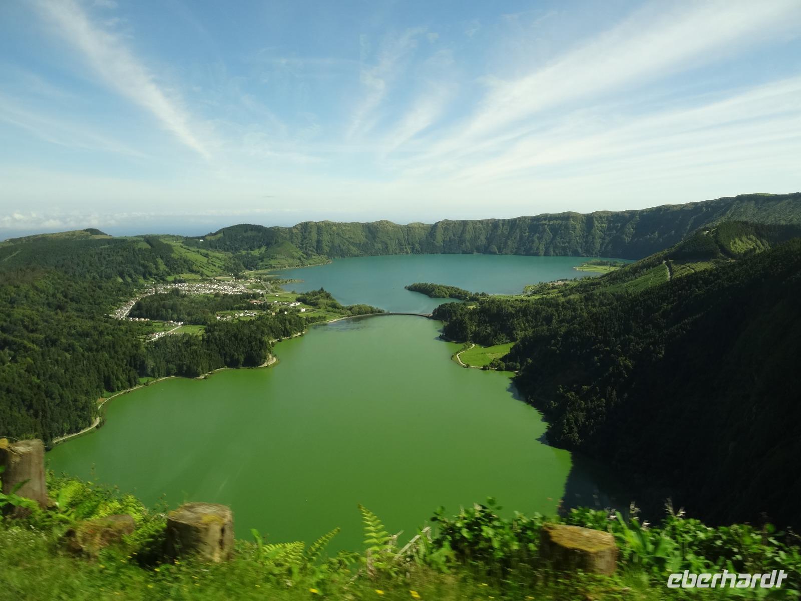 Wir genossen den phänomenalen Blick mit "Königswetter" auf die beiden Kraterseen "Lagoa Azul" und "Lagoa Verde". Sie bedeuten übersetzt "Blauer See" sowie "Grüner See", wobei unschwer zu erkennen war, weshalb sie diese Namen tragen. Das Klicken der Fotoapparate und Handys wollte kein Ende finden. Doch die "Show must go on" und Sete Cidades wartete bereits auf uns.