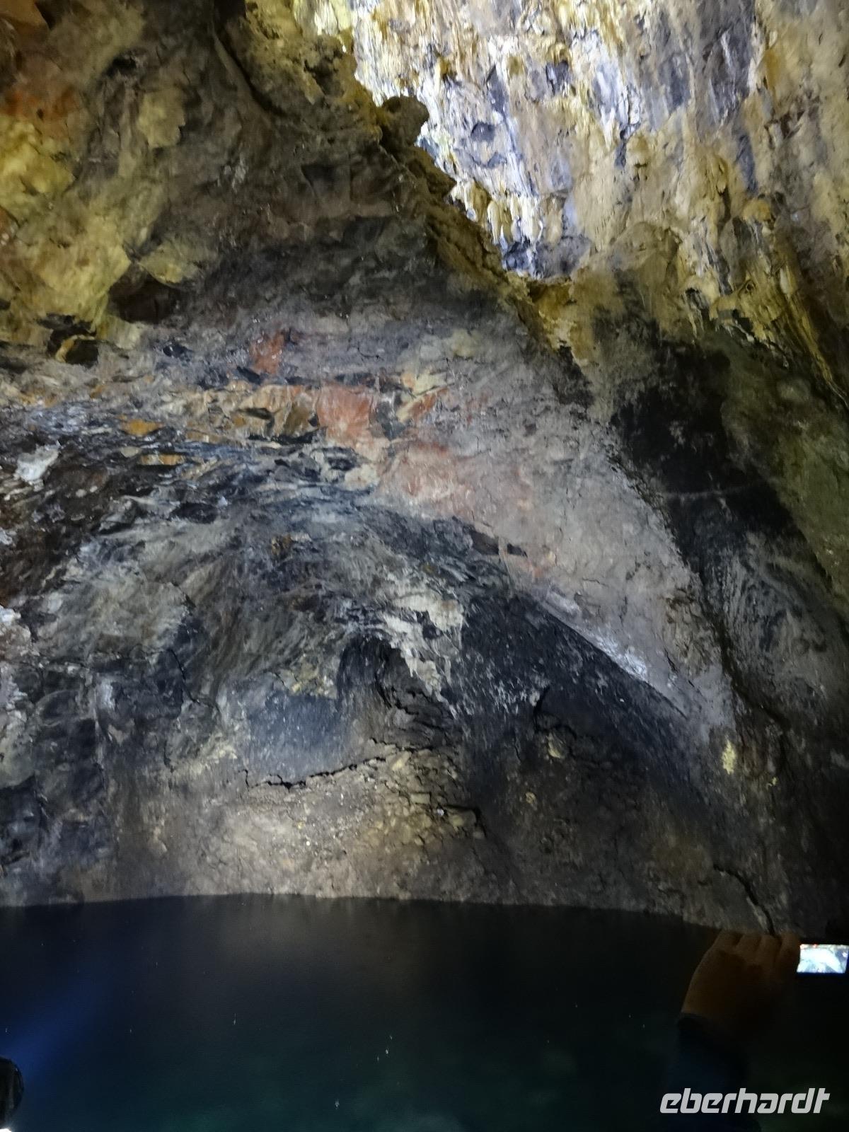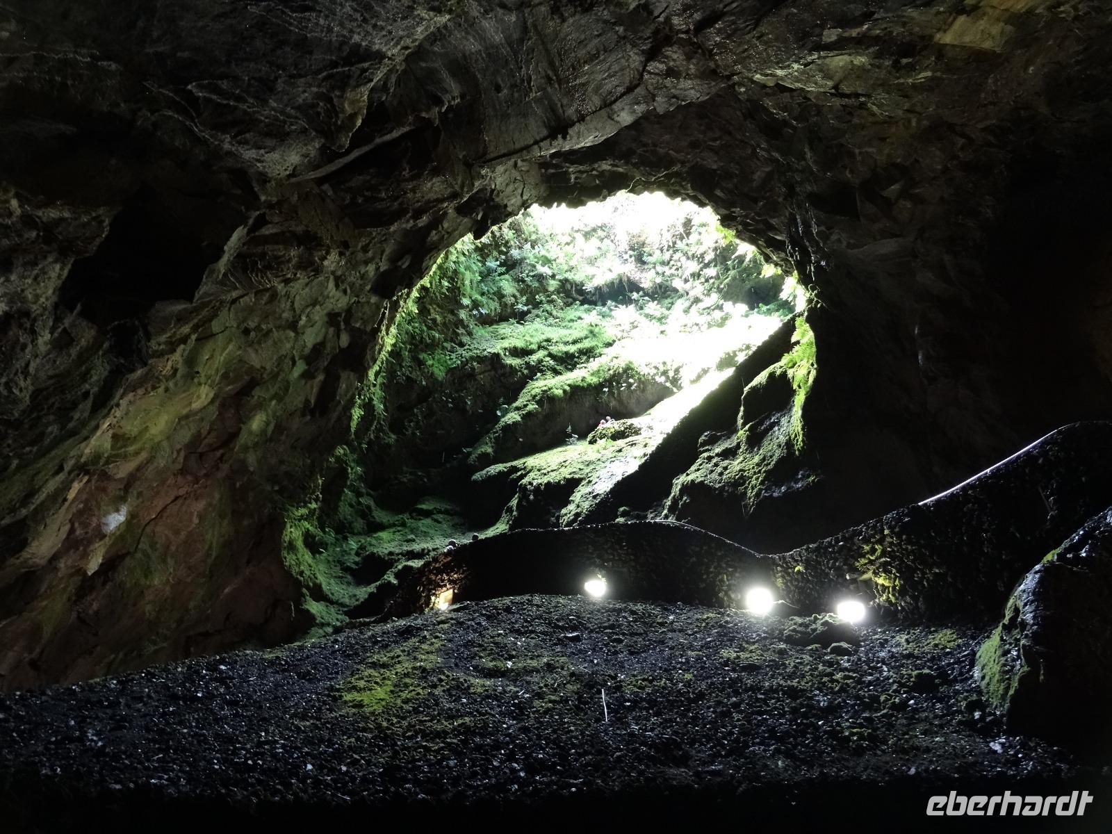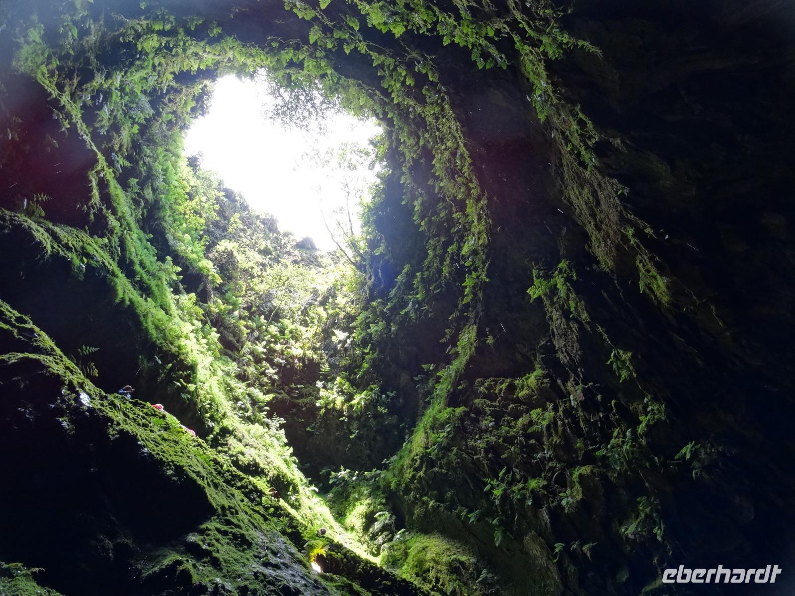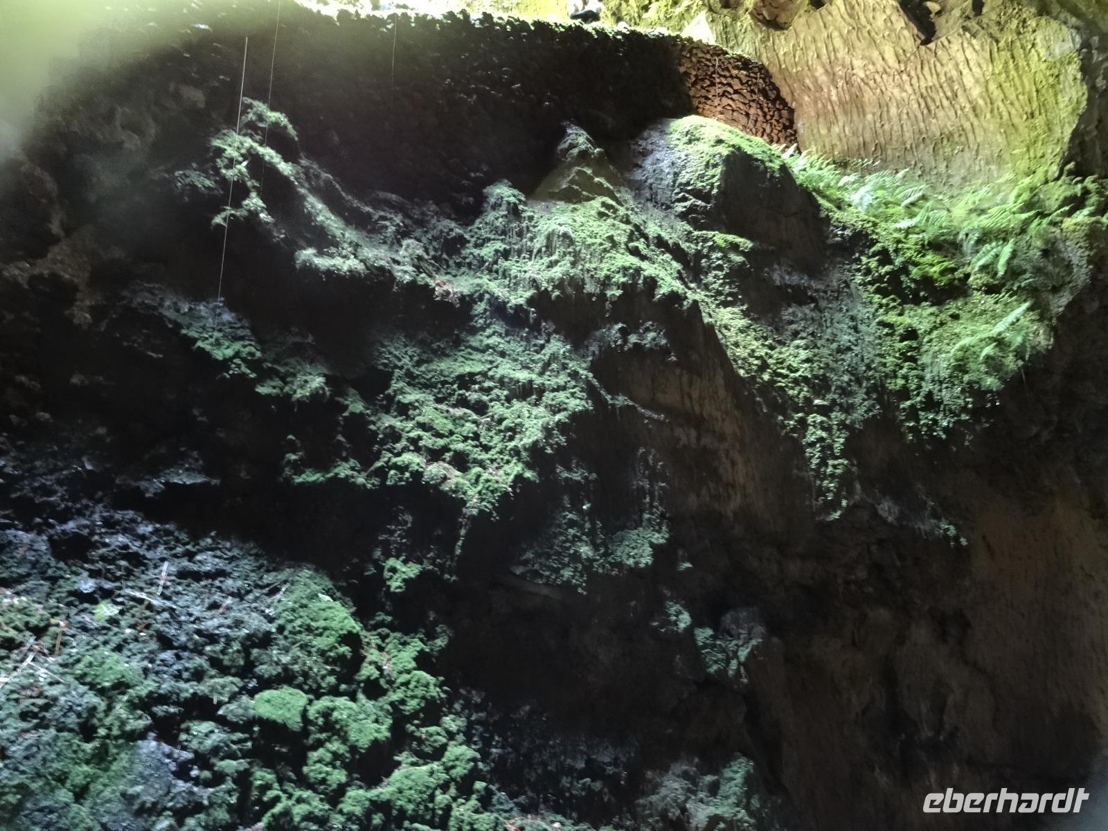 Gut gestärkt fuhren wir nun in das Innere der Insel zur wohl bekanntesten und eindruckvollsten Vulkanhöhle des Arichipels - Algar do Carvao. Die Höhle ist 100 Meter tief und ca 2000 Jahre alt. Über Treppen steigt man durch den Förderschlot eines erloschenen Vulkans in die Tiefe hinab bis zu einem kleinen See und dann wieder hinauf an das Tageslicht.