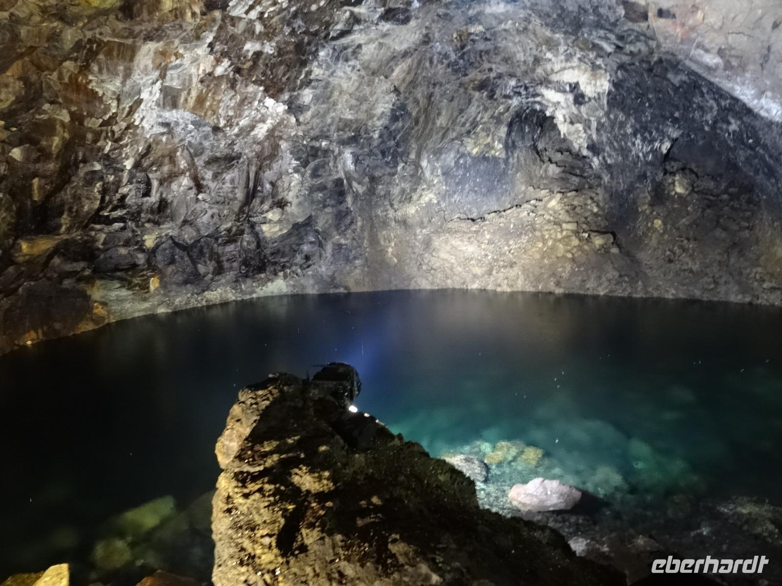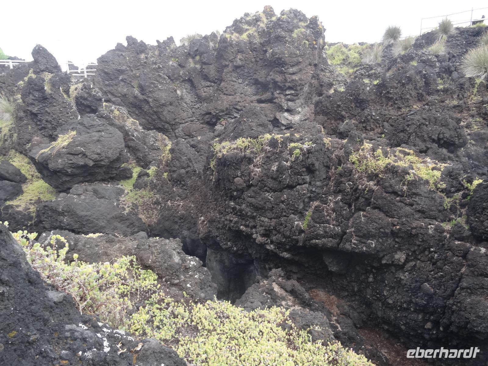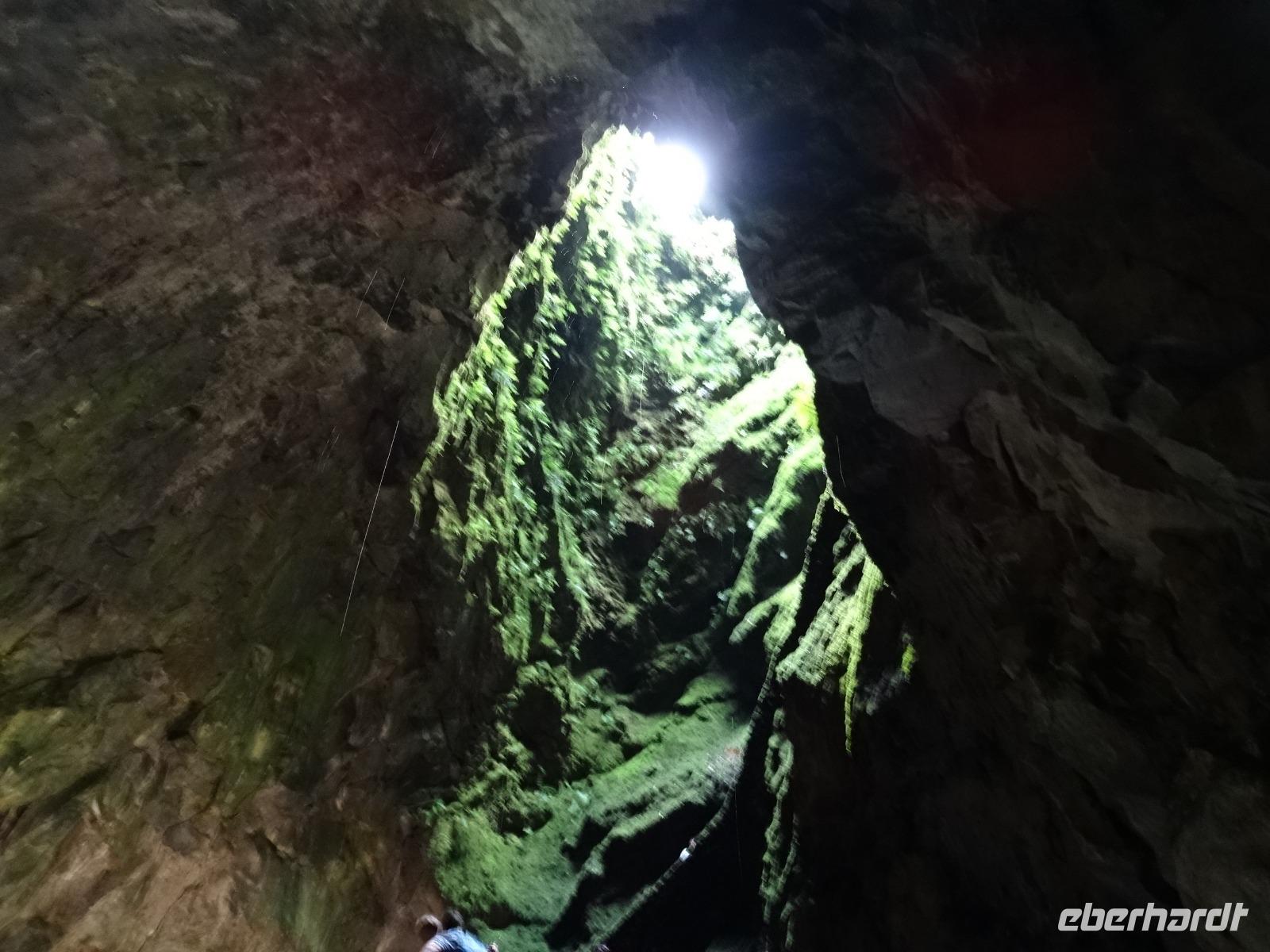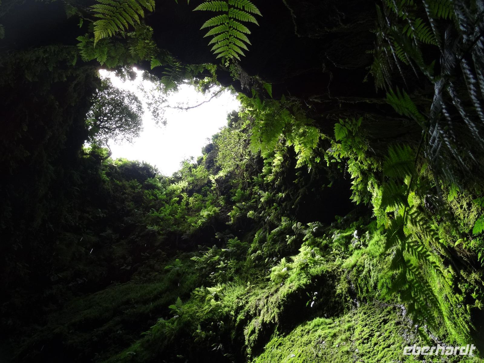 Gut gestärkt fuhren wir nun in das Innere der Insel zur wohl bekanntesten und eindruckvollsten Vulkanhöhle des Arichipels - Algar do Carvao. Die Höhle ist 100 Meter tief und ca 2000 Jahre alt. Über Treppen steigt man durch den Förderschlot eines erloschenen Vulkans in die Tiefe hinab bis zu einem kleinen See und dann wieder hinauf an das Tageslicht.