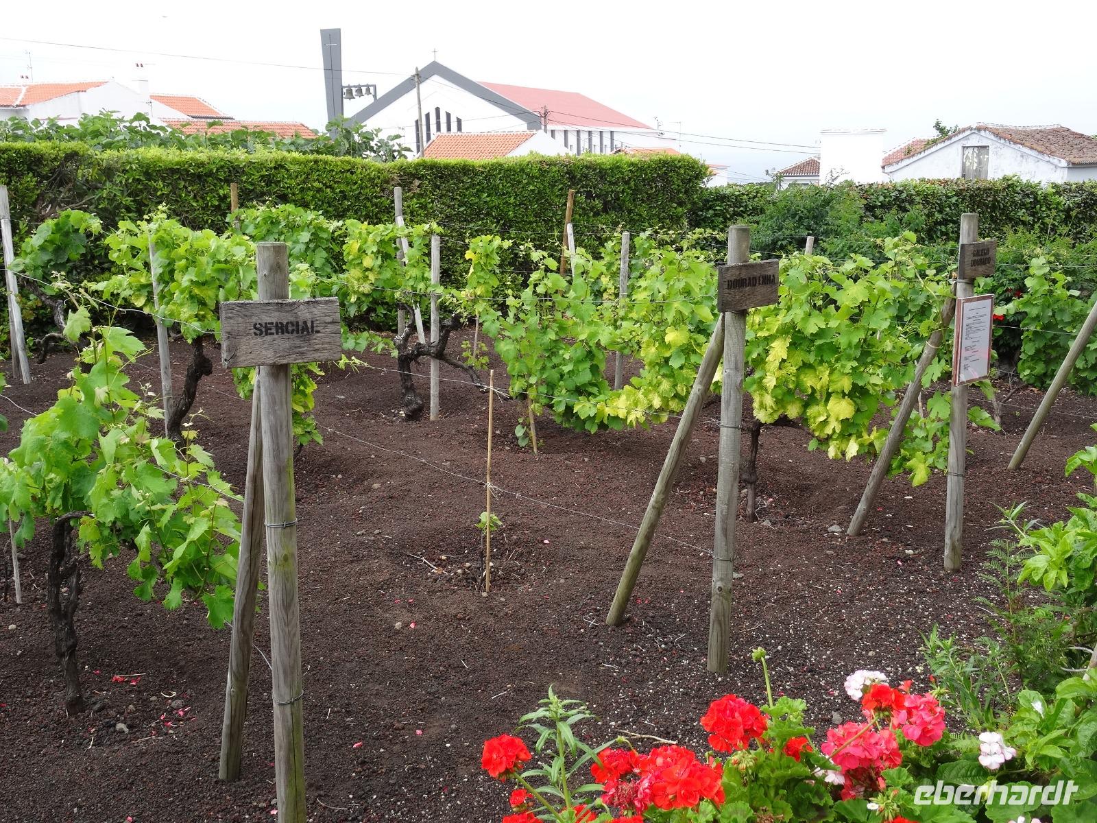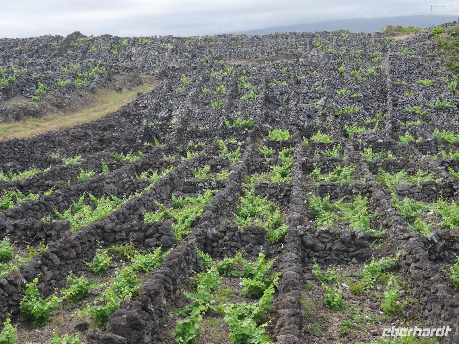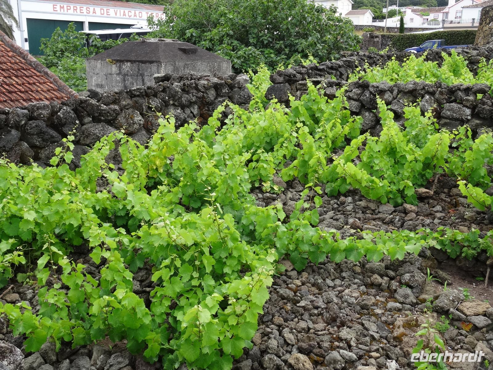 Je mehr wir uns wieder Madalena näherten, um so mehr Weinfelder sahen wir. Wir befanden uns im größten Weinanbaugebiet, das nach dem Ausbruch des Pico's im 18. Jahrhundert entstanden war. Überall schützten rechteckige Becken aus Lavagestein die Weinstöcke. Wenn man alle Steine dieser kleinen Mauern aneinanderreihen würde, könnte man dreimal die Erde umspannen.