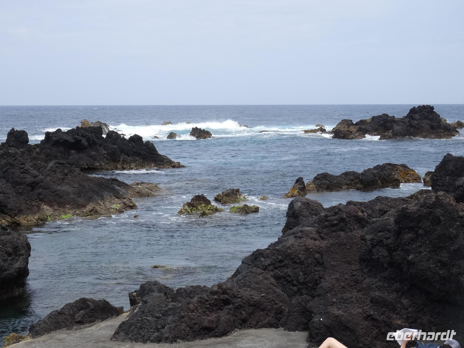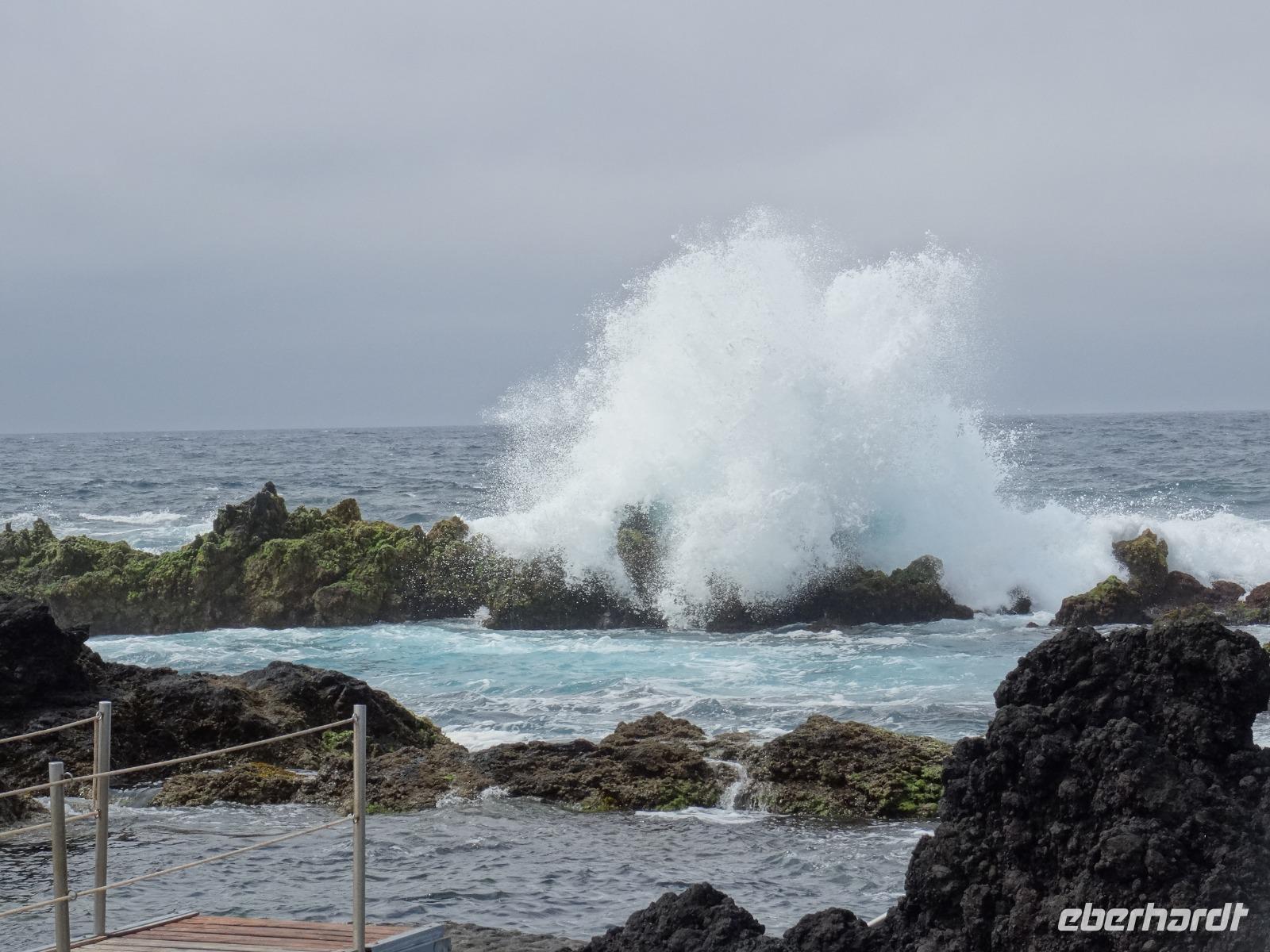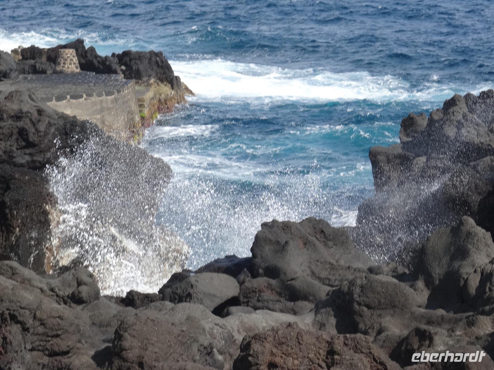 Nun hieß es wieder "Vamos a la Playa" und die meisten von uns gingen im wahrsten Sinne des Wortes am "Vulkansteinstrand" in den Lavabecken baden. Das Wasser war zwar recht frisch - doch ein einmaliges Erlebnis. Nicht weniger toll war, am Strand den Kampf des Meeres mit dem Lavagestein zu beobachten. Immer wieder schlugen die Wellen mit brechender Gewalt auf die Felsen - ein faszinierendes Naturschauspiel. Davon konnte man nicht genug sehen und alle wollten es wenigstens als Foto mit nach Hause nehmen.