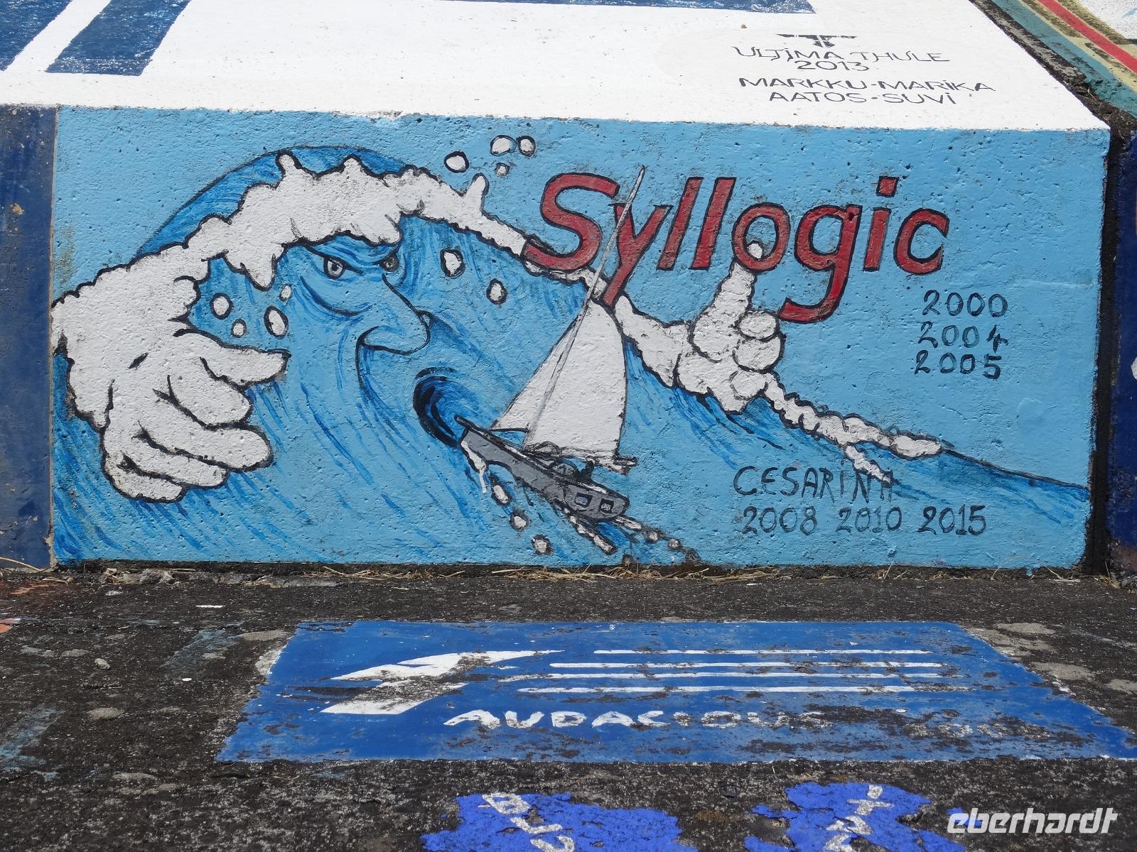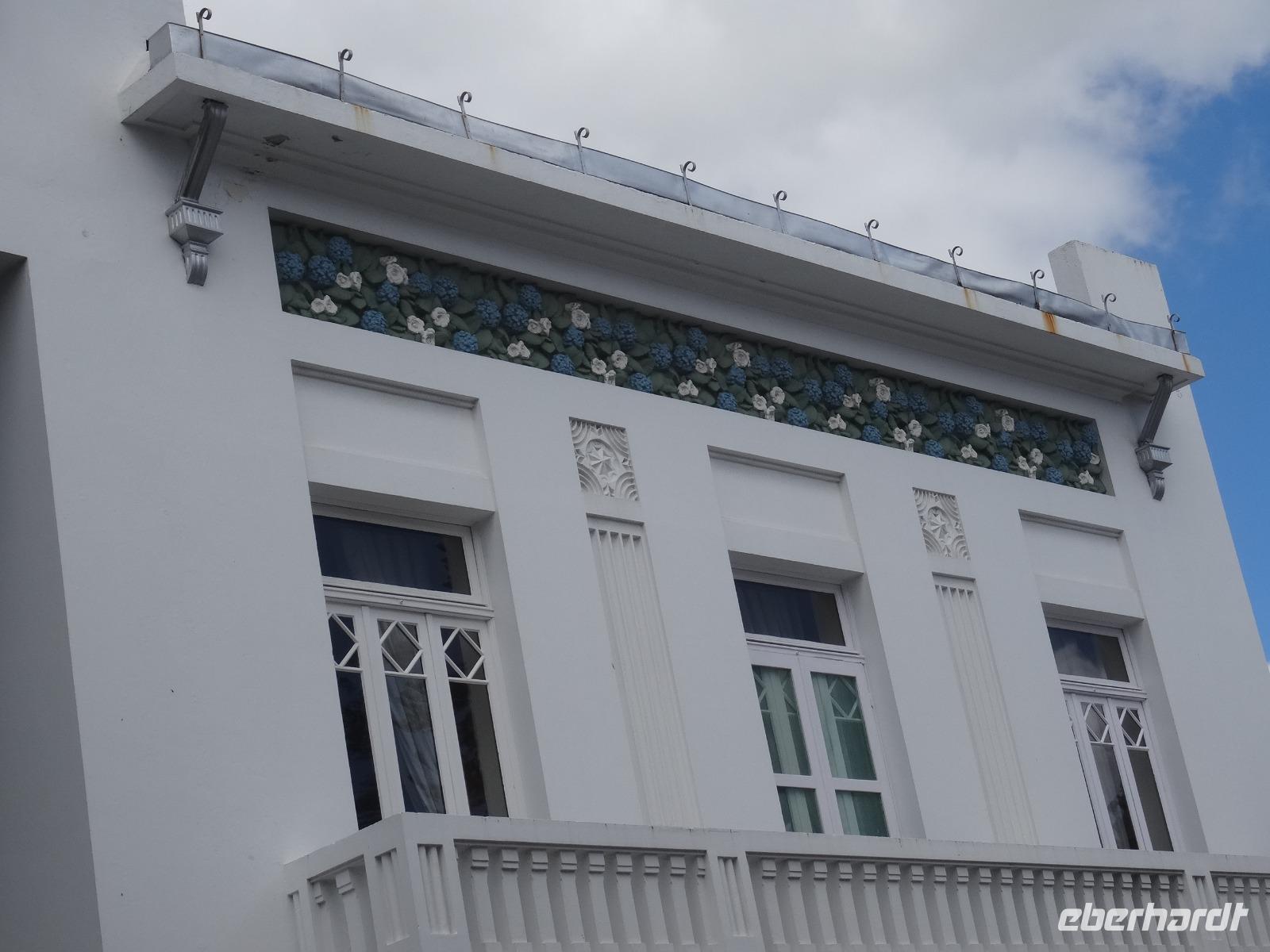 Zunächst liefen wir zur deutschen Kolonie = den herrlichen Häusern der Deutsch- Atlantischen Telefongesellschaft(DAT). Es sind die einzigen Häuser auf der Insel, welche farbige Glasscheiben besitzen. Vorbei am Franziskaner-Kloster spazierten wir weiter Richtung Hauptkirche von Horta. Immer wieder blieben wir stehen und bewunderten Details an den einzelnen Bauten, wie einen Türklopfer oder die in Handarbeit gefertigten Verzierungen an den einzelnen Basaltfassaden. Im Stadtmuseum von Horta erhielten wir einen ganz neuen Einblick in das Leben des Ortes. Vorbei am Platz der Republik mit blühenden Florettseidenbäumen und einem beeindruckenden neuseeländischen Weihnachtsbaum, kurzem Stopp in der Markthalle, erreichten wir den Jachthafen mit einer Vielzahl von Segelbooten. Dabei entdeckten wir auch die zahlreichen Bilder an den Hafenwänden, auf welchen sich Segler aus aller Welt verewigt hatten. Unser Rundgang endete in Peters Cafe Sport, wo wir uns stärkten und -der Tradition folgend- mit einem Glas Gin-Tonic auf unsere wunderschönen Tage auf Faial sowie Pico anstießen. Jetzt zeigte sich sogar der Pico noch einmal in seiner vollsten Pracht.