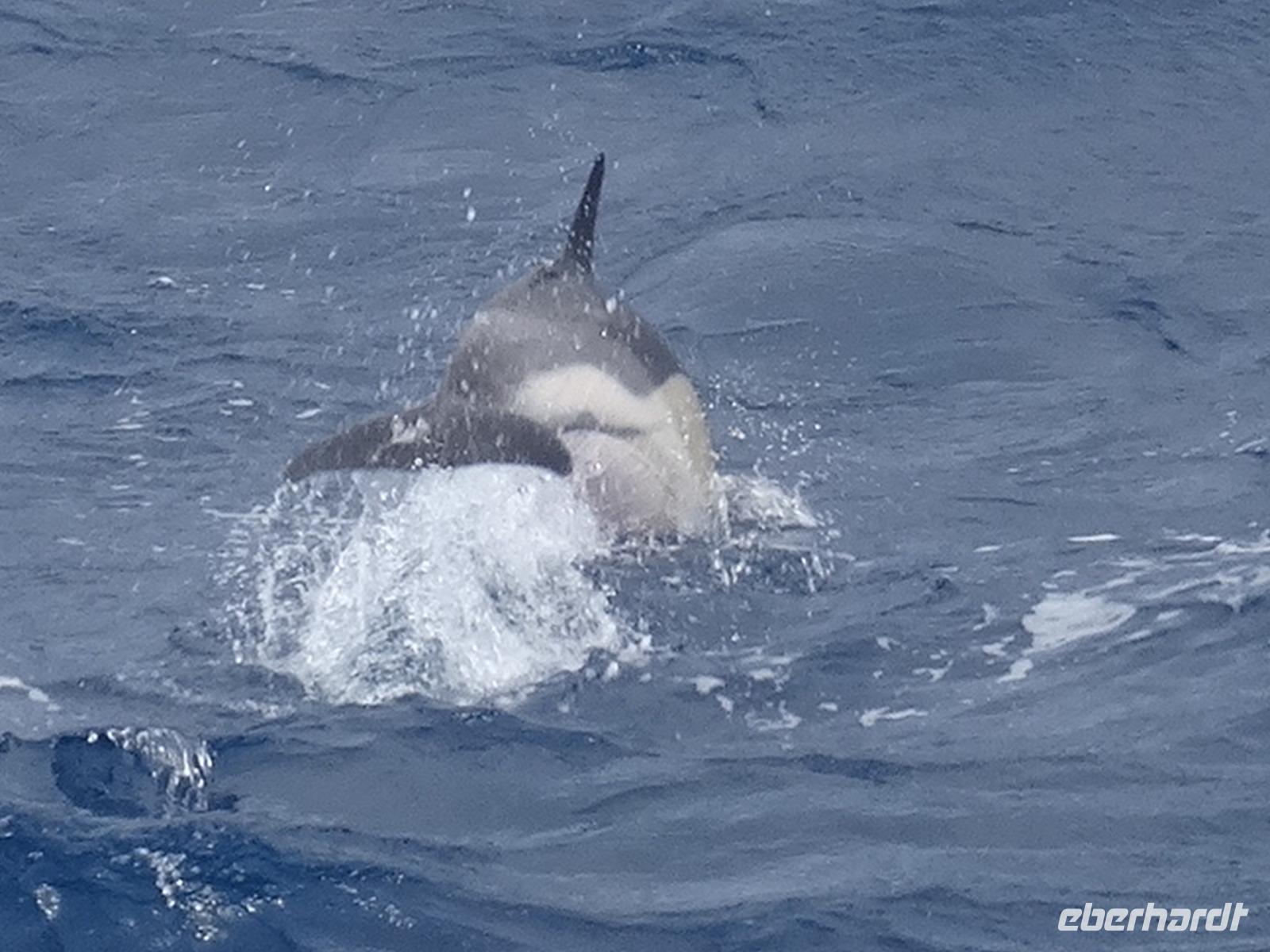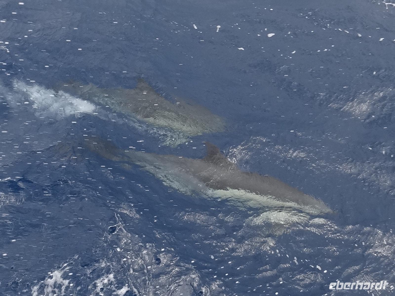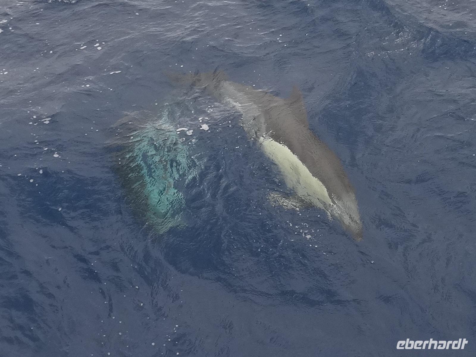 Als erstes sahen wir Delfine. Erstaunlich nah kamen sie an unser Schiff heran und tauchten rasend schnell darunter weg. Schon kurze Zeit später konnten wir einen Pottwal mit seinem typischen Blasen erkennen. Dann sahen wir Schlauchboote am Horizont, die darauf hinwiesen, dass Wale in der Nähe sind. Also auf zur neuen "Fundstelle" und so weiter...