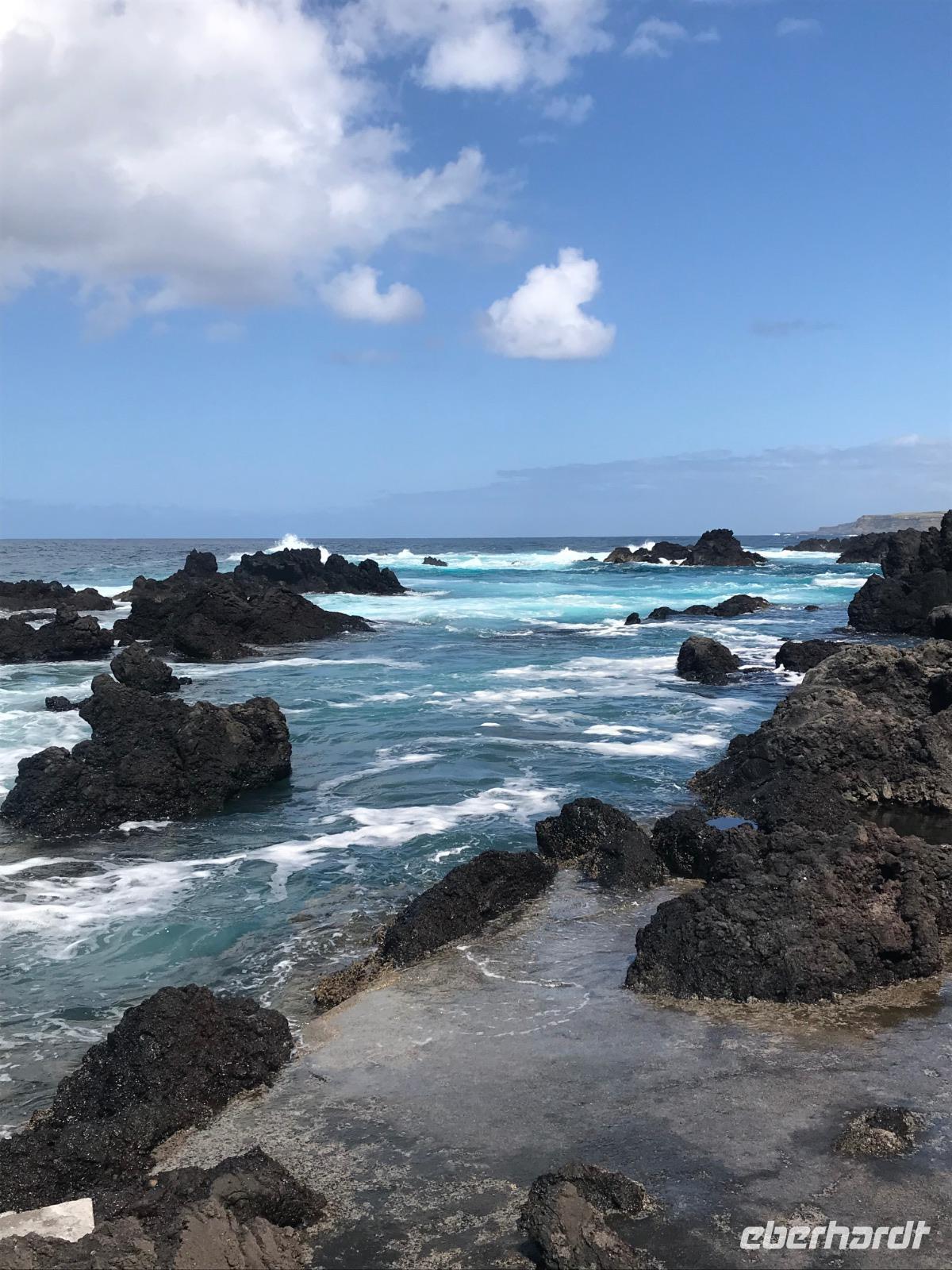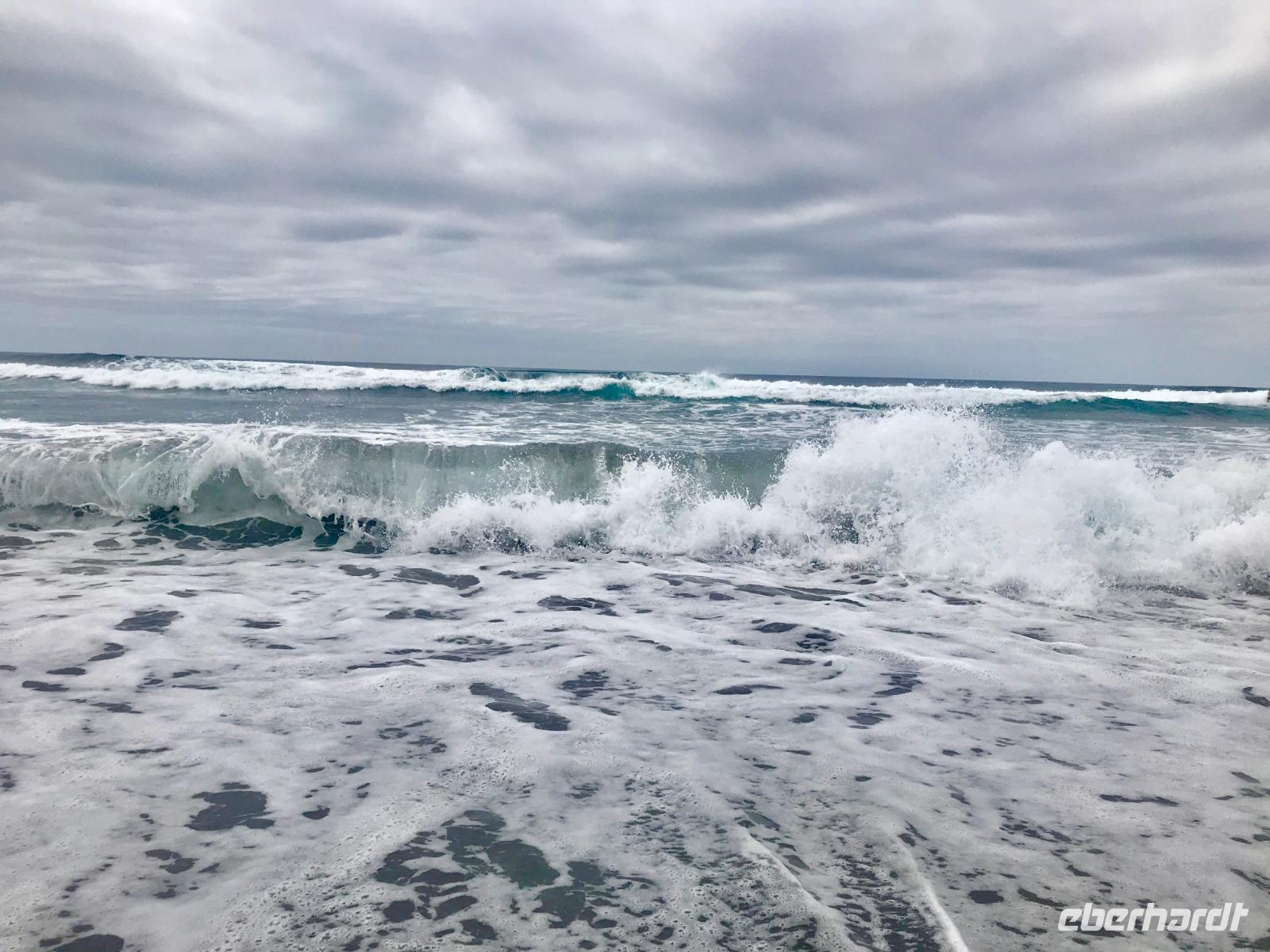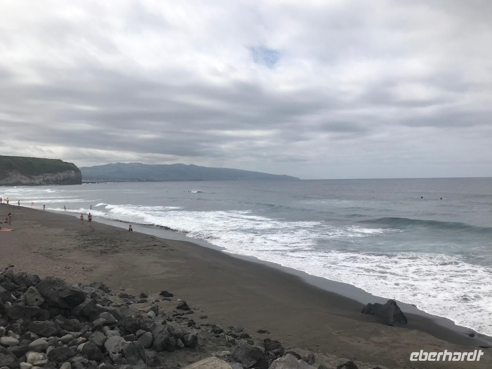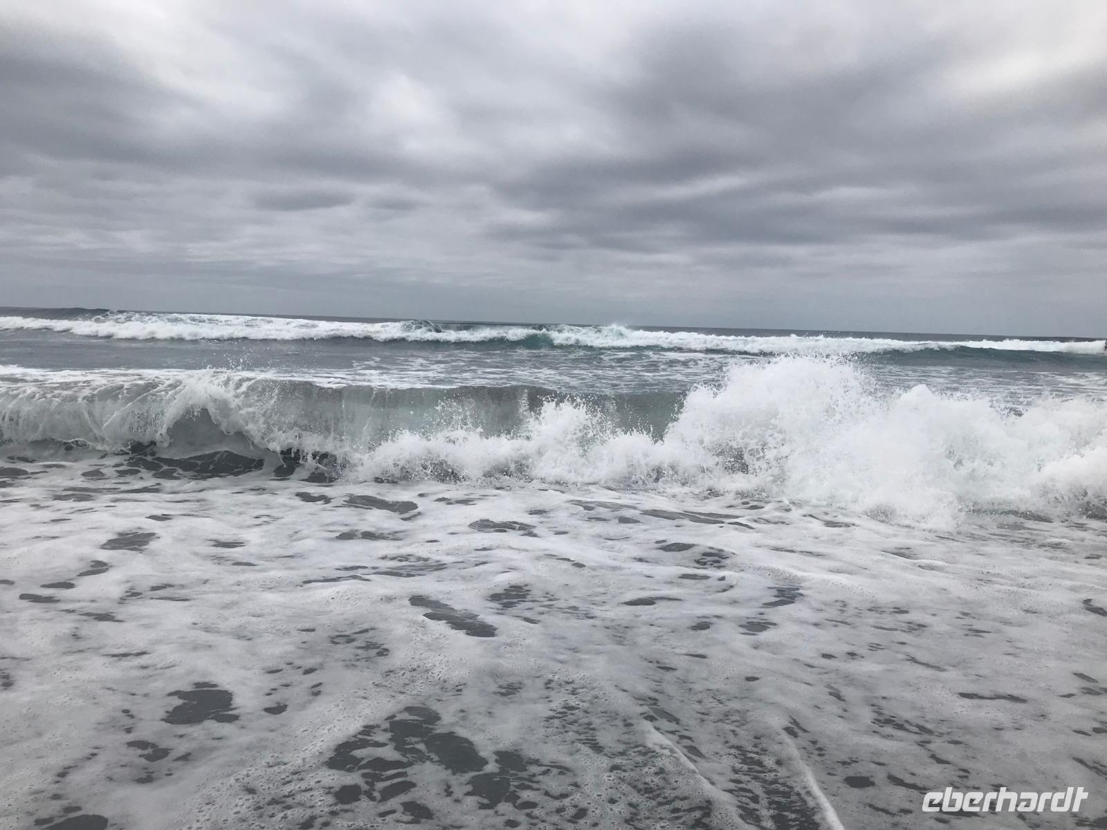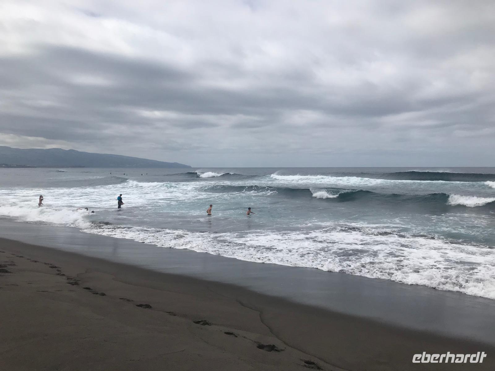 Wir hatten uns genug Mut angetrunken um nun an den schwarzen Sandstrand zu fahren und einen Sprung in die Fluten zu wagen. Fluten beschreibt es gut, denn es waren ordentliche Wellen und der Respekt vor den Naturgewalten erlaubte uns nur wenige Meter ins Meer zu gehen oder zu schwimmen. Es war ein traumhaftes Erlebnis bei 23 Grad im Atlantik!