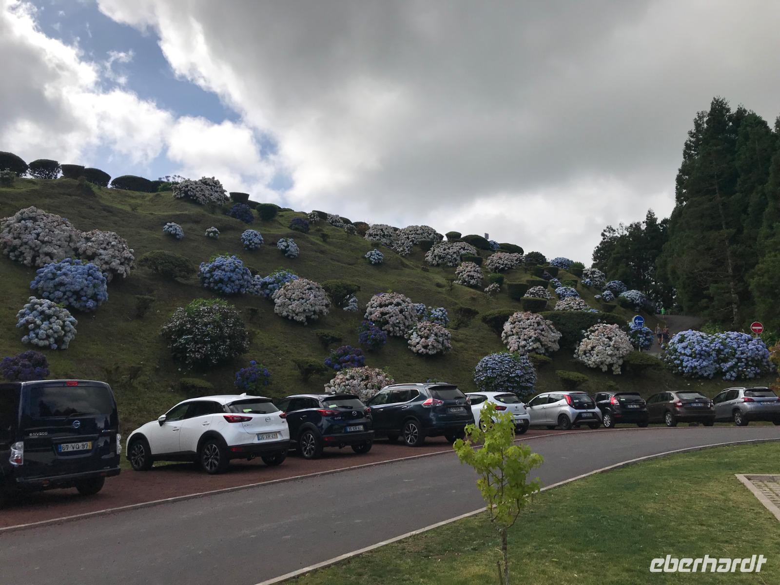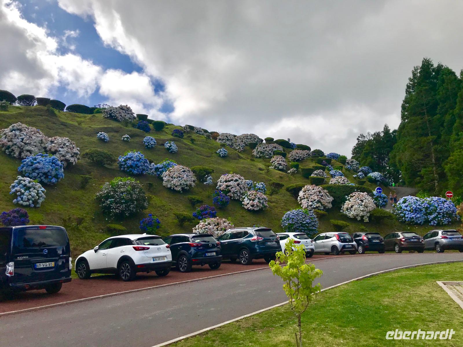 Bei der Weiterfahrt nach Furnas bestaunten wir die riesigen verschiedenfarbigen Hortensien und den falschen Ingwer. Bei Furnas gab es einen See zu bewundern und die besondere Art zu kochen. Der aus der Erde aufsteigende Heißdampf wird dabei ausgenutzt. Man gräbt Löcher in die Erde und gibt darein das Gargut in Töpfen und zwar so verteilt, dass welches am längsten kochen müsste nach ganz bunten in die heißeste Zone kommt und so wir alles gleichzeitig fertig. Wir konnten beobachten, wie die Mitarbeiter unseres Restaurantes das Essen aus den Löchern abholten. Mit gutem Appetit widmeten wir uns anschließend der vielfältigen Speisen dem „Cozido das Furnas" bei gutem Wein. In Deutschland kauft man dazu einen Heißumluftofen zumeist von Rational für eine 5stellige €-Summe.
