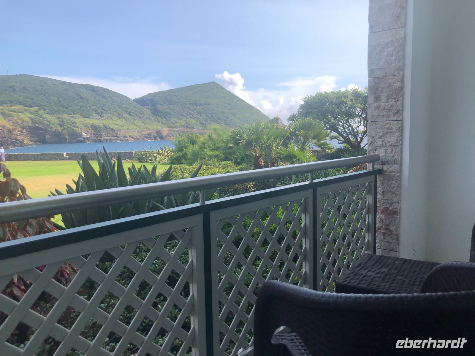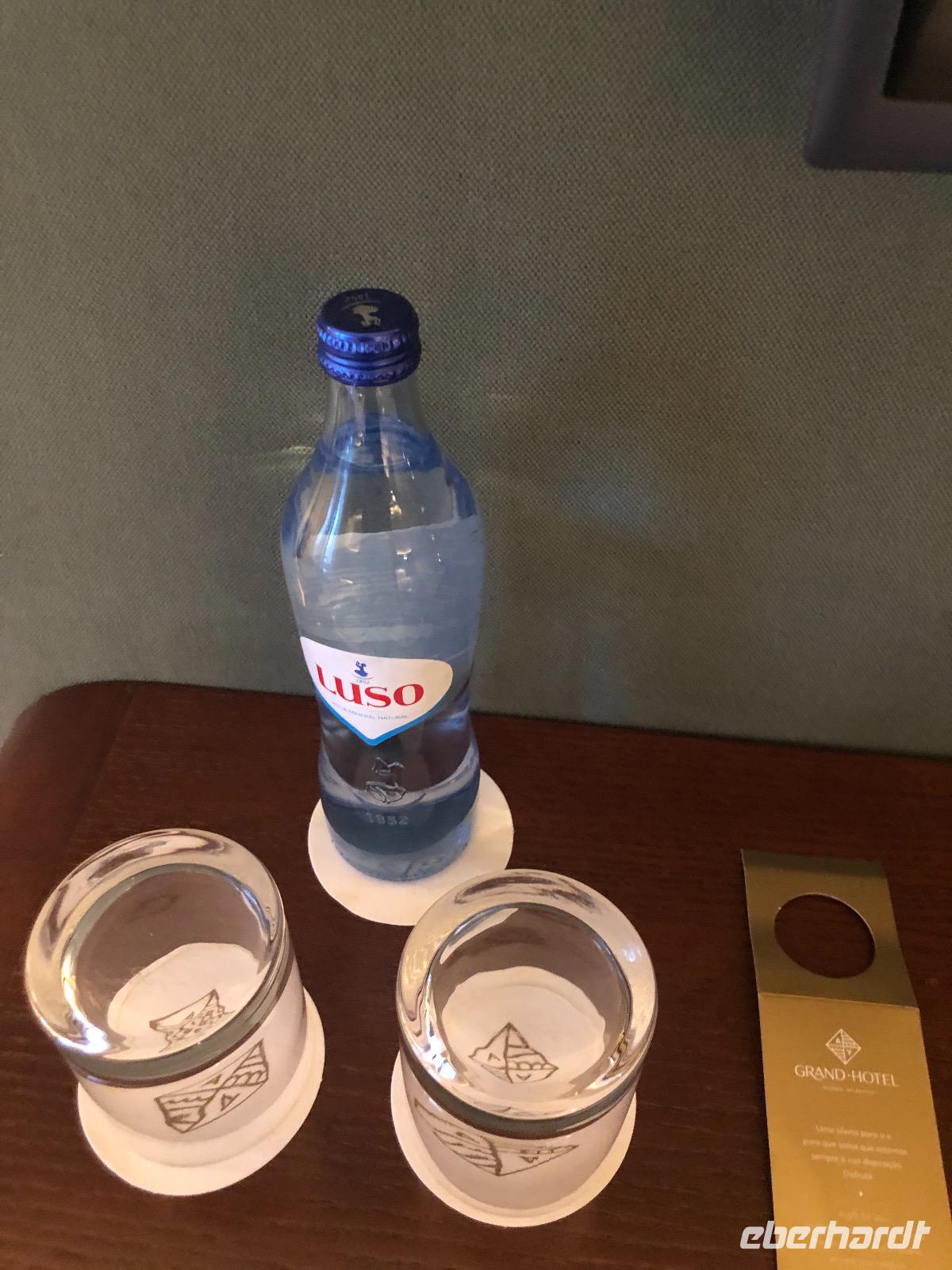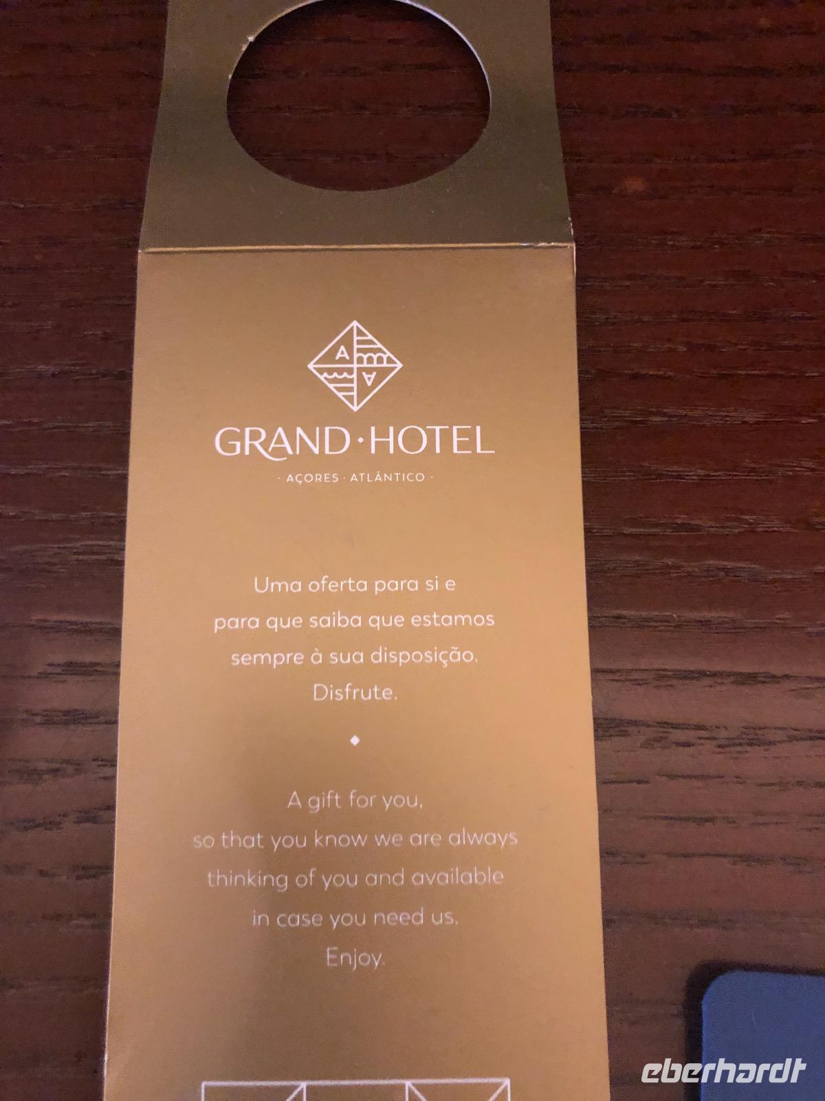 Wir wurden umgebucht. Von 4 auf 5 Sterne. Das wussten wir im Voraus und hatten auch nichts dagegen. Wie der Name schon sagt, ist das Grand Hotel ein großes Hotel. Die Frontseite liegt parallel zum Meer und vom Balkon haben wir eine fantastische Aussicht. Die Zimmer sind geräumig und gemütlich eingerichtet. Zwei Doppelbetten mit dicken Decken, die auch bei minus 20 Grad warmhalten dürften. Darauf zwei dicke weiße Bademäntel und ein Betthupferl. Eine Flasche Mineralwasser (still) geschenkt. Im Bad große weiße Badetücher und diverse andere Handtücher. Kosmetikartikel, wie Shampoo und Duschgel gibt es selbstverständlich auch. Ebenso eine kleine Minibar, einen Schreibtisch und einen großen Flachbildfernseher. Käuflich erwerben kann man azorentypische Likörspezialitäten im Röhrchen – Ananas, Physalis, Tangerine und Blackberry (a 7,- €).