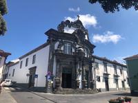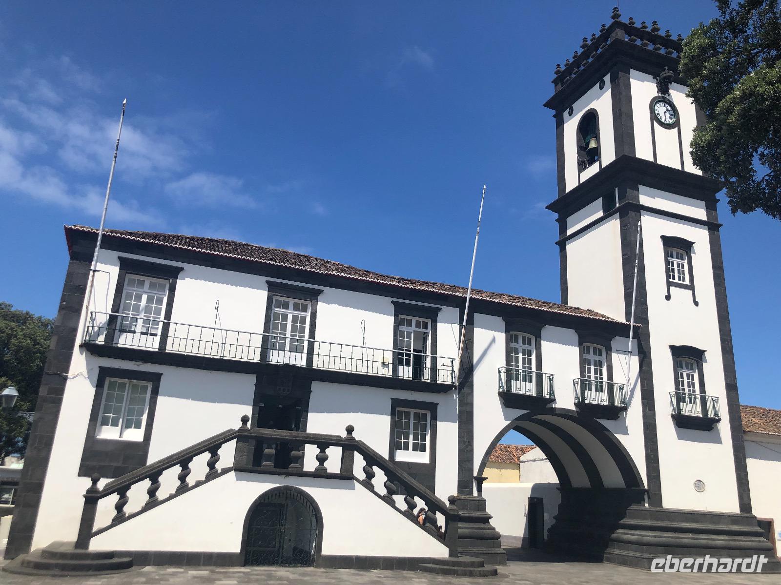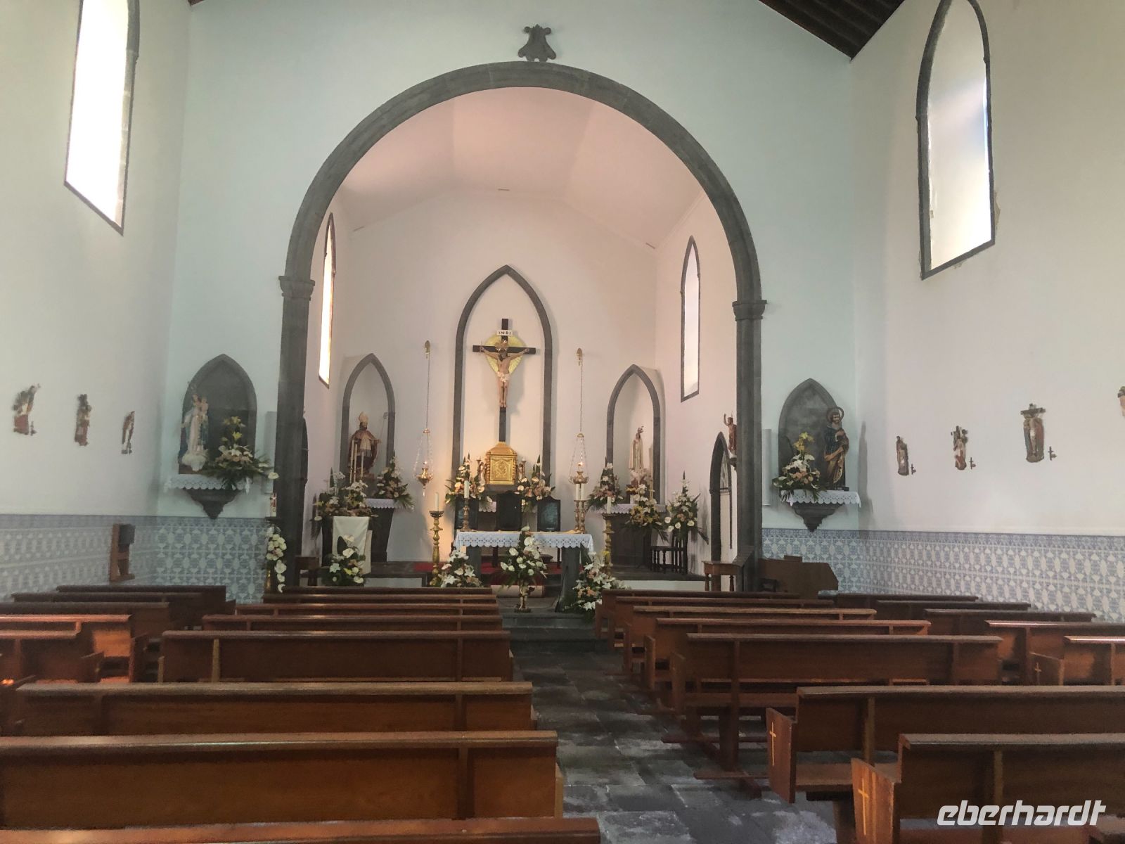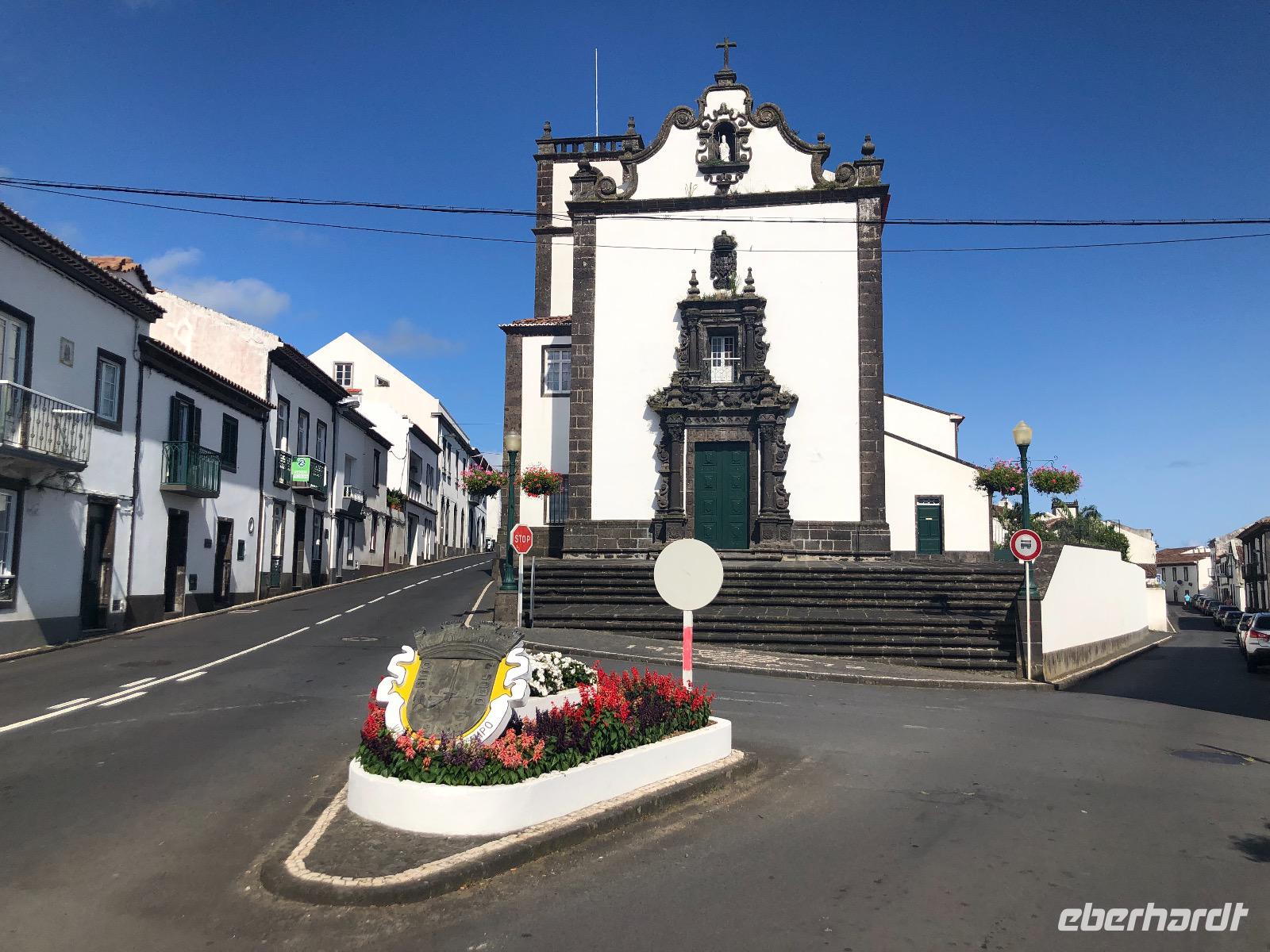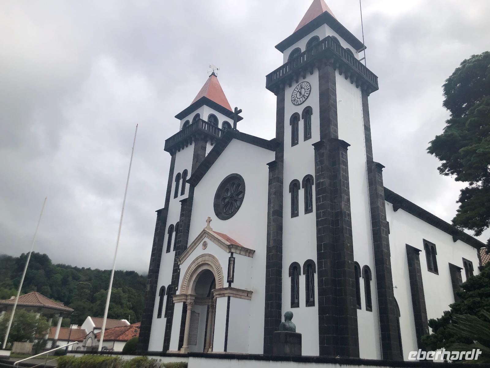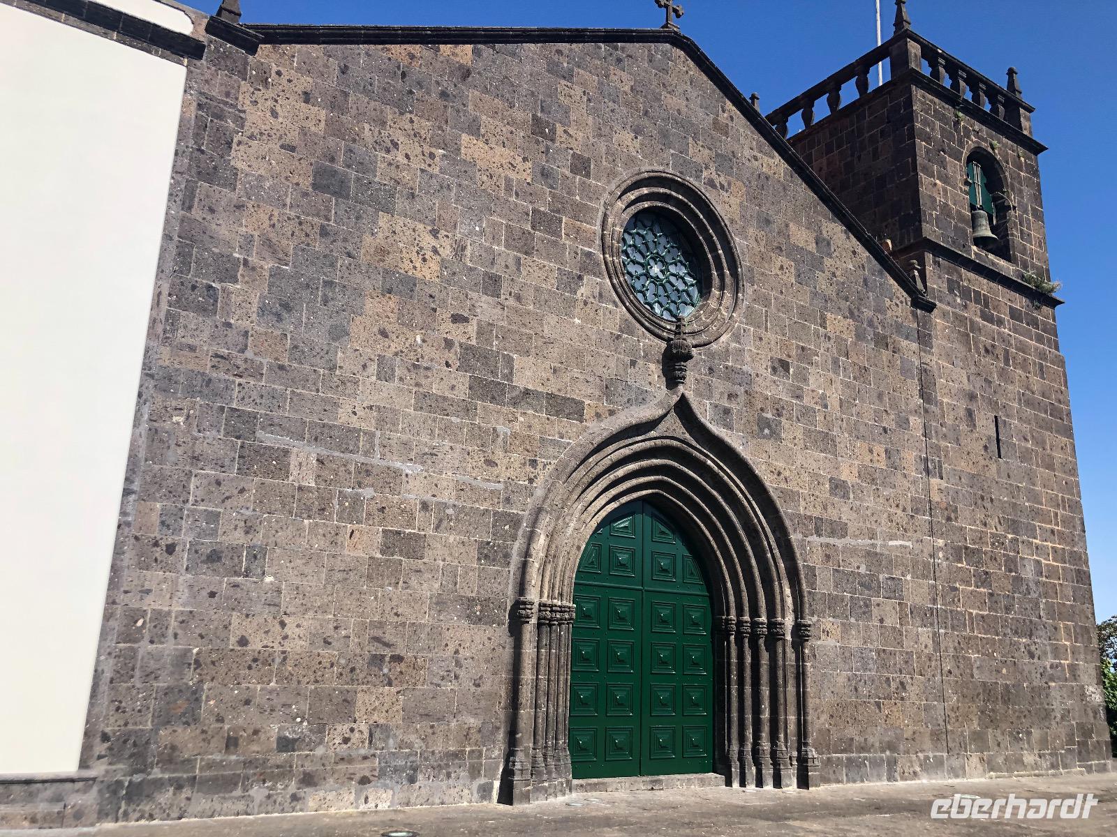 Die Kirche der Schutzheiligen Nossa Senhora de Estrella ist geschlossen. Nur von Außen können wir unter anderem den aus dunklem Basalt erbauten Glockenturm besichtigen.