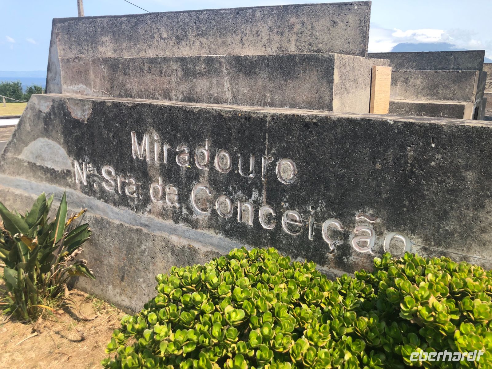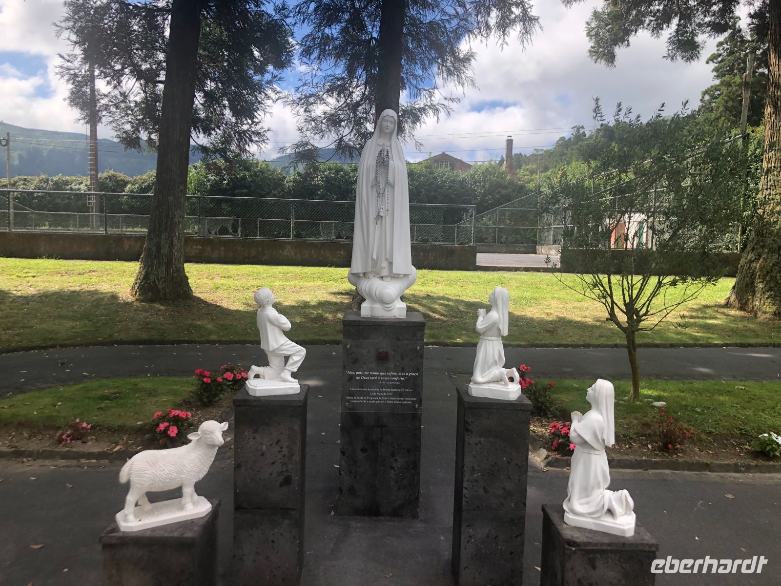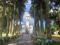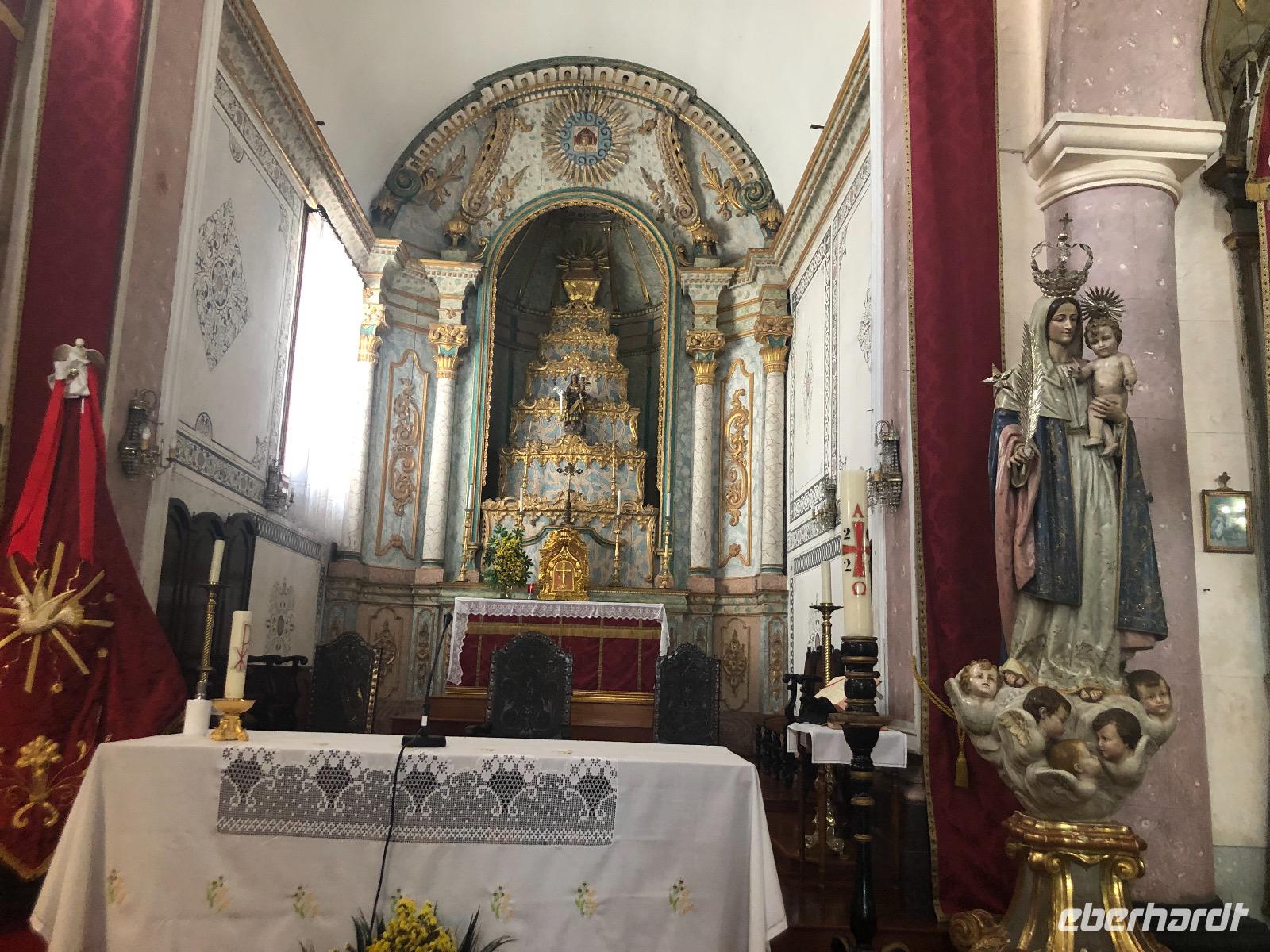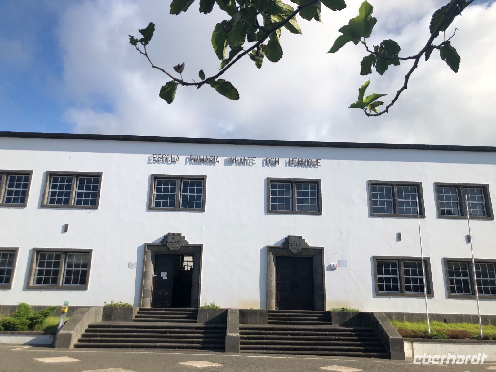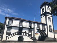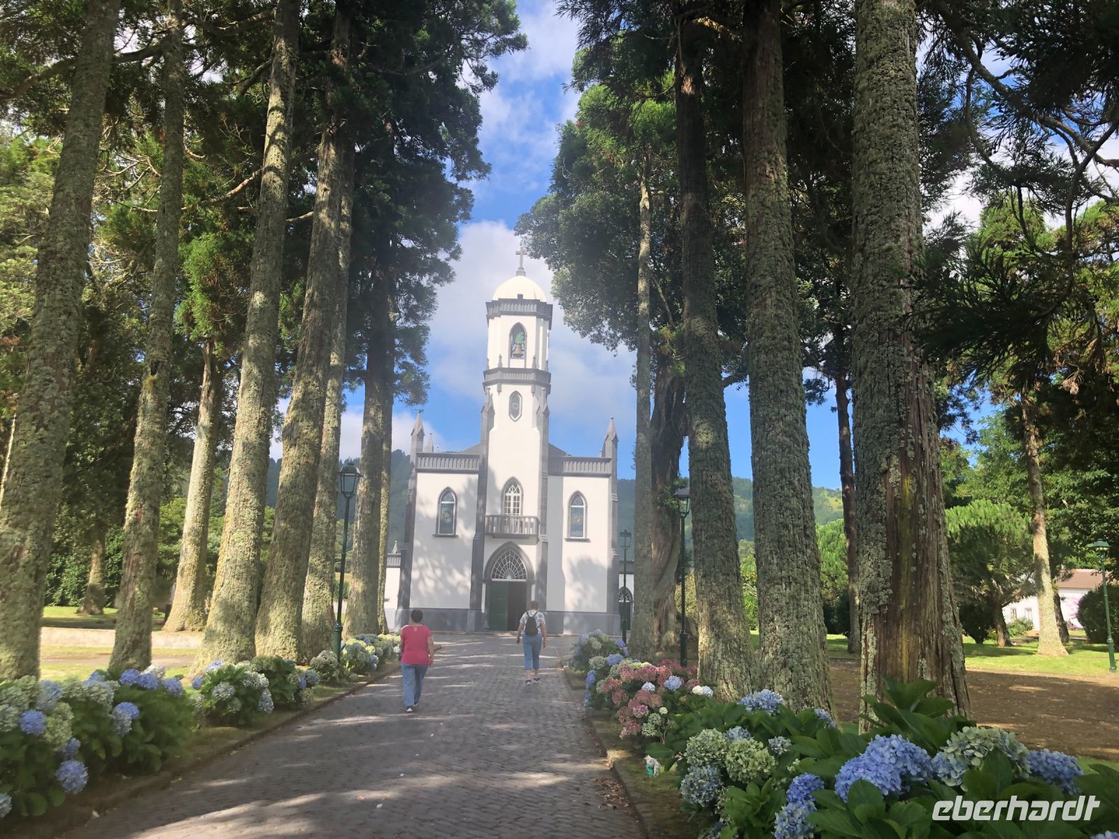 Die Kirche der Schutzheiligen Nossa Senhora de Estrella ist geschlossen. Nur von Außen können wir unter anderem den aus dunklem Basalt erbauten Glockenturm besichtigen.