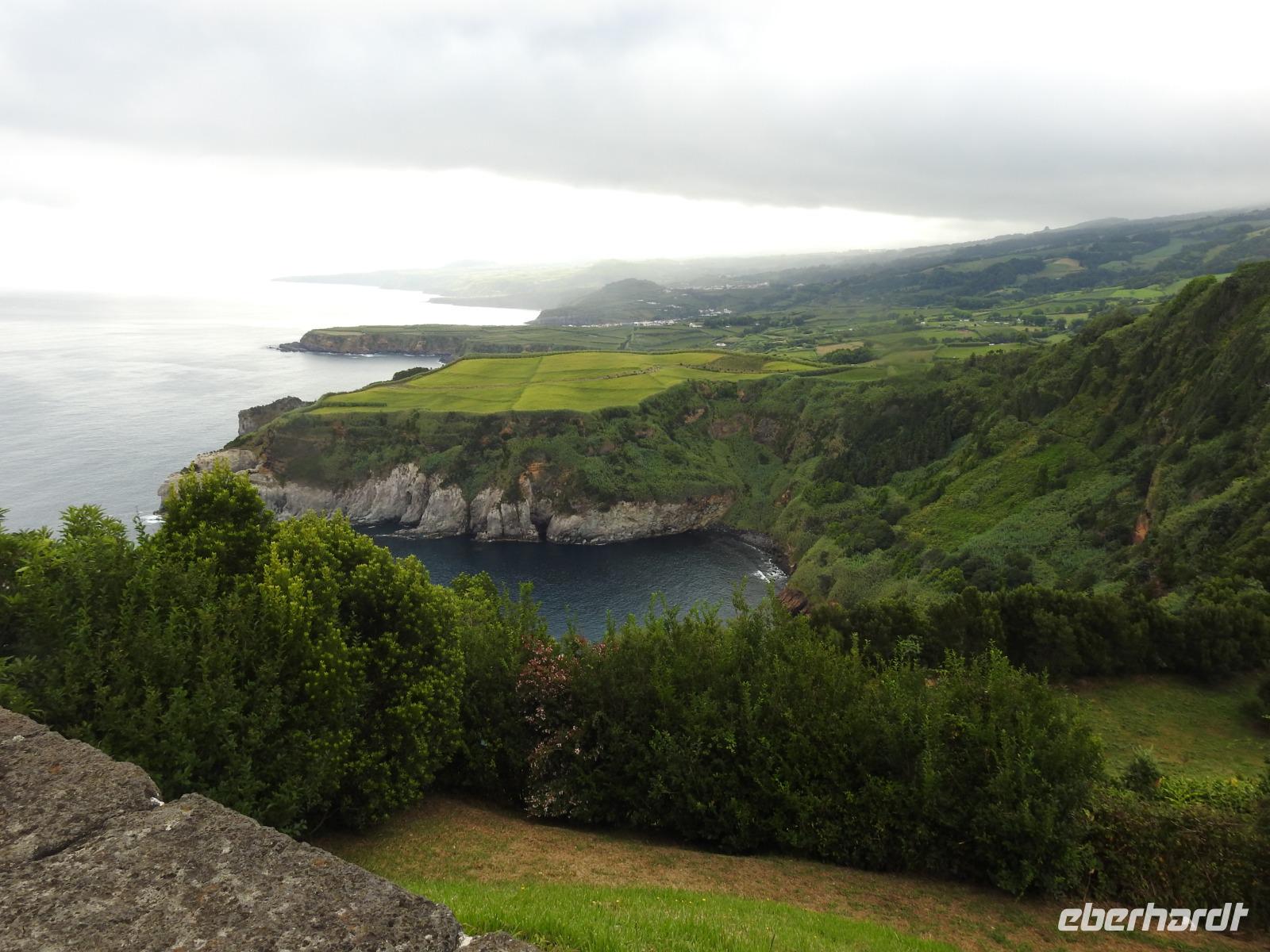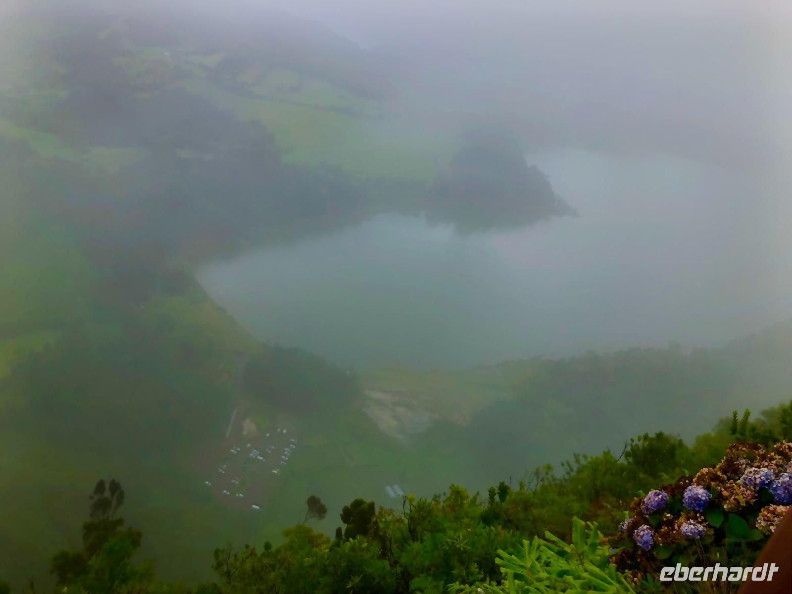 Am nächsten Aussichtspunkt werden wir zum Träumen eingeladen. Der Nebel wabert über die sonst schöne Aussicht auf den Furnassee und den Ort Povoacao und nur mit viel Glück können wir für kurze Zeit einen Blick ins Tal erhaschen. Aber so ist es nun mal auf den Azoren, das Wetter ist unbeständig und unberechenbar.