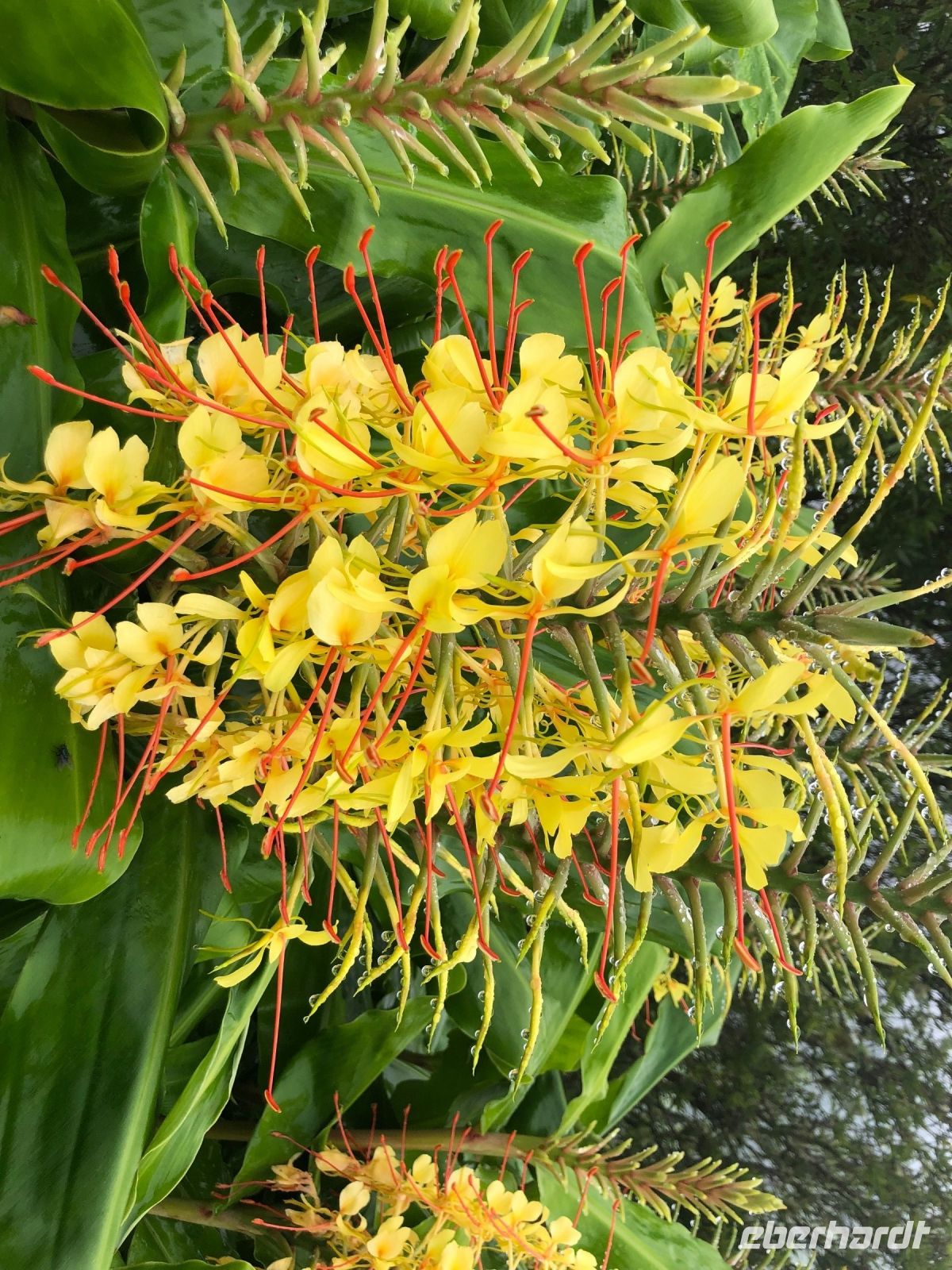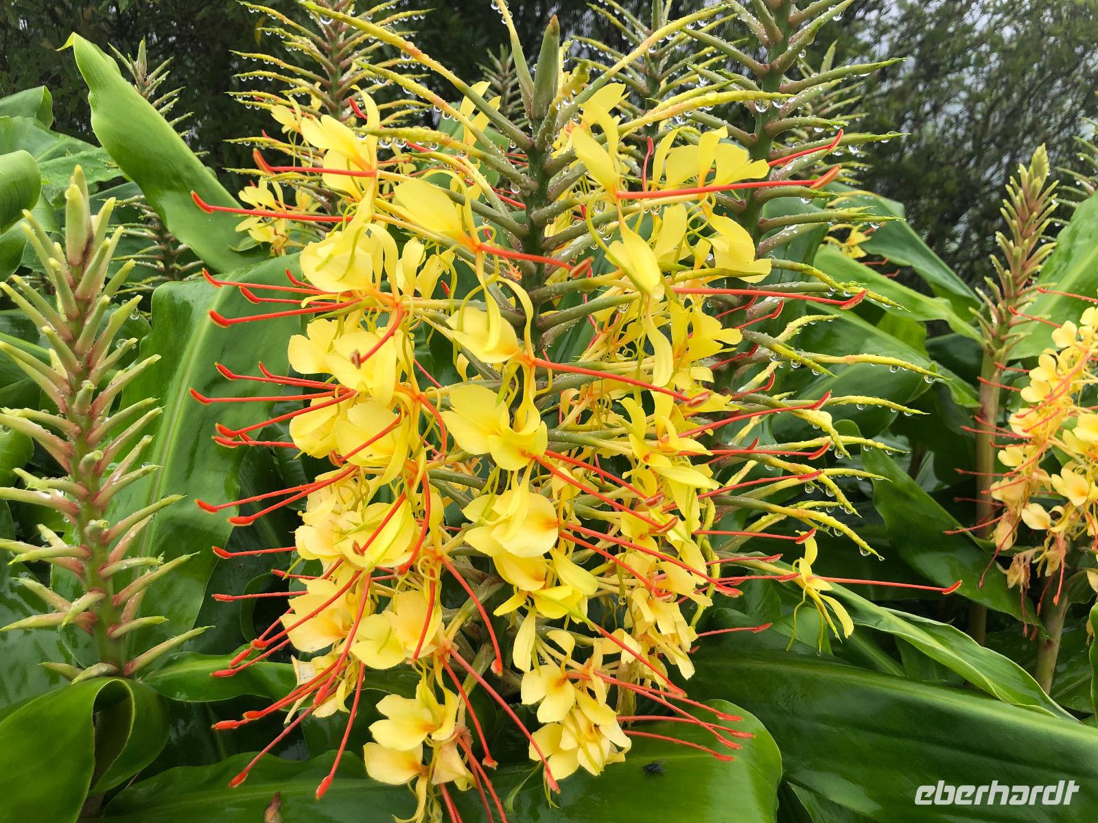 Eine weitere Pflanzenart, die uns Frederik auf dem Weg erklärt und der wir immer wieder begegnen, ist der wilde Ingwer. In leuchtend Gelb und Rot sieht er wunderschön aus, hat sich aber wie Unkraut über die ganze Insel verbreitet. Frederik zeigt uns, wie wir aus der Blüte süßen Saft auszutscheln können.