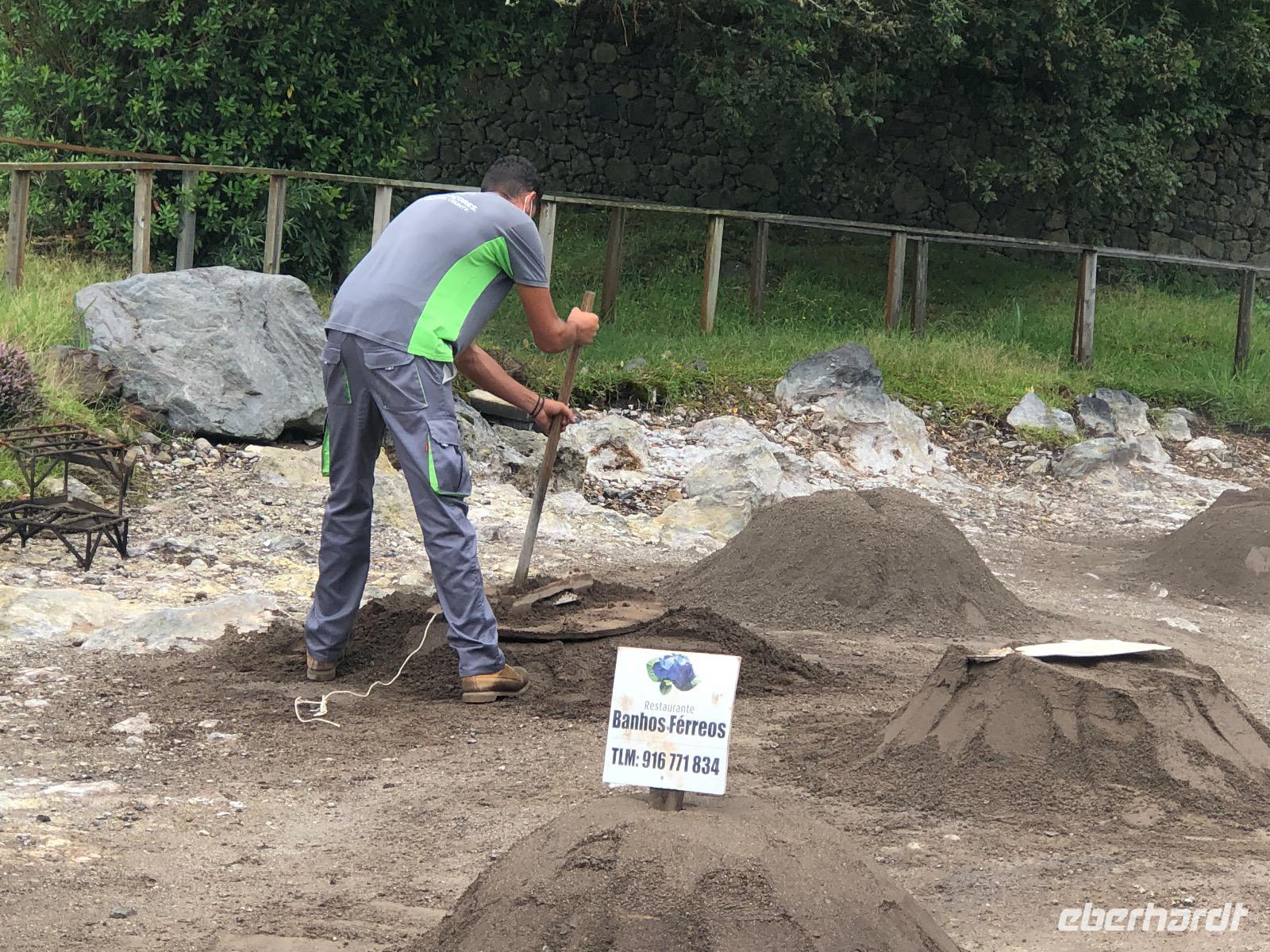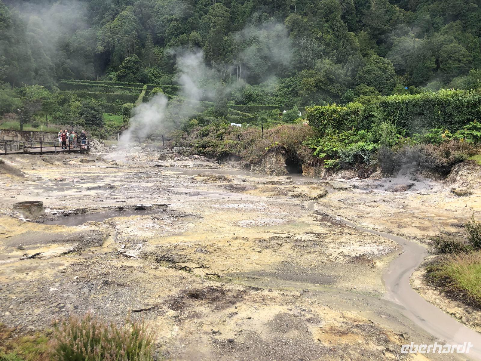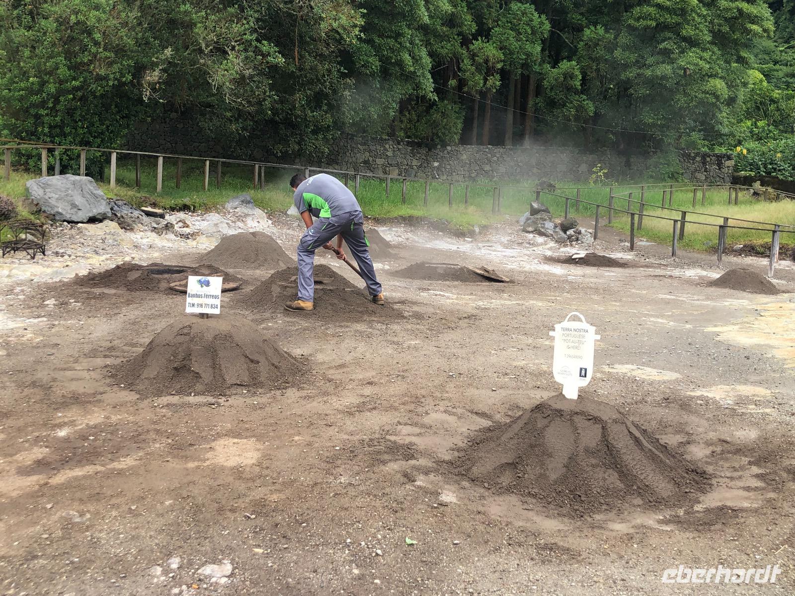 Jetzt geht es zum Mittagessen. Am Nordufer des Furnas-Sees besuchen wir zunächst die heißen Quellen und Fumarolen. Über einen Holzsteg führt uns der Weg vorbei an brodelnden Schlammlöchern und dampfspeienden Felslöchern. In dieser exotischen Mondlandschaft bereiten die Inselbewohner ihr Mittagessen zu. Restaurants liefern große Töpfe, die mit Fleisch, Würstchen, Kartoffeln und Gemüse gefüllt sind. Die Töpfe werden in einem Sack verstaut, der dann für circa sechs Stunden in ein heißes Erdloch gestellt wird, wo die Speisen langsam garen. Wie köstlich das Cozido das Furnas schmeckt, erfahren wir bei unserem anschließenden Restaurantbesuch.