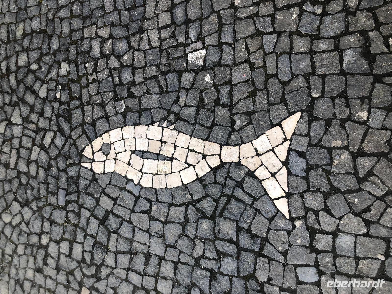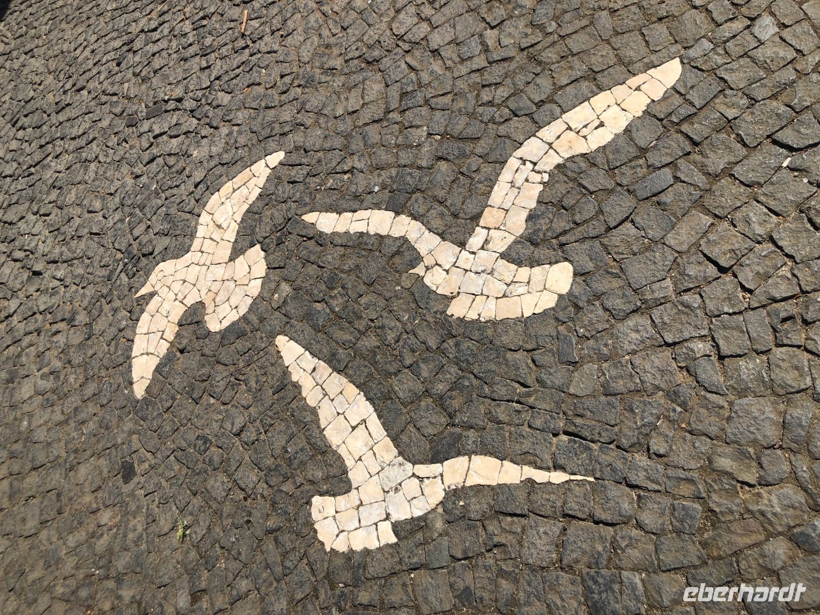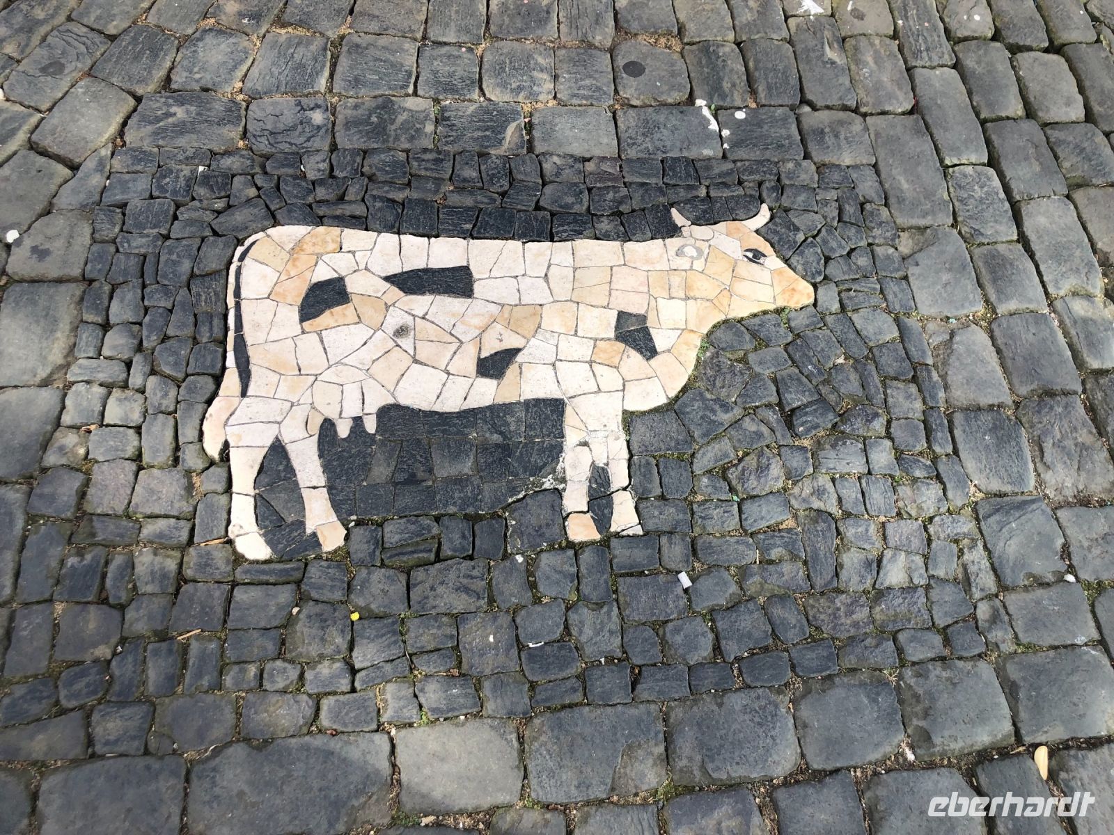 Besonders auffällig sind hier auch die Pflastersteinbilder, die viele Straßen schmücken. Da gibt es eine Kuh, einen Anker, ein Segelschiff oder einfach den Namen des Geschäfts, das sich dort befindet.