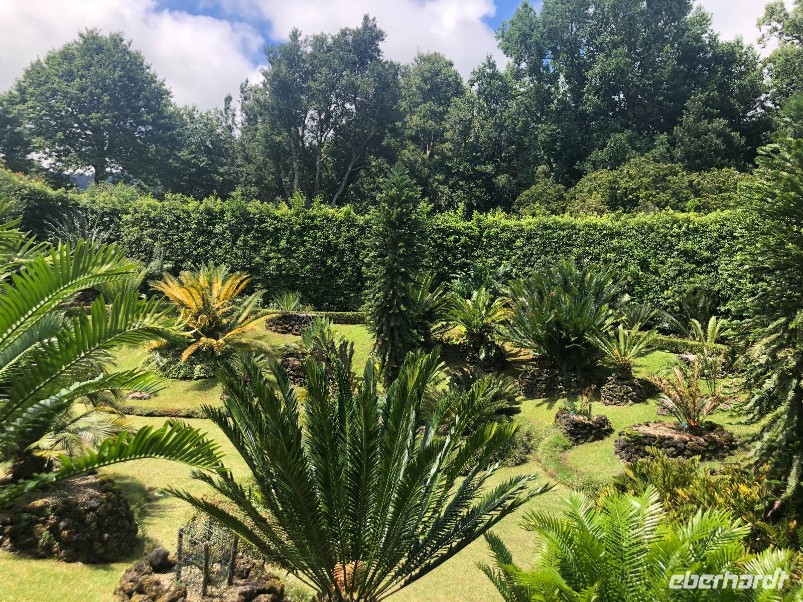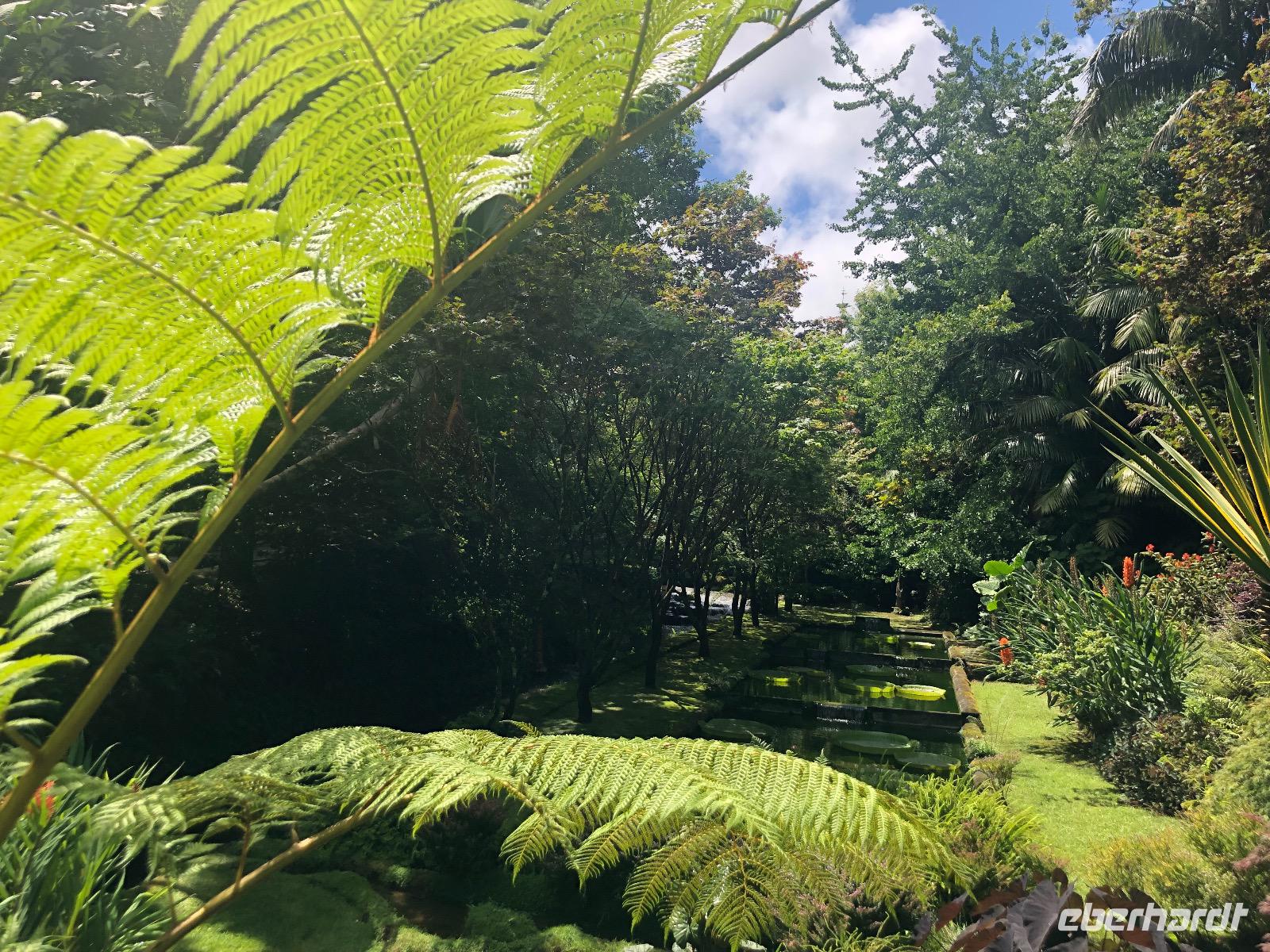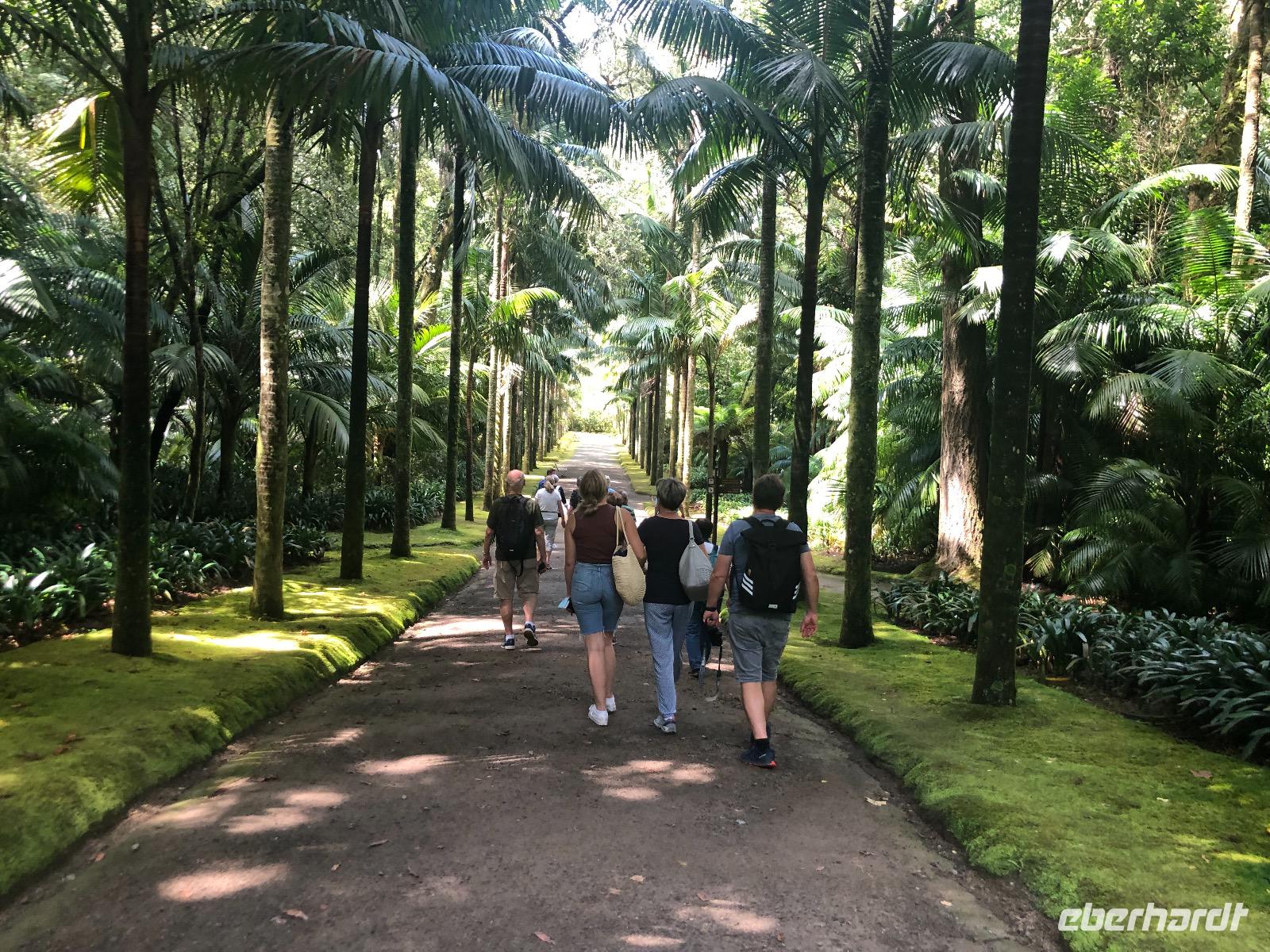Der Terra Nostra Park, den wir anschließend besuchen, zählt zu den schönsten Parkanlagen der Azoren und das zu Recht. 1780 kaufte der Konsul der Vereinigten Staaten eine Villa, von den Einheimischen Yankee Hall genannt. Nach seinem Tod übernahm eine reiche portugiesische Familie das Zepter und baute den Park weiter aus. 1896 errichtete der Sohn der Familie ein Denkmal für seine Eltern. Im Laufe der Zeit entstand so eine Anlage von ursprünglich zwei auf nunmehr zwölf Hektar. Wasserwege und Blumenbeete wurden angelegt und auch exotische Pflanzen fanden hier ihren Platz. Der Park gehört heute zu einem Hotel, kann aber gegen Eintritt von jedermann besucht werden. Im Zentrum befindet sich ein riesiges Thermalbecken. Das Wasser ist bräunlich, weil es sehr eisenhaltig ist. Außerdem hat es Badewannentemperatur, 38 Grad immerhin. Ein Spaziergang führt uns durch die verschiedenen Bereiche des Parks und einige Gäste erfüllen sich den Wunsch einmal in dem rostbraunen Thermalbecken zu baden.