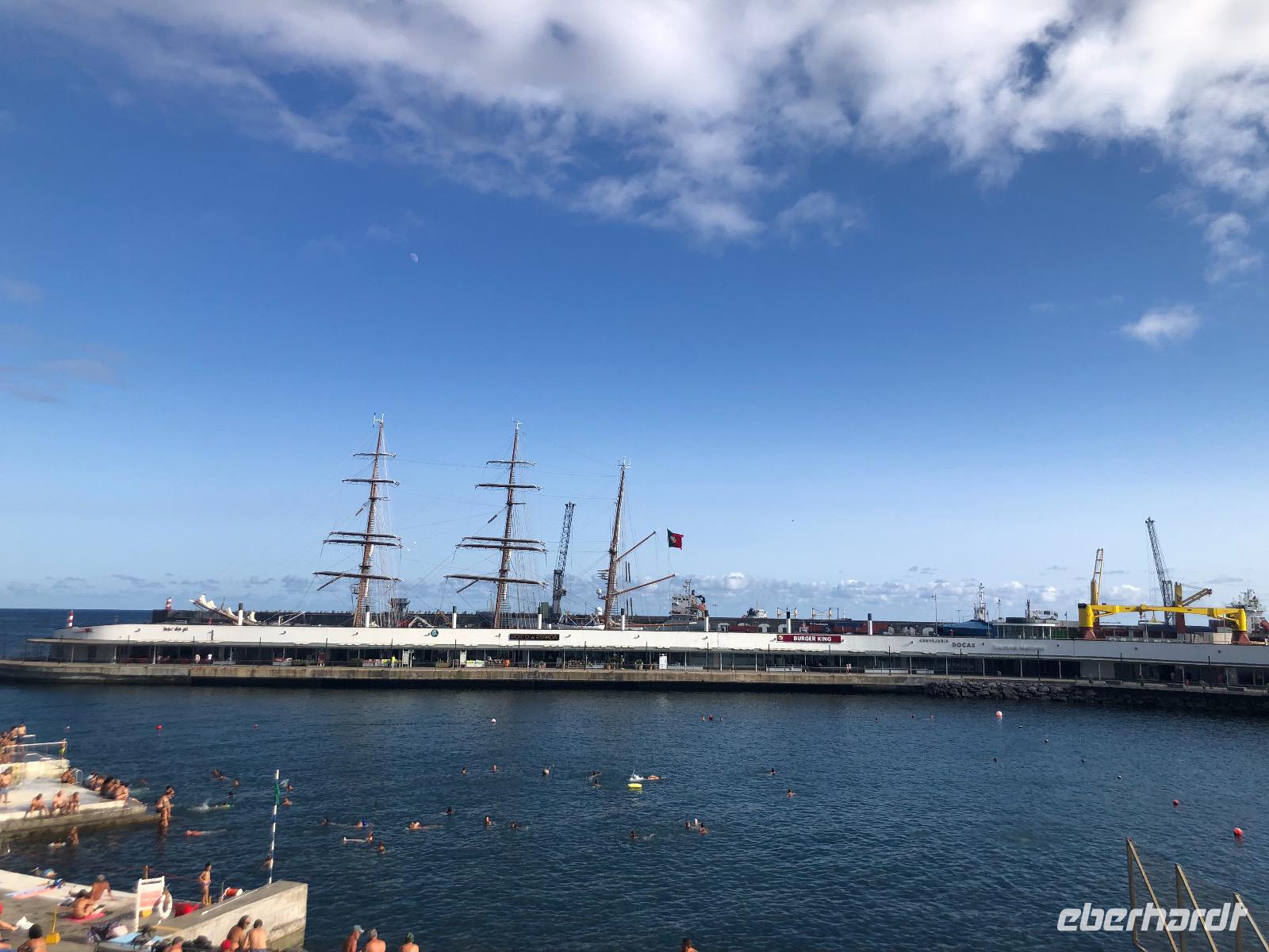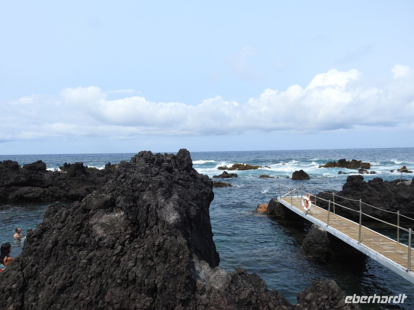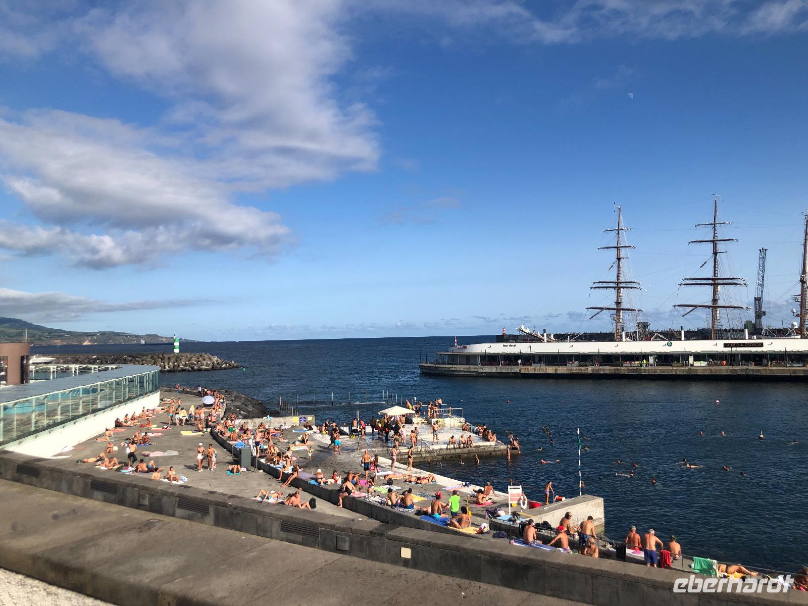 Der Tag ist noch jung und es zu früh, um ins Hotel zurückzufahren. So schlägt Frederik vor, zu einem Meeresschwimmbad zu fahren und dort zu verweilen. Gute Idee. Pech für uns - es ist rappelvoll. Kein Platz im Café und die Sonne scheint erbarmungslos. So teilen wir uns in zwei Gruppen, einige bleiben am Strand und die anderen suchen ein etwas entfernteres Café auf.