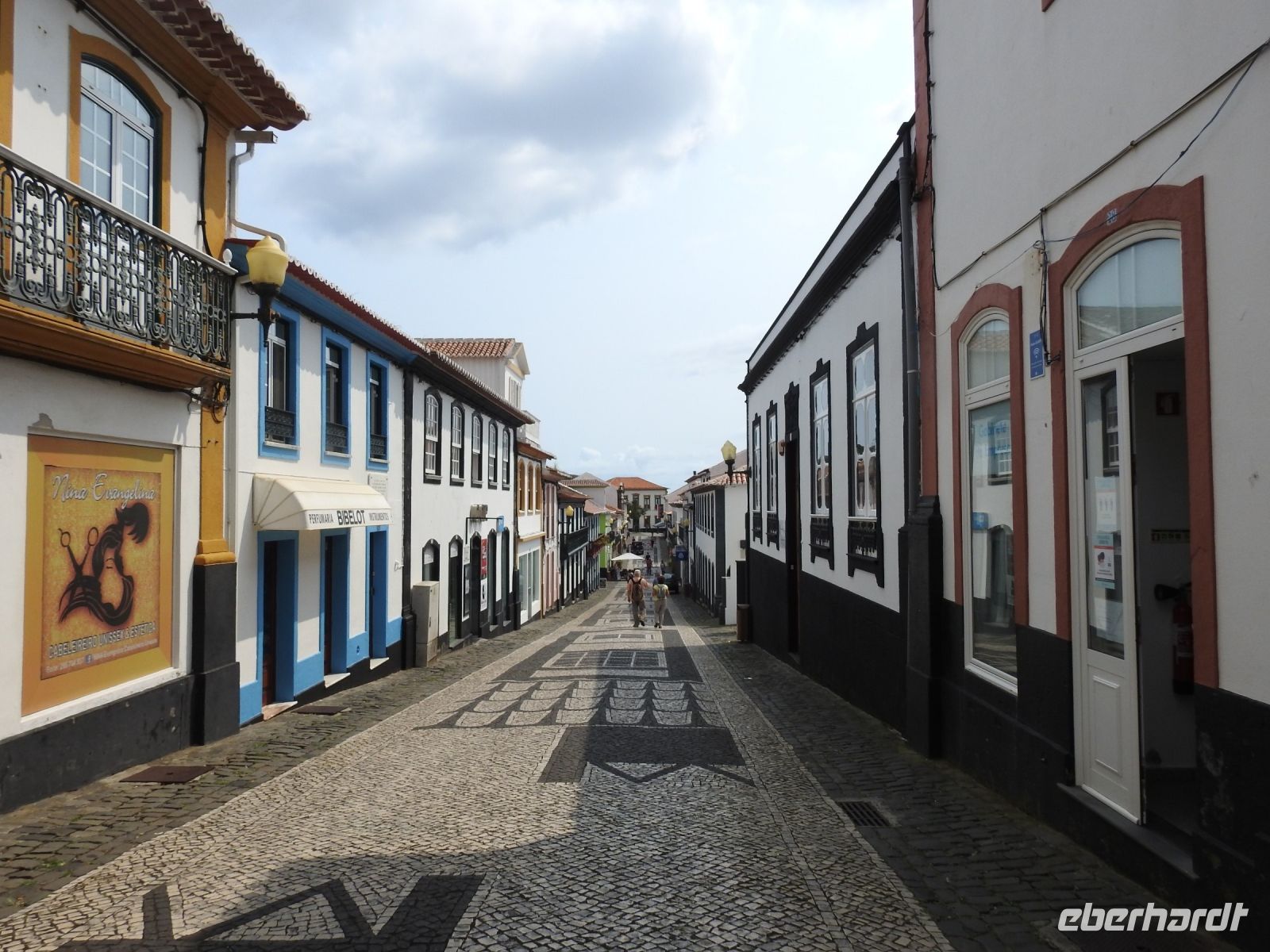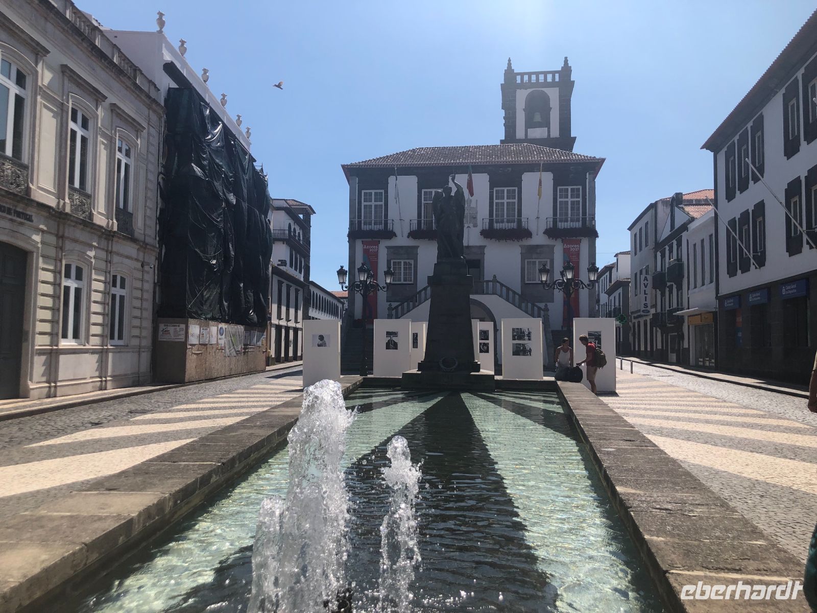 Der Tag beginnt früh und mit einem Lunchpaket. Um 07.30 Uhr startet unser Flug nach Terceira, eine halbe Stunde später sind wir da. Paula, unsere örtliche Reiseleiterin erwartet uns am Ausgang. Wir bringen die Koffer ins Hotel, können aber noch nicht einchecken. Zu Fuß erkunden wir mit Paula die Stadt. Circa fünfzehn Minuten sind es bis zum Zentrum, verlaufen kann man sich eigentlich nicht. Es gibt auch einen Stadtbus, der in der Nähe des Hotels hält, aber mir ist nicht bekannt, dass den jemand von uns genutzt hätte. Die Stadt heißt Angra do Heroismo, hat einen schönen zentralen Platz, ein paar Kirchlein und viele schmale Straßenzüge mit bunt gestrichenen Häuschen. Und - ein wunderschönes Theater. Heute Abend gibt es ein Fado-Konzert, da es aber Sommer ist, findet das Konzert draußen auf dem Marktplatz statt. Nur bei Regen würden sich die Zuschauer ins Theater zurück ziehen.