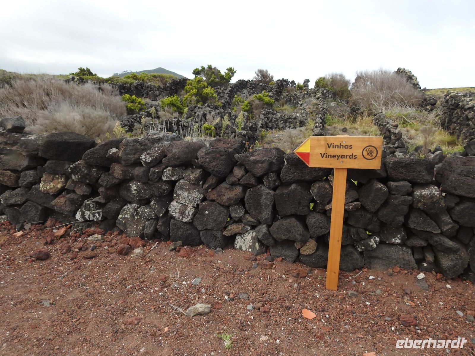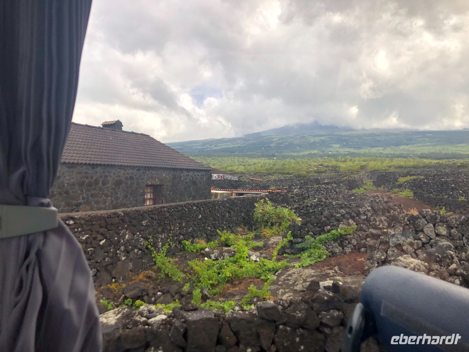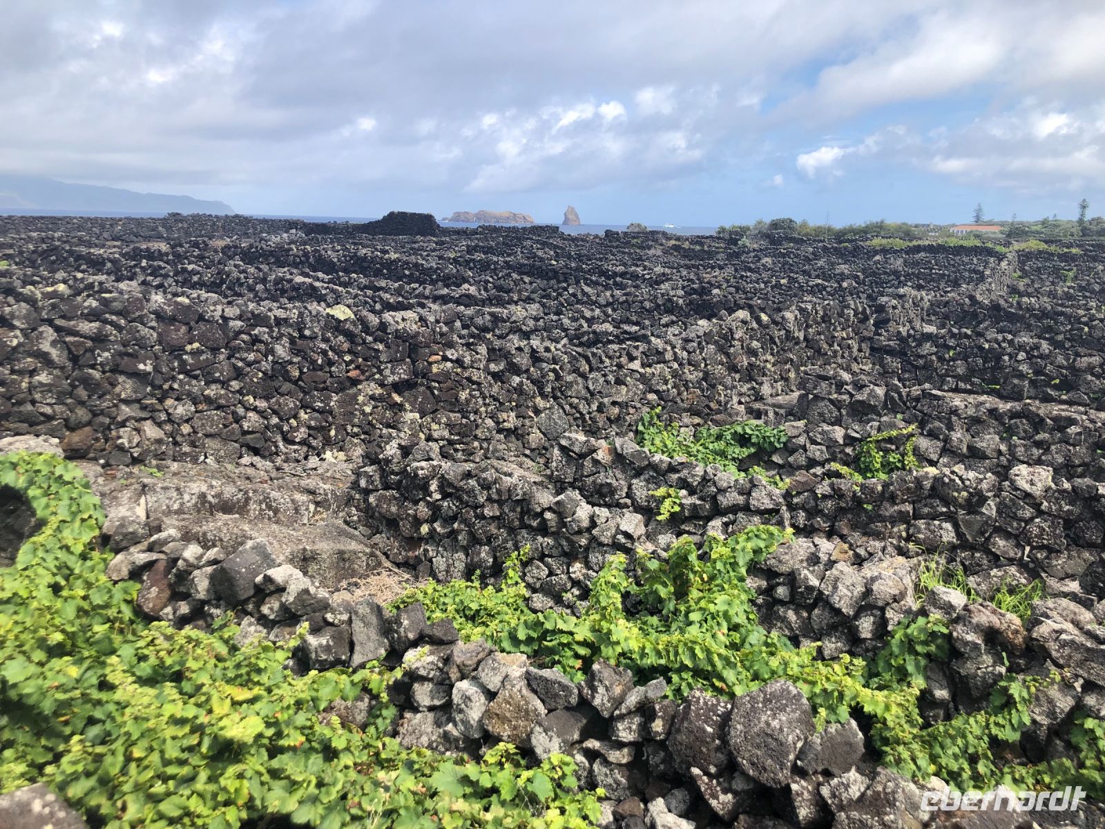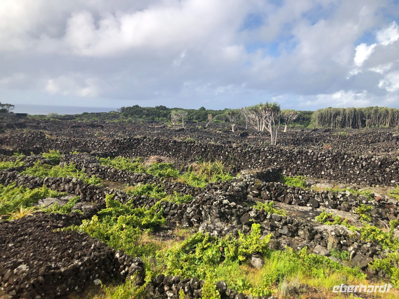 Als Erstes lernen wir die Weinbaukultur auf Pico kennen. In (fast) quadratisch abgesteckten kleinen Parzellen wird der Wein angebaut. Die dunkelschwarzen Mauern sollen die Rebstöcke vor dem rauen Meereswind schützen. Die Art Wein anzubauen gehört seit 2004 zum UNESCO Welterbe.