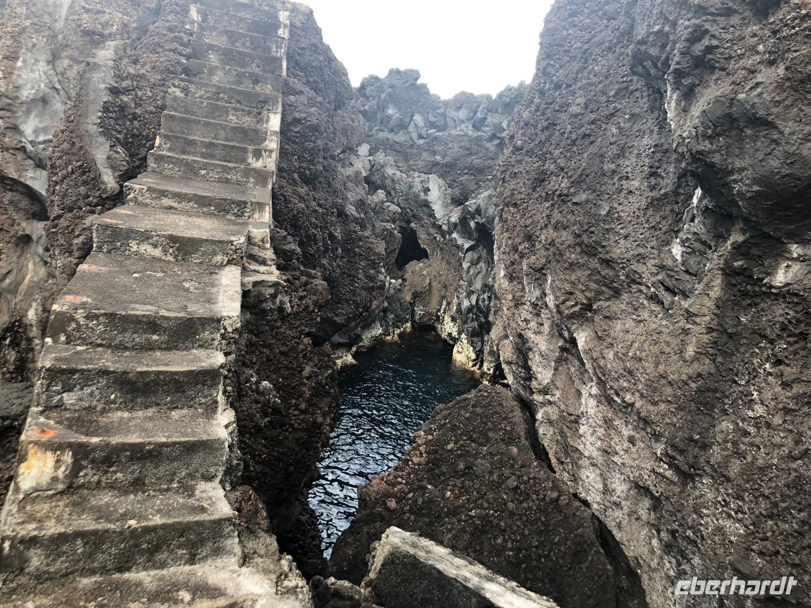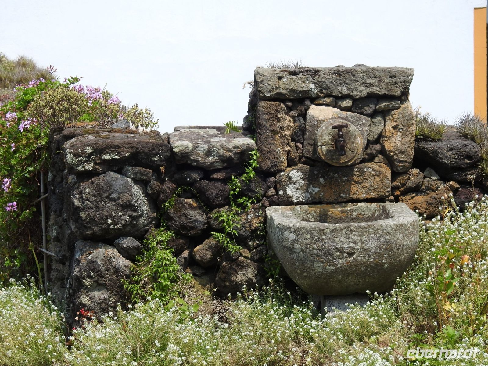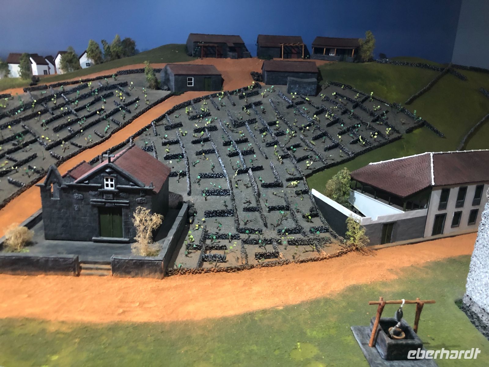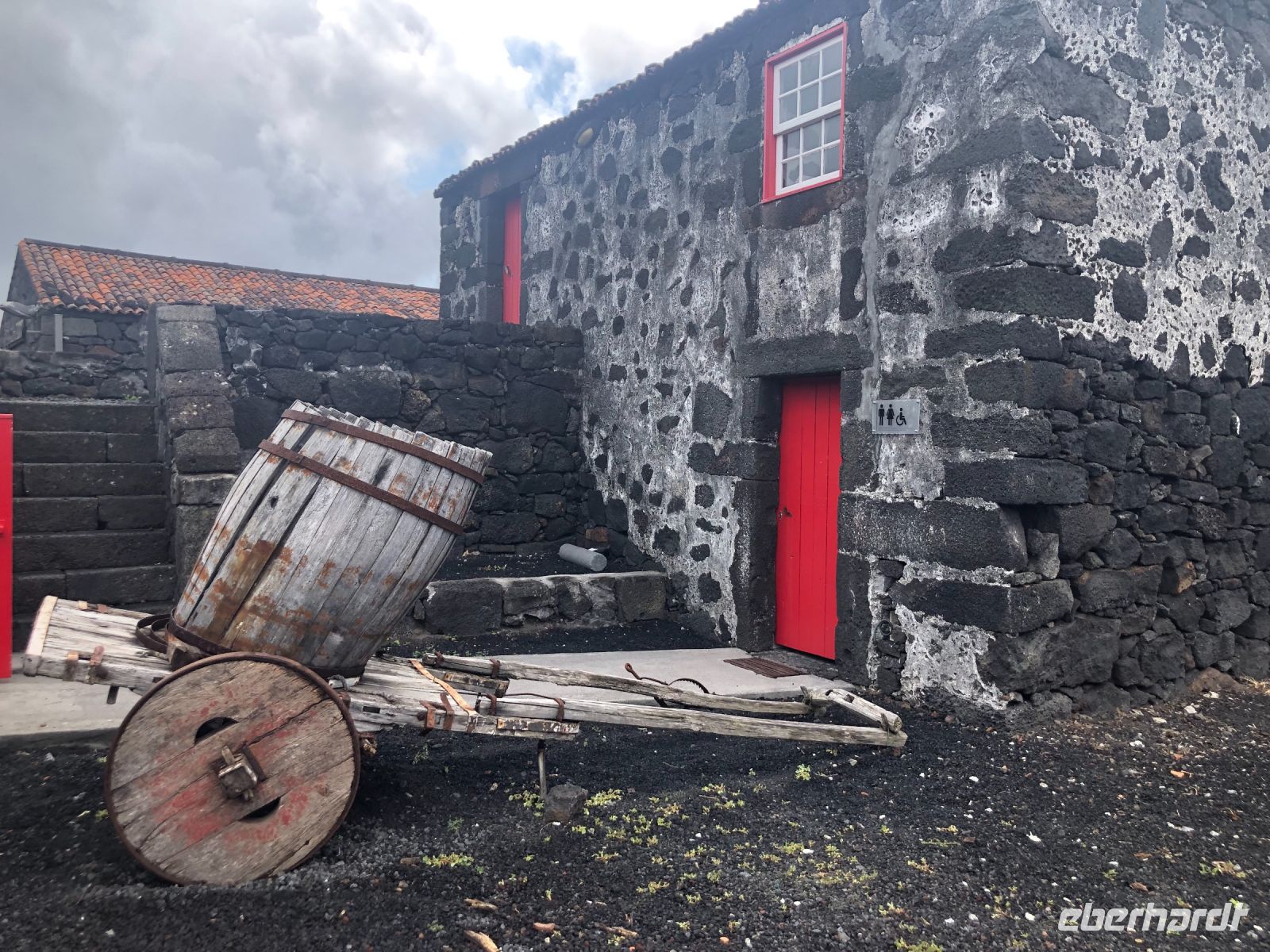 Als Erstes lernen wir die Weinbaukultur auf Pico kennen. In (fast) quadratisch abgesteckten kleinen Parzellen wird der Wein angebaut. Die dunkelschwarzen Mauern sollen die Rebstöcke vor dem rauen Meereswind schützen. Die Art Wein anzubauen gehört seit 2004 zum UNESCO Welterbe.