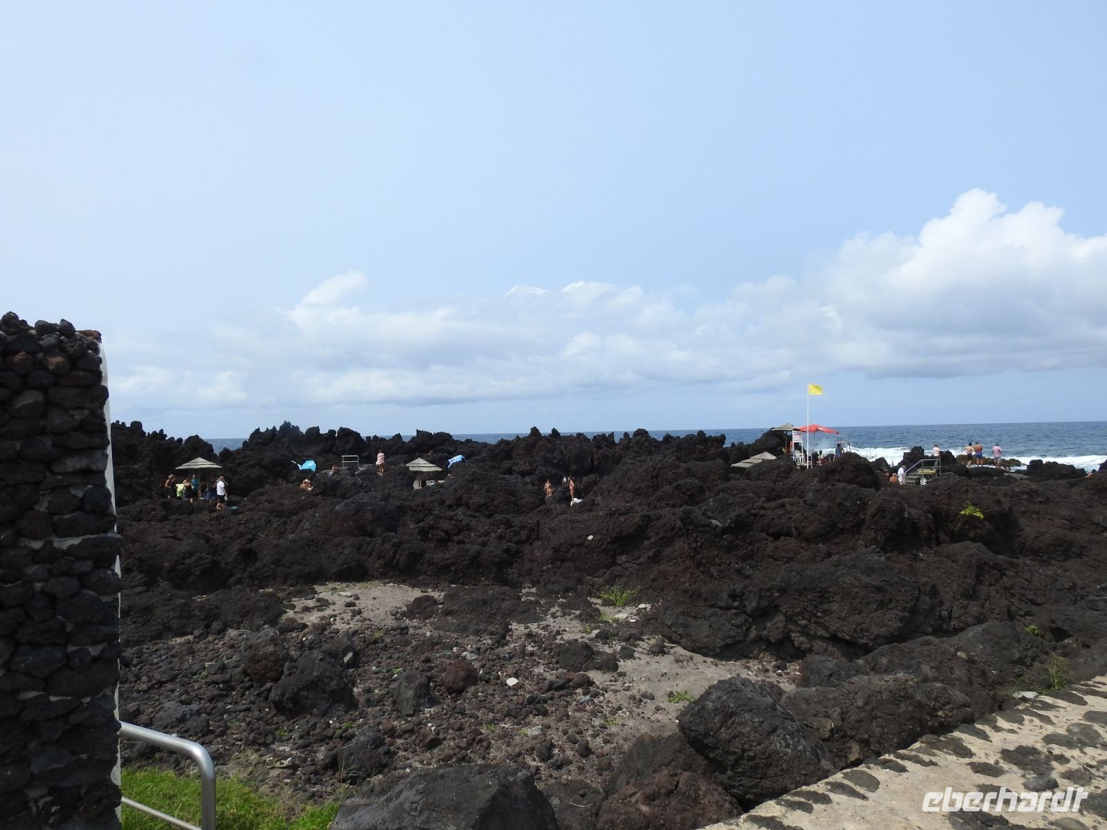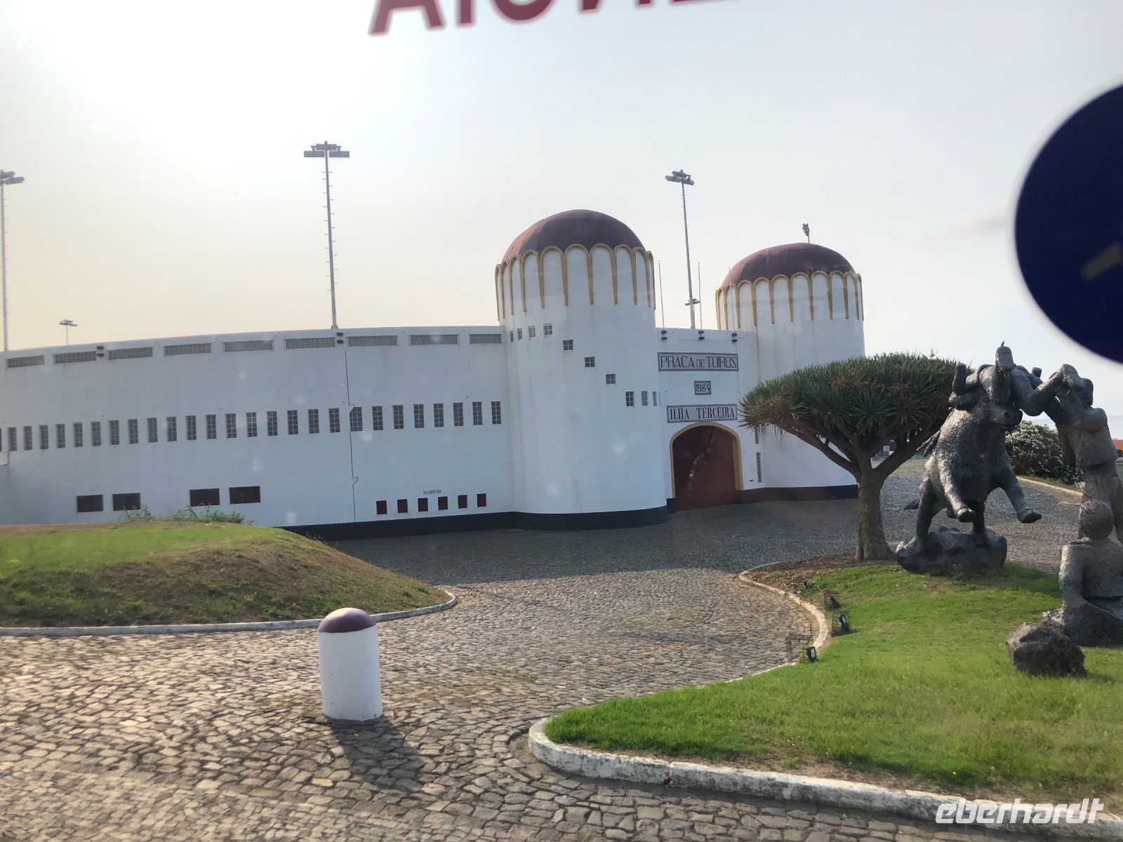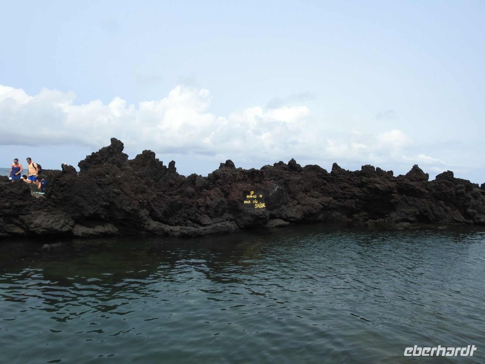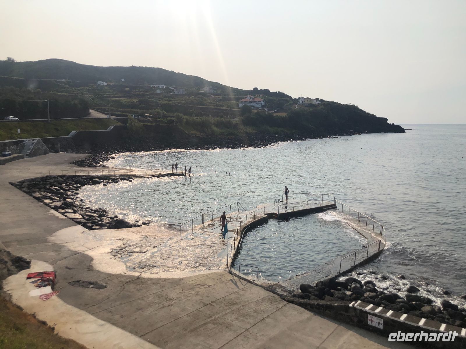 ein Zentimeter rechts, ein Zentimeter links - ich schwöre, mehr Platz war da nicht. Angar do Heroismo hat auch ein Stadion für Stierkämpfe, allerdings sollen die hier etwas anders ablaufen als in Spanien, also ohne blutiges Gemetzel. Wir fahren an der Küste entlang und werfen einen Blick auf die Ziegeninseln. Eigentlich waren die Beiden mal aus einem Stück, aber die tektonischen Bewegungen haben den Fels gespalten und auseinander driften lassen. Immer wieder sehen wir auch Meerwasserschwimmbäder - alle gut besucht.