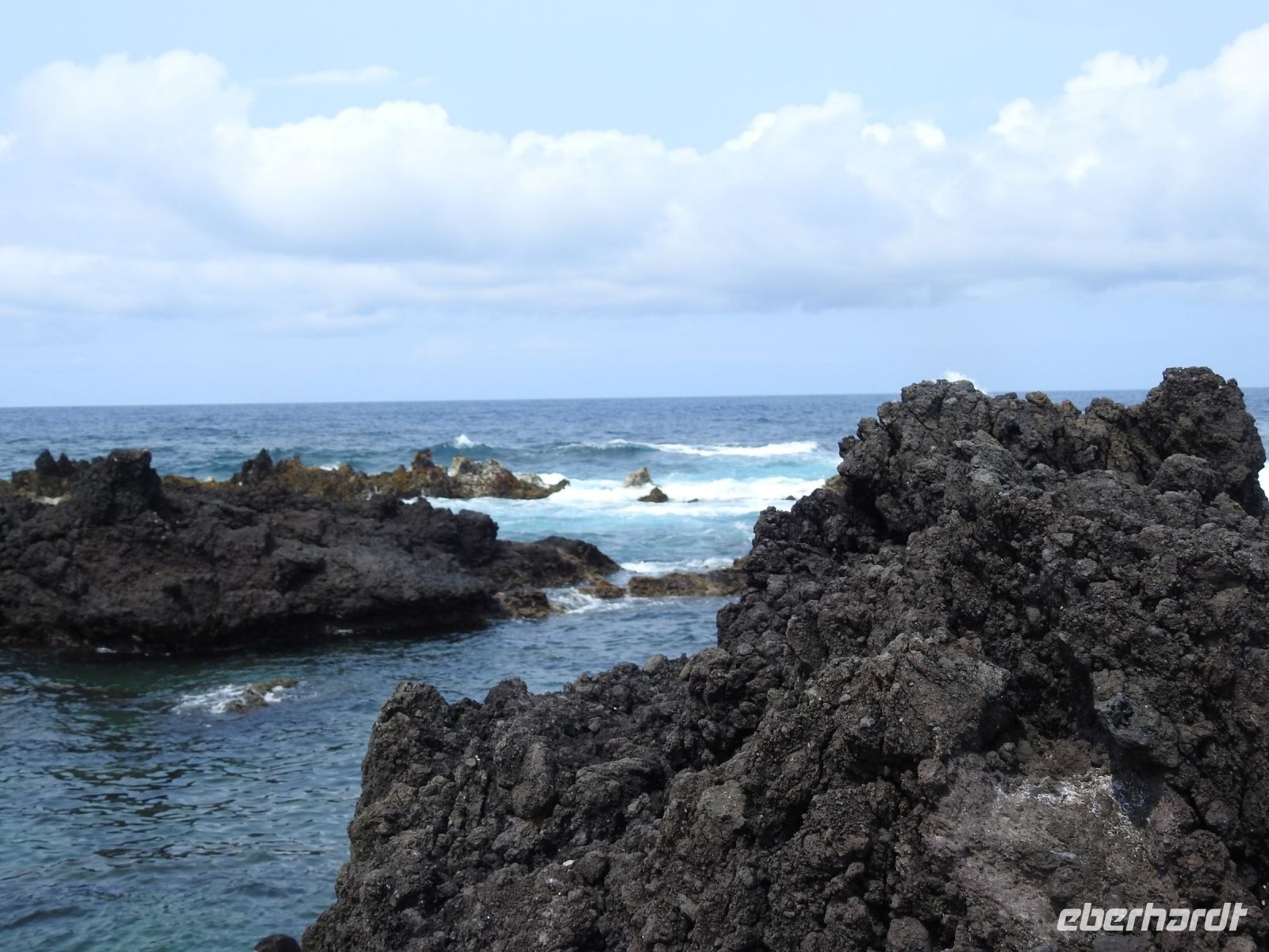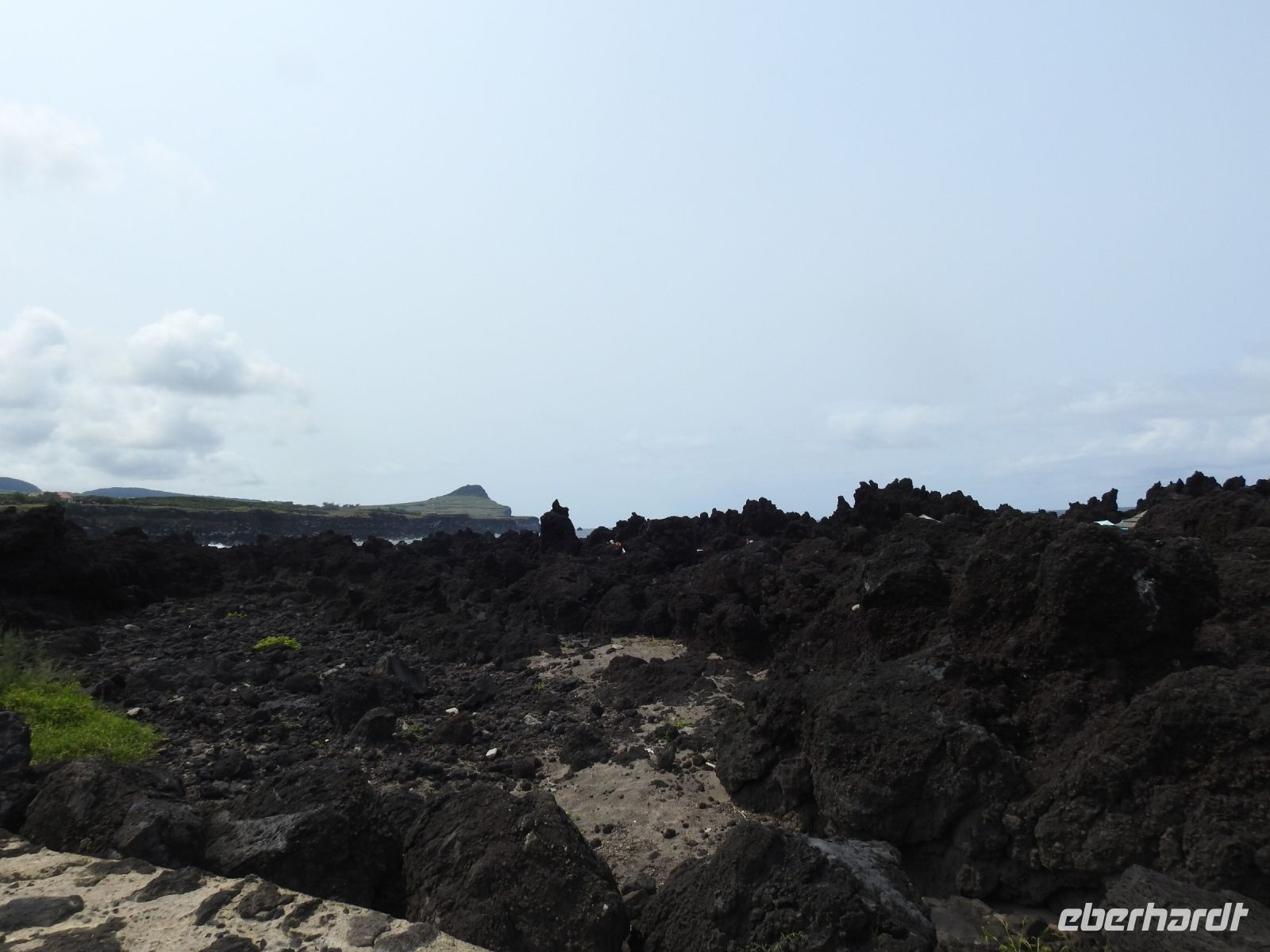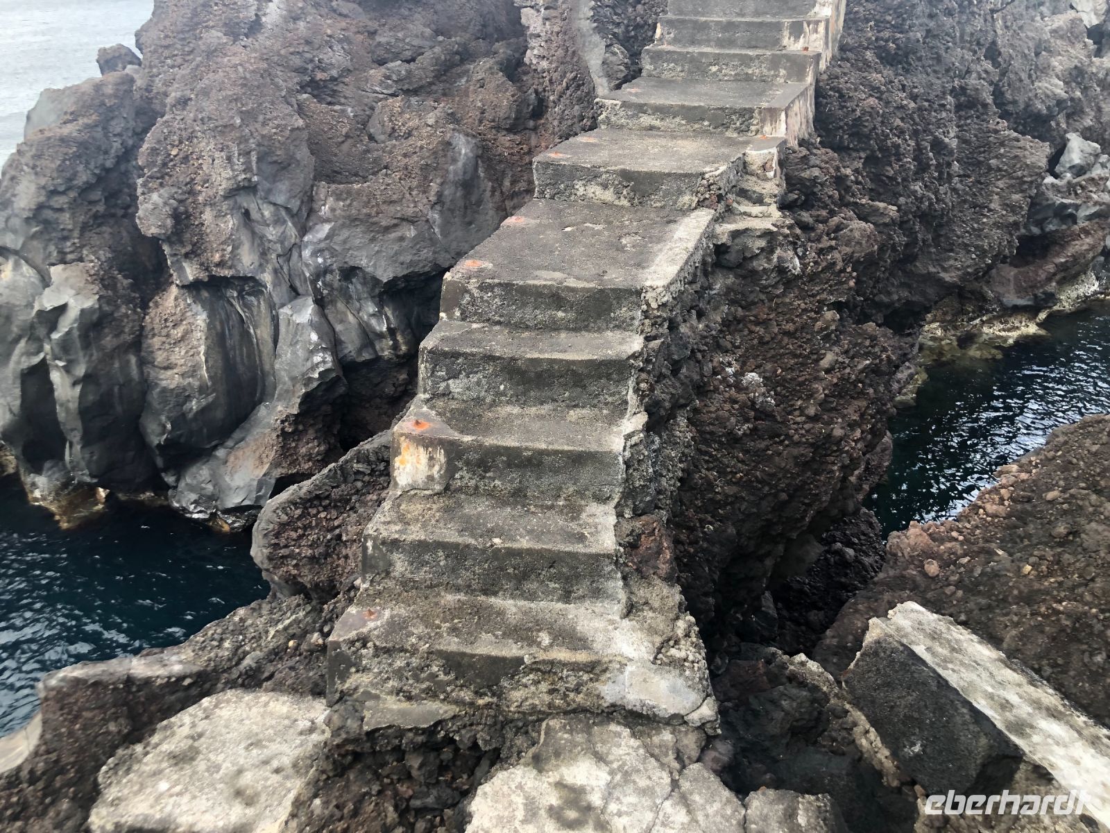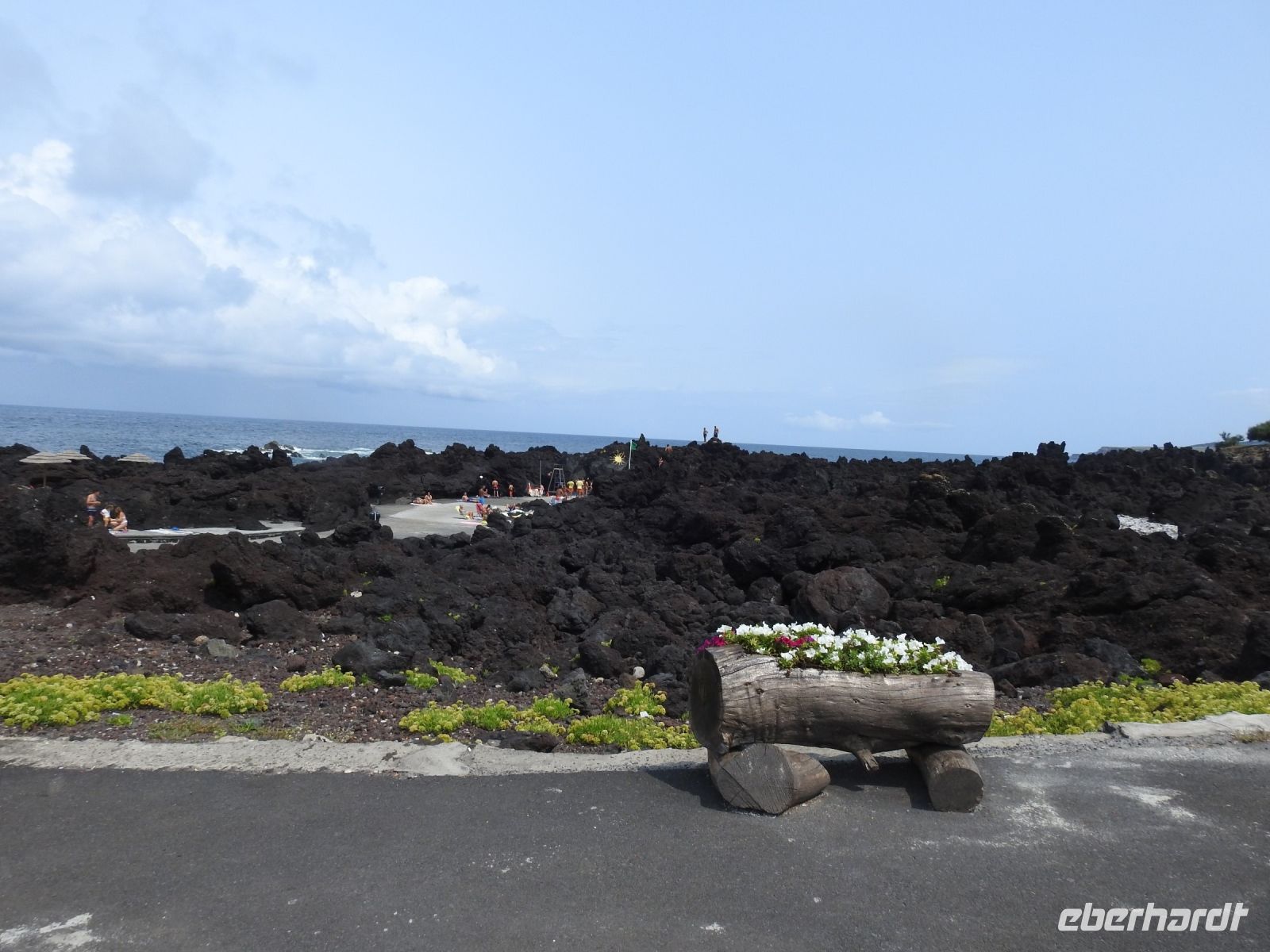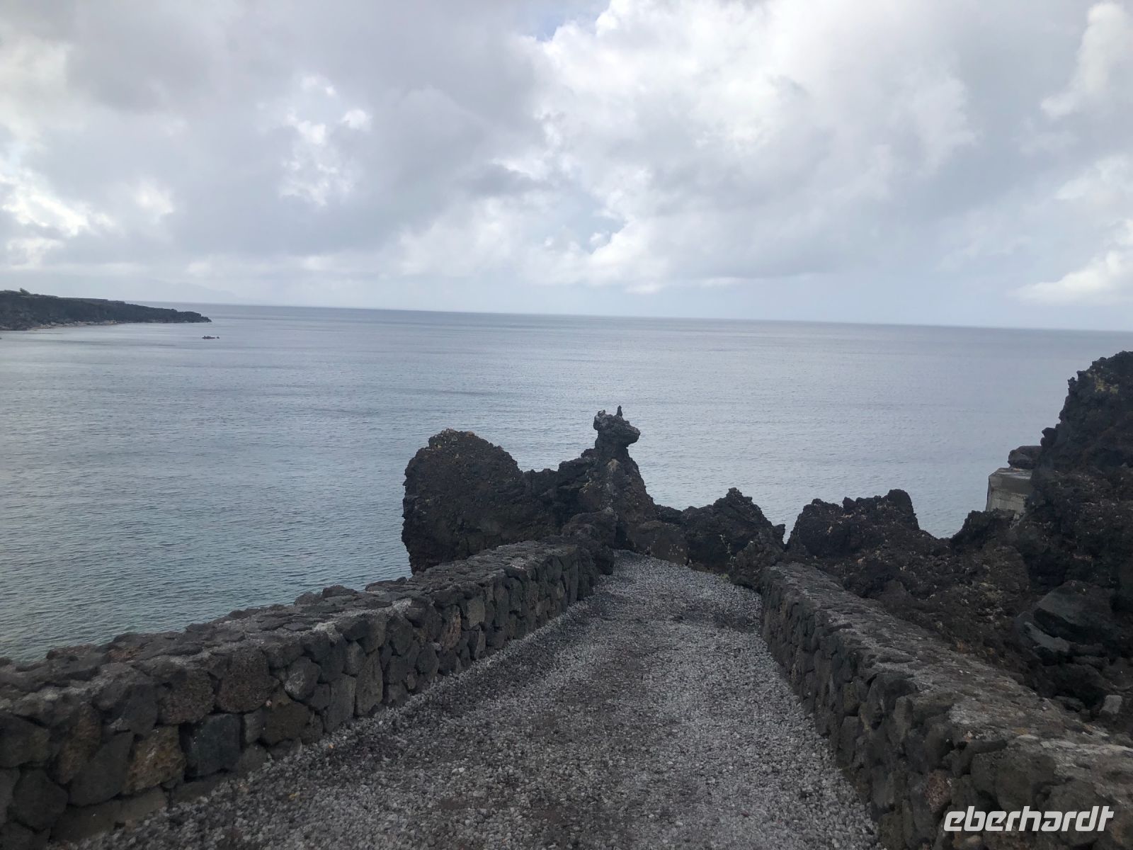 ein Zentimeter rechts, ein Zentimeter links - ich schwöre, mehr Platz war da nicht. Angar do Heroismo hat auch ein Stadion für Stierkämpfe, allerdings sollen die hier etwas anders ablaufen als in Spanien, also ohne blutiges Gemetzel. Wir fahren an der Küste entlang und werfen einen Blick auf die Ziegeninseln. Eigentlich waren die Beiden mal aus einem Stück, aber die tektonischen Bewegungen haben den Fels gespalten und auseinander driften lassen. Immer wieder sehen wir auch Meerwasserschwimmbäder - alle gut besucht.