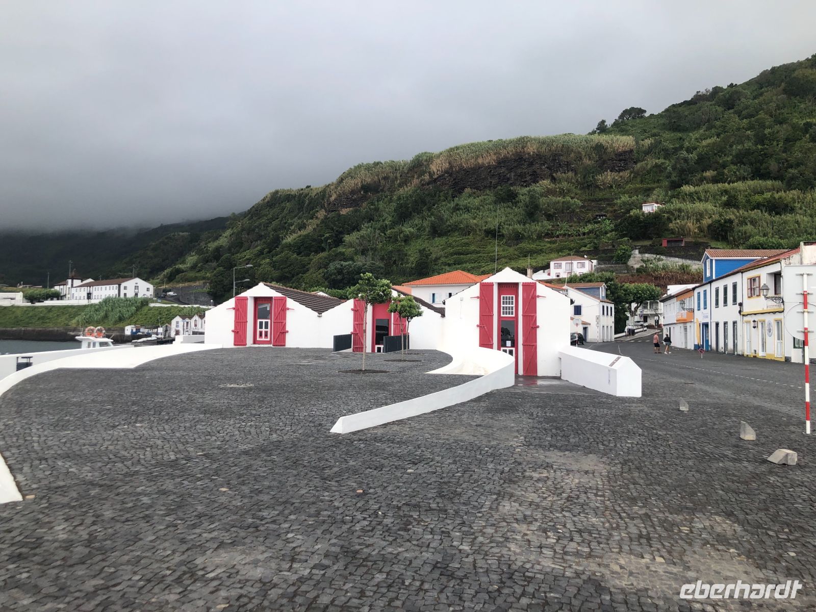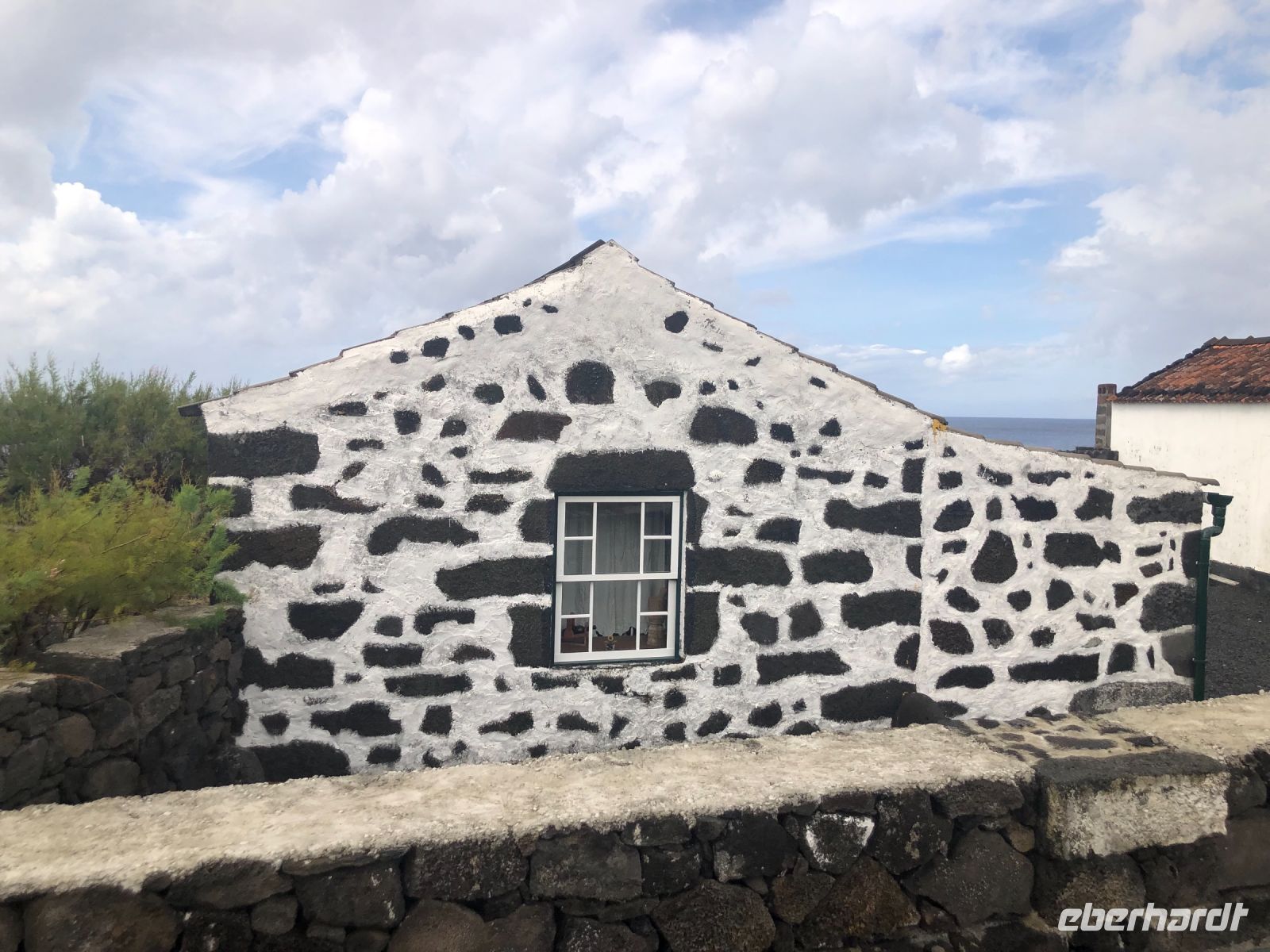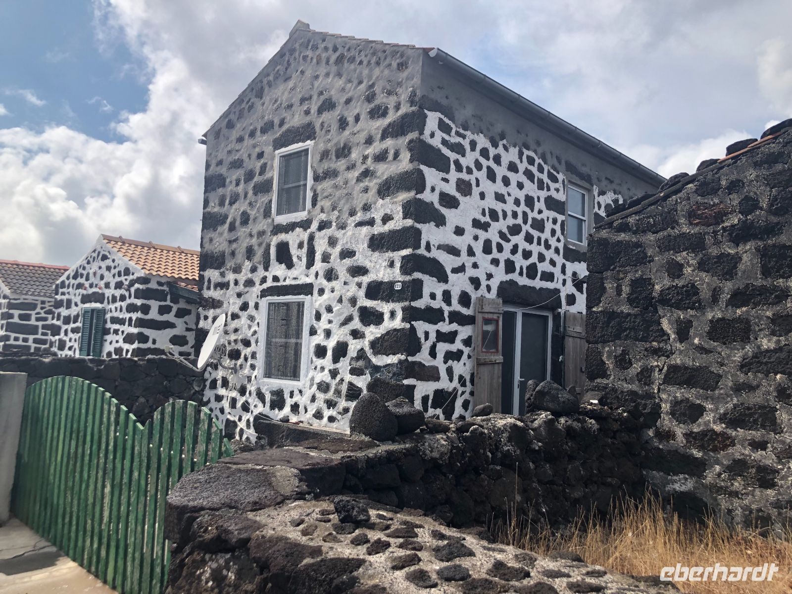 Unser Aussichtspunkt ist heute vom Nebel verhüllt. Wir müssen damit vorlieb nehmen, was von unten zu sehen ist. In Sao Roque do Pico besuchen wir ein Industrienuseum. Das ist eine Fabrik, in der früher die erlegten Wale verarbeitet wurde. Nichts für schwache Mägen (gruselig). Aber die Dörfer hier sind ja wirklich kleine Schmuckstückchen. Die Häuser in Sao Roque sehen aus wie mit Kuhfell bespannt - alles in schwarz-weiß. Dann folgen Häuser mit knallroten Türen und Fensterläden. Auf einer Terrasse sieht man noch, wo die Lava erkaltet ist. Ein weiterer Spaziergang führt ans Meer, wo die Wellen an den dunklen Lavafelsen nagen und seltsame Formationen bilden.