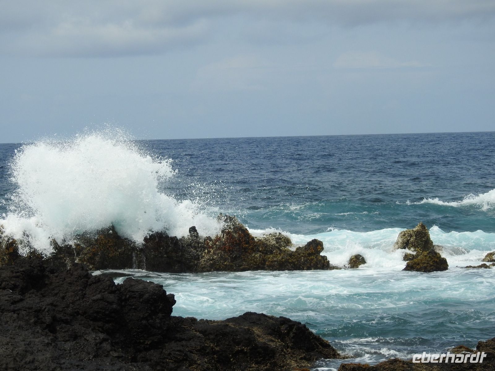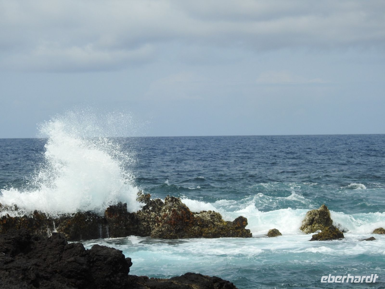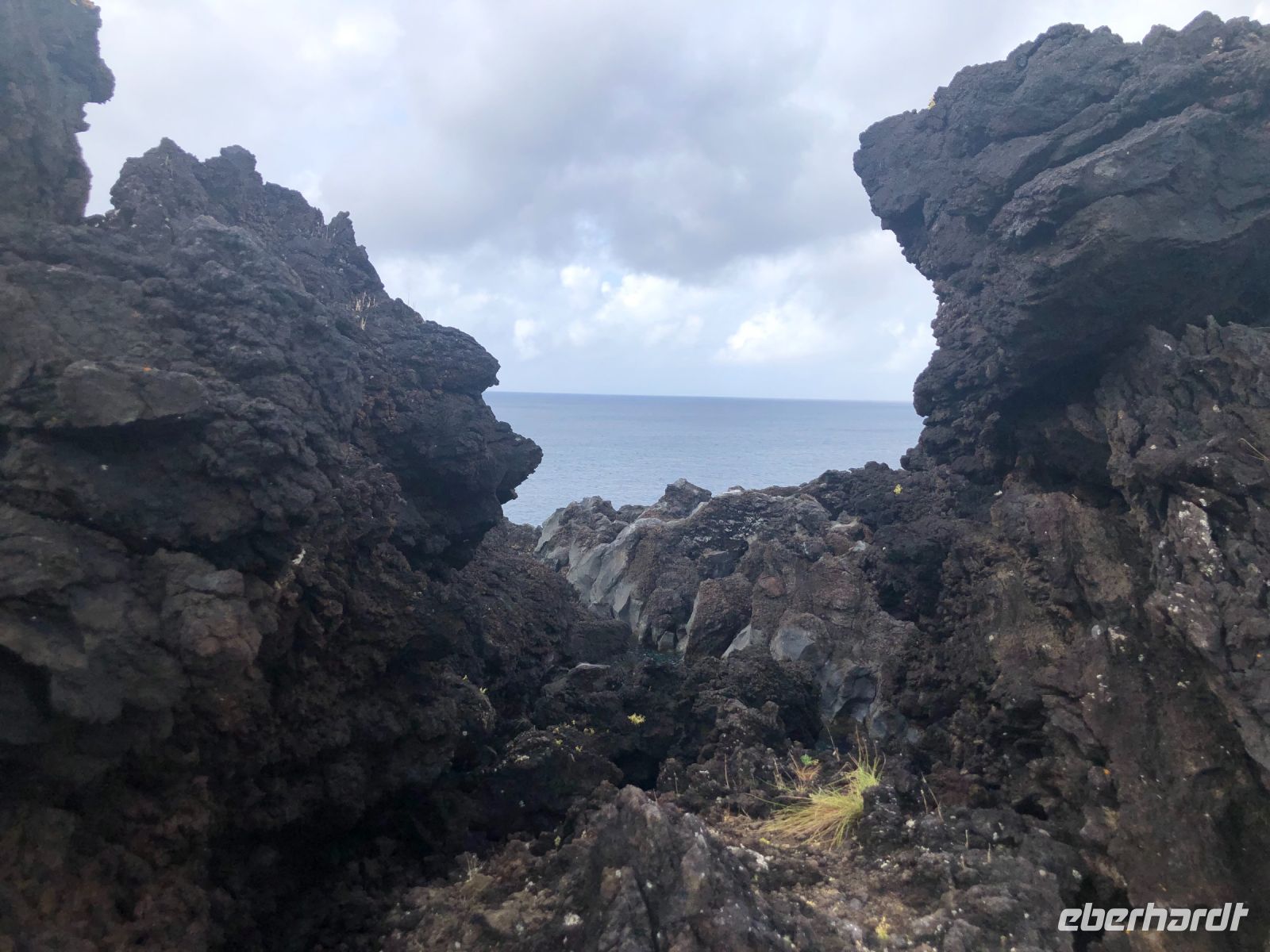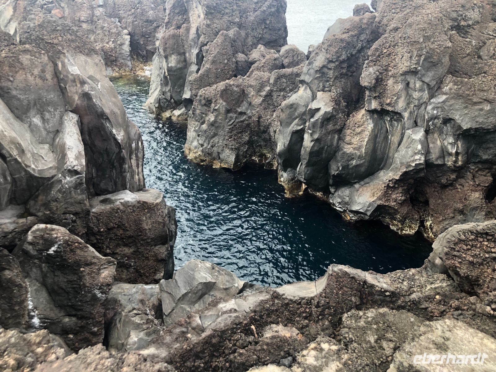 Unser Aussichtspunkt ist heute vom Nebel verhüllt. Wir müssen damit vorlieb nehmen, was von unten zu sehen ist. In Sao Roque do Pico besuchen wir ein Industrienuseum. Das ist eine Fabrik, in der früher die erlegten Wale verarbeitet wurde. Nichts für schwache Mägen (gruselig). Aber die Dörfer hier sind ja wirklich kleine Schmuckstückchen. Die Häuser in Sao Roque sehen aus wie mit Kuhfell bespannt - alles in schwarz-weiß. Dann folgen Häuser mit knallroten Türen und Fensterläden. Auf einer Terrasse sieht man noch, wo die Lava erkaltet ist. Ein weiterer Spaziergang führt ans Meer, wo die Wellen an den dunklen Lavafelsen nagen und seltsame Formationen bilden.