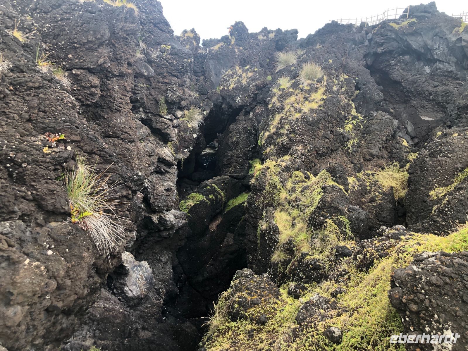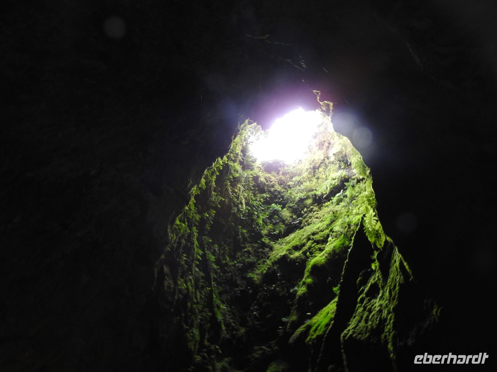 Einmalig und wirklich beeindruckend ist es, als wir direkt in den Schlund eines Vulkankraters steigen. Allerdings ist es hier nicht schwarz und heiß, sondern äußerst feucht und grün. Die Wände sind komplett bemoost und es tropft aus allen Ecken. Wow!