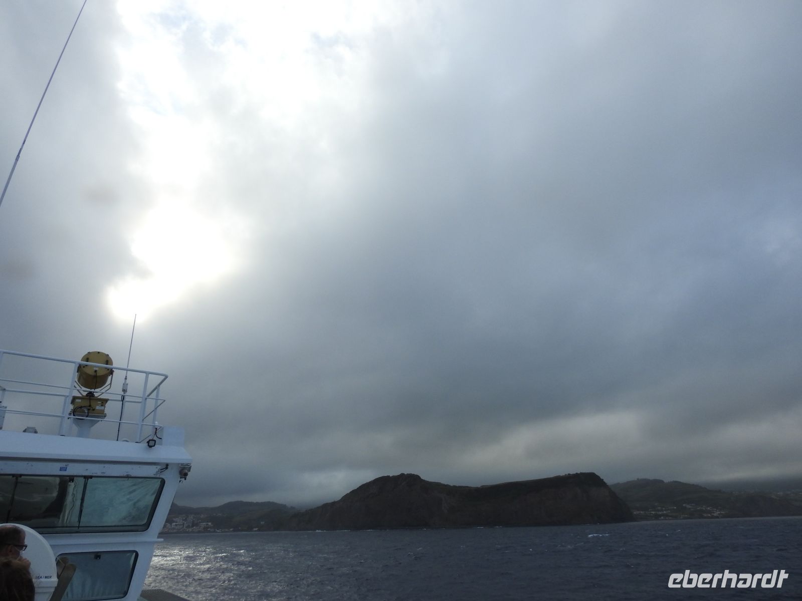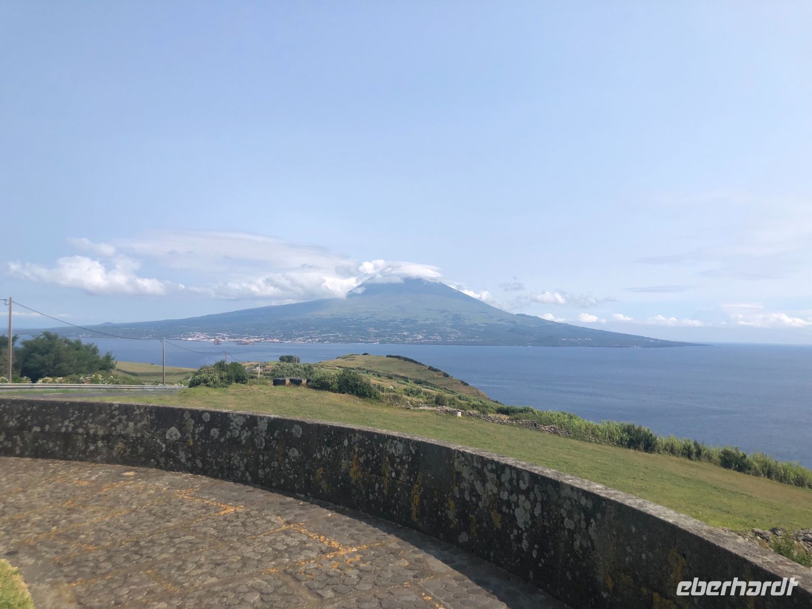 Mit der Fähre setzen wir über zur Insel Pico. Hier befindet sich der höchste Berg Portugals. Als wir gestern mit dem Flugzeug nach Faial geflogen sind, konnten wir ihn gut sehen. Aber seit dem verbirgt er sich hinter dicken Wolken.