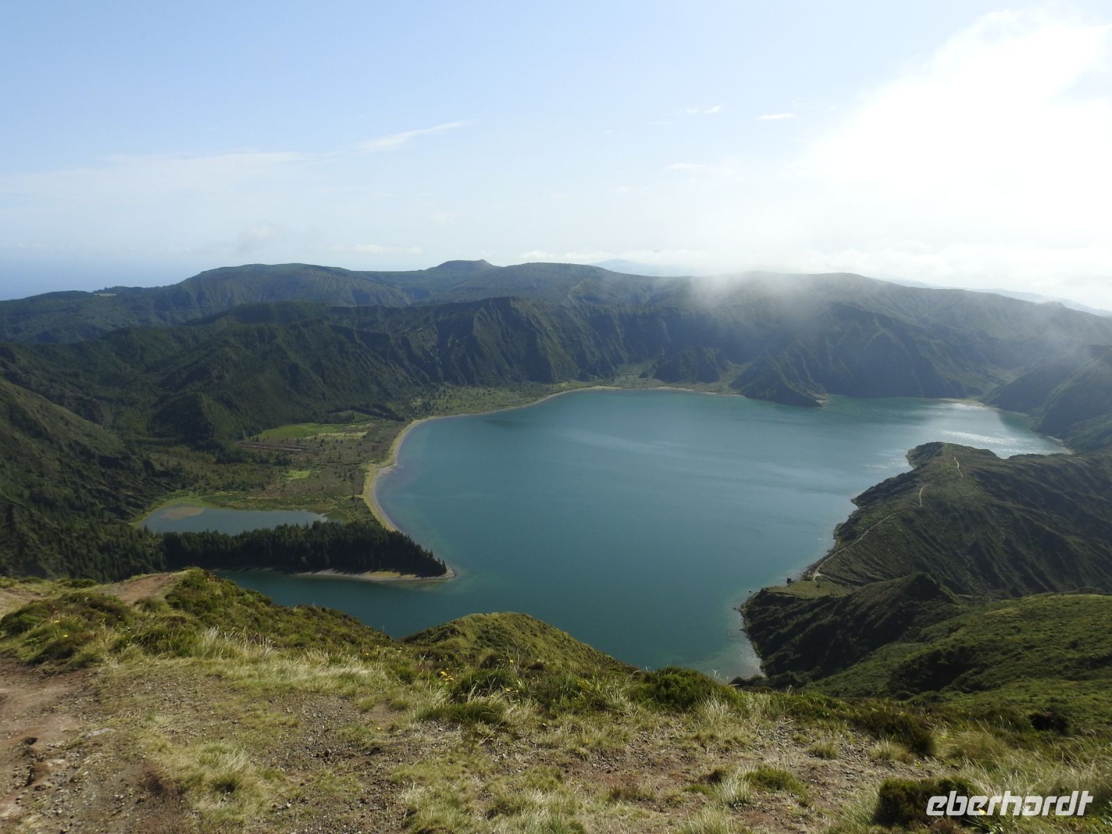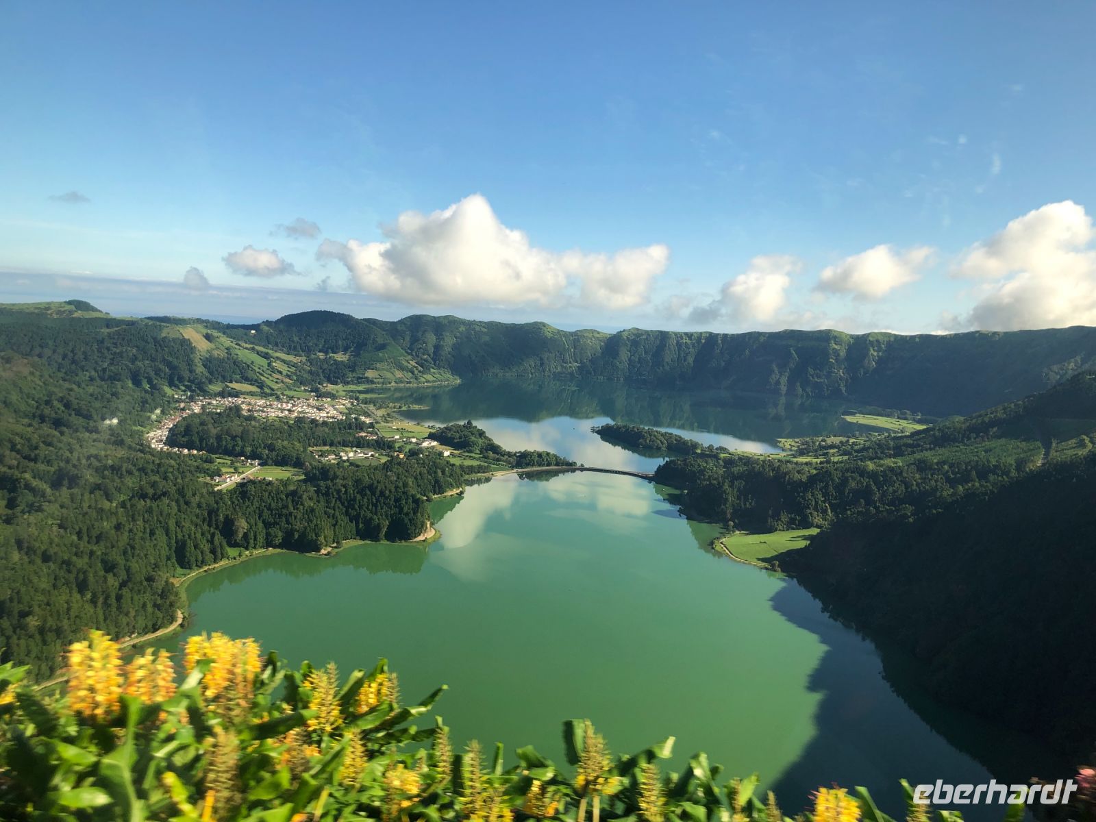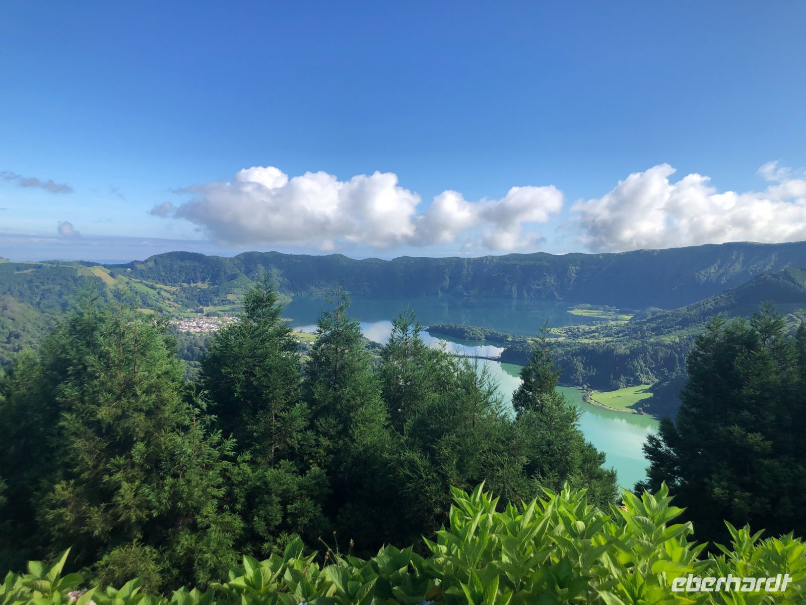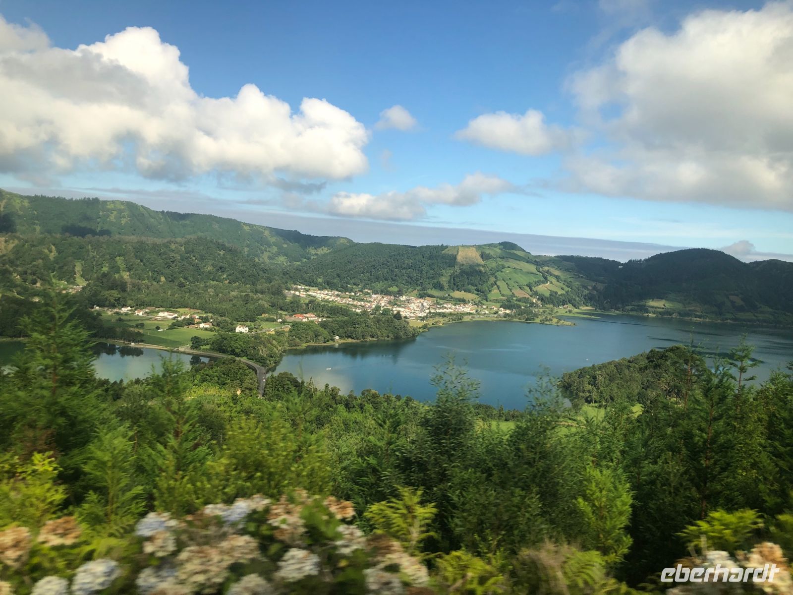 Was haben wir für ein Glück mit dem Wetter! Die Aussicht auf den blauen See Lagoa Azul und den grünen See Lagoa Verde ist grandios. Wie geht das, dass ein See zweifarbig ist? Tja, die völlig unromantische Erklärung ist der Einfall des Sonnenlichts, der die eine Hälfte des Sees grünlich schimmern lässt. Besser klingt schon die, wenn auch traurige Sage von der blauäugigen Prinzessin, die in einen grünäugigen Hirten verliebt war, sich jedoch von ihm trennen musste und die Tränen, die beide beim Abschied vergossen, bildeten den blauen und den grünen See.