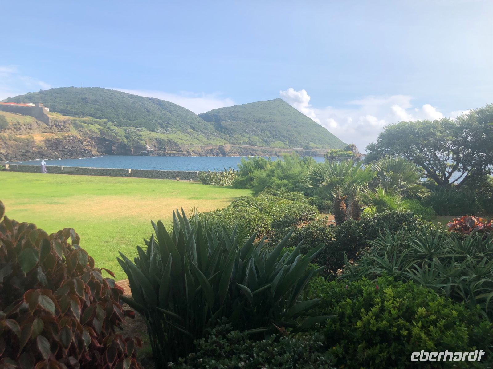 Vom Hotel Terceira Mar fahren wir mit dem Bus zum Monte Brasil. Von hier haben wir abermals einen phänomenalen Blick in die vulkangeprägte Landschaft. Um auf den Aussichtspunkt zu gelangen, muss sich unser Bus durch ein schmales Festungstor zwängen -