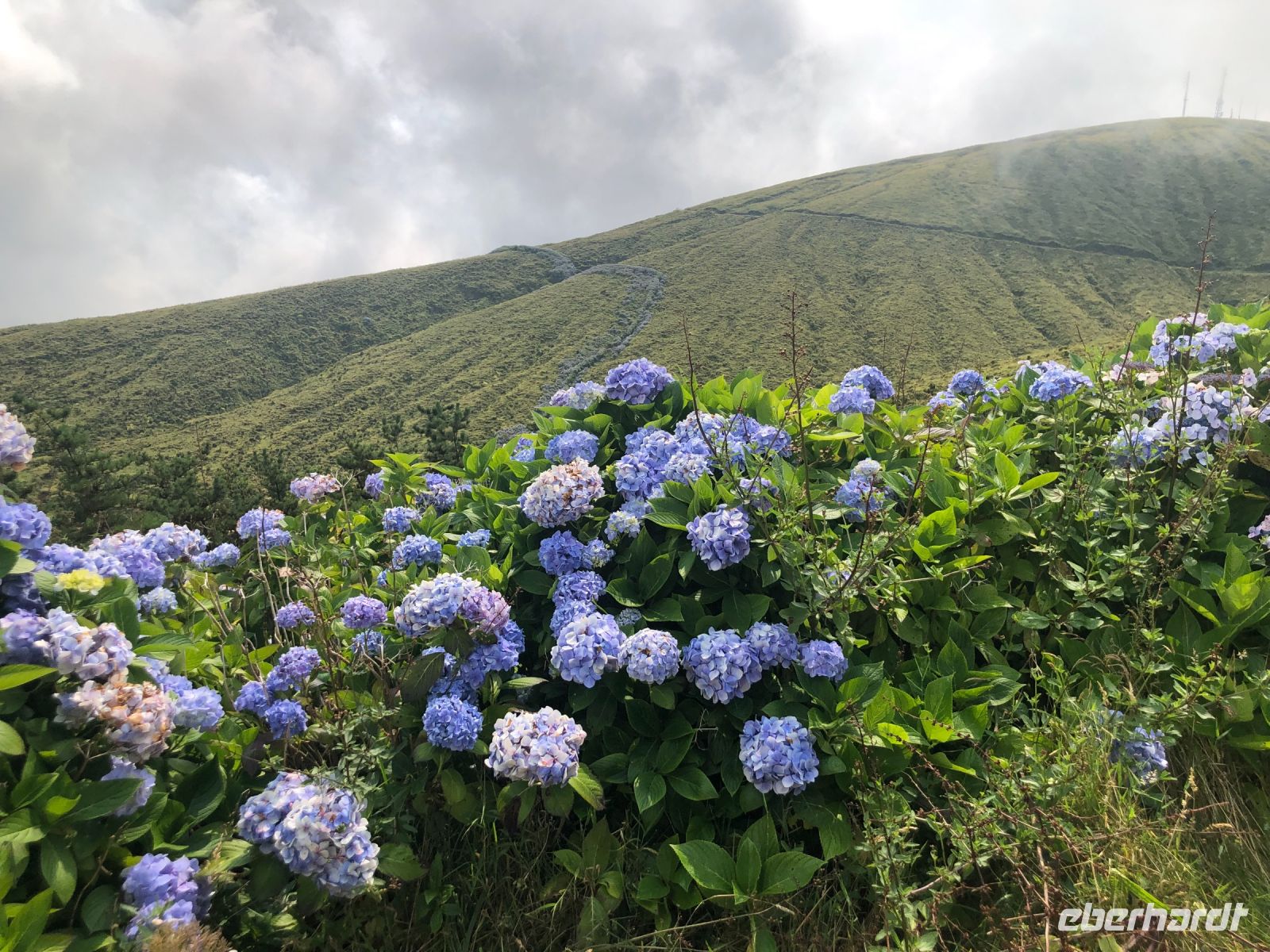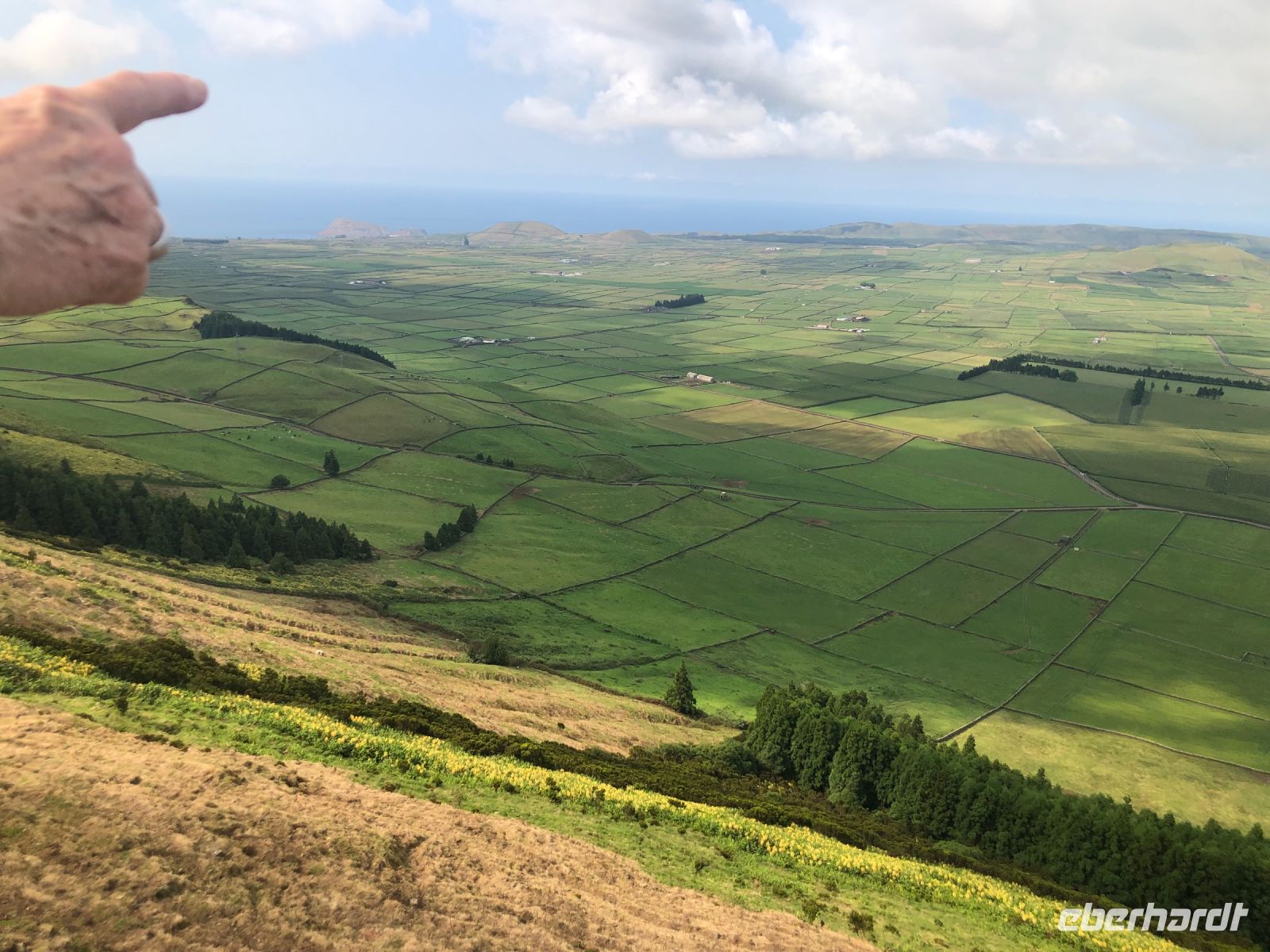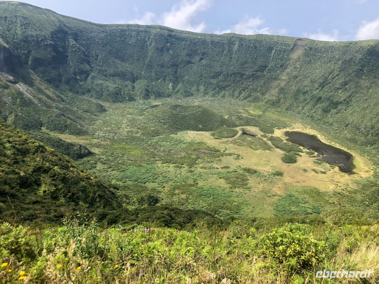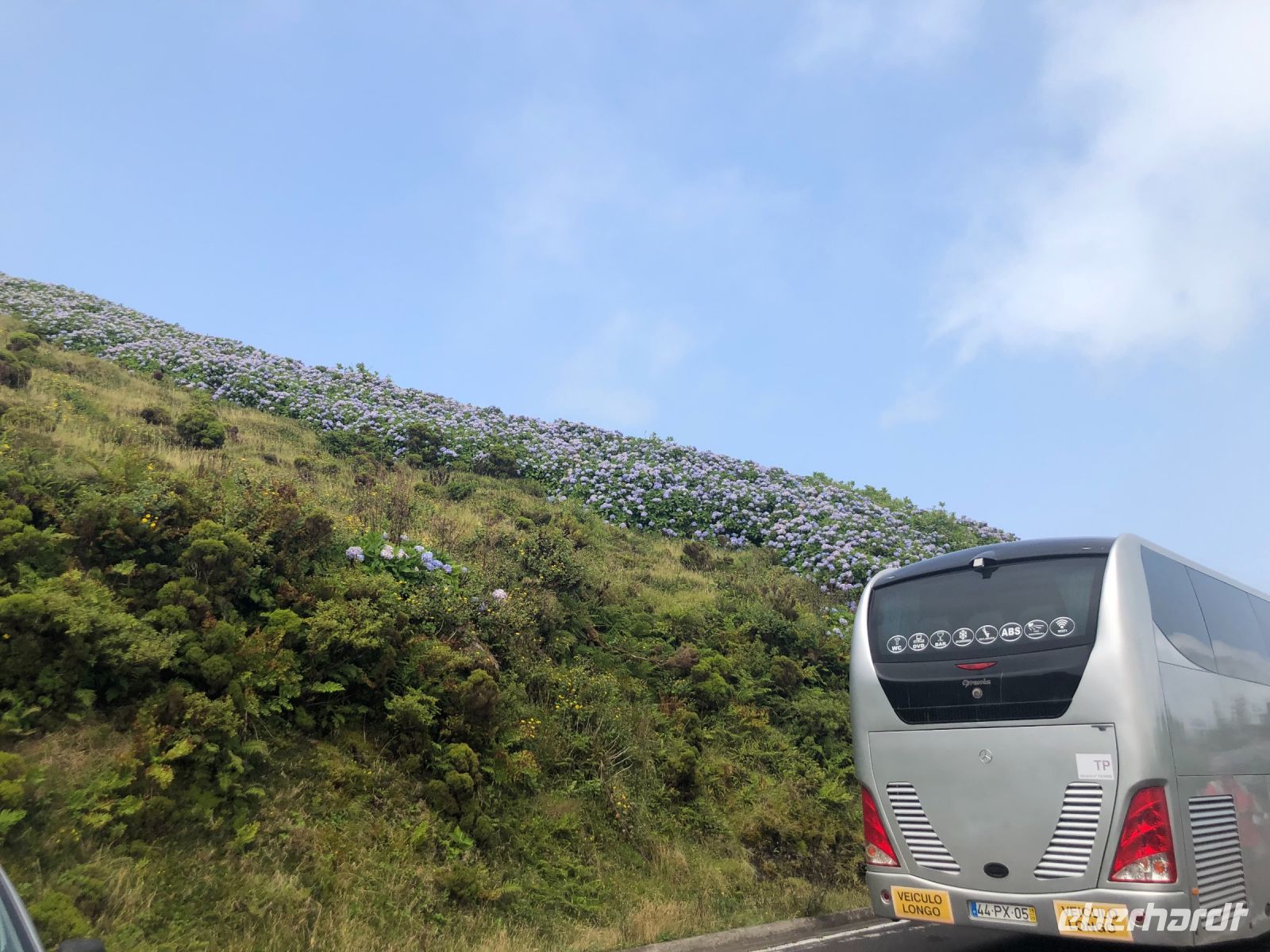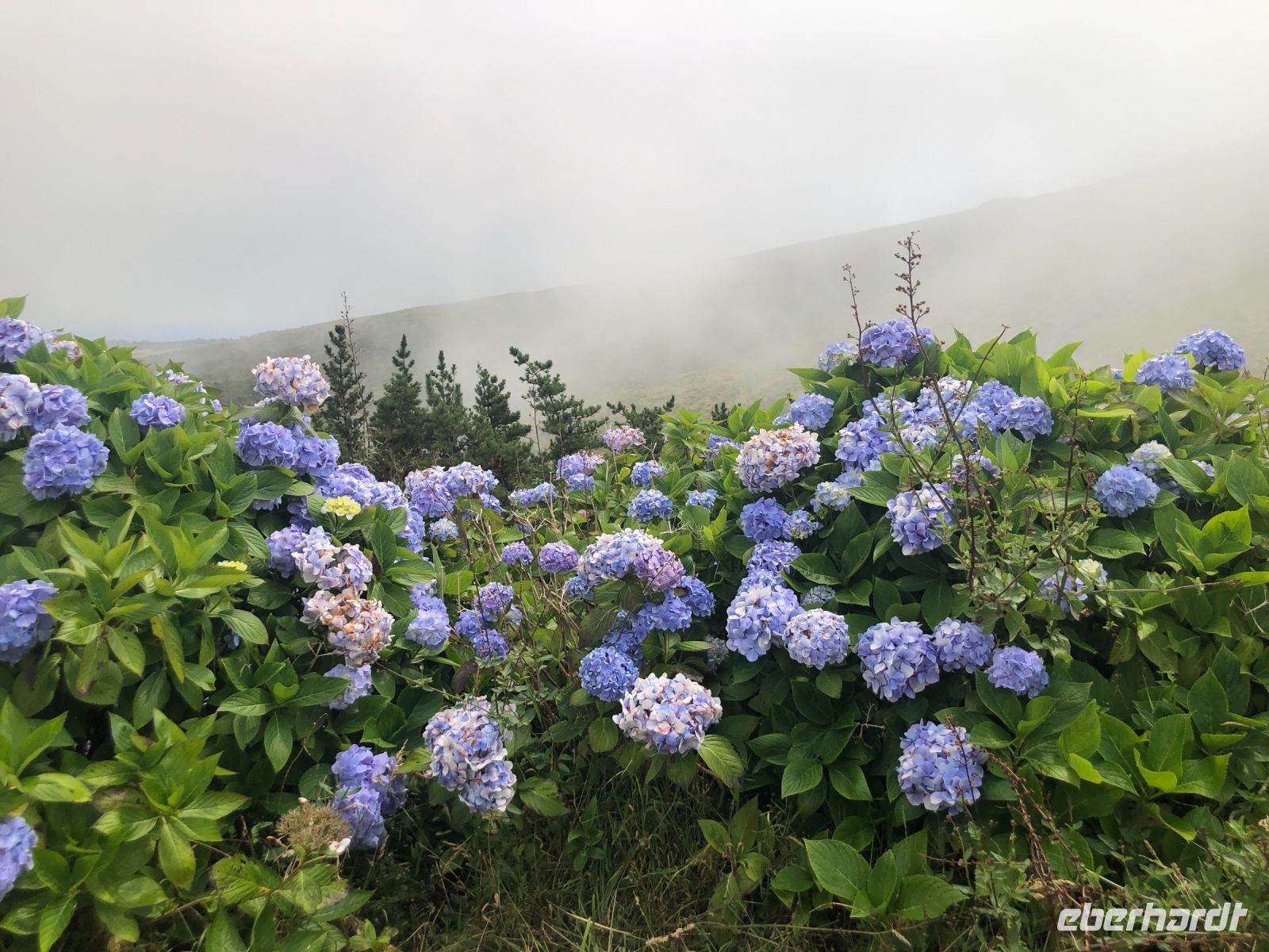 Wir fahren zur Caldeira do Faial. Unterwegs sind die Straßen kilometerweit von Hortensien gesäumt, eine unglaubliche Pracht in Blau. Die Caldeira ist abermals beeindruckend, ein fast kreisrunder Vulkankessel und tolle Sicht.