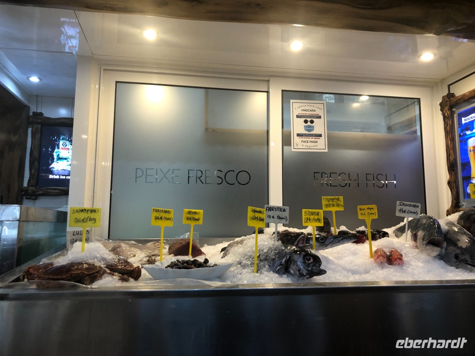 Kurz gesagt, es gab zu viel Wind und zu hohe Wellen und das Whalewatching wurde abgesagt. Glücklicherweise konnte die Tuk-Tuk-Bahn auch noch mehr Interessierte mitnehmen. Gegen 11 Uhr laufen wir Richtung Festung. Auf der Küstenstraße immer geradeaus circa 15 bis zwanzig Minuten. In dem kleinen Kiosk erwartet uns eine junge Frau bei der wir die Fahrt bezahlen und die sich später als eine der Begleitpersonen entpuppt. Der Bahn-Fahrer ist auch zeitig da, aber, obwohl außer uns keine weiteren Gäste aufgenommen werden, geht es erst pünktlich 11.30 Uhr los. In drei Anhängern haben wir zwölf Personen reichlich Platz. Der kleine Zug fährt durch die Straßen und Gassen der Stadt, die Ansagen kommen per Lautsprecher in Portugiesisch und Englisch. In einem Wohngebiet stoppt der Zug und wir werden gebeten, auszusteigen. Wir kommen zu einem recht unscheinbaren Café. Drinnen ist ein Buffet mit landestypischen Snacks aufgebaut. Zwei Frauen wuseln herum, um noch alles hübsch zu machen und immer wieder Platten hinzu zu stellen. Wir dürfen uns bedienen. Es gibt die uns bereits bekannten Blutwürstchen mit Ananas, frisches Brot mit Wurst und Schinken belegt, Käse, Oliven, scharfe Soße und vieles mehr, natürlich auch Kuchen. Selbst ein Getränk und ein Likörchen zum Schluss sind inklusive. Zufrieden und satt zuckeln wir mit der Bahn zum Ausgangspunkt zurück.
