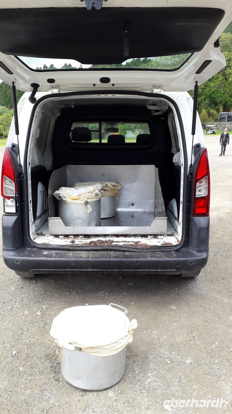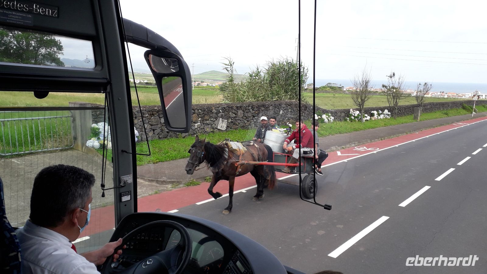 Leider ist es sehr neblig, und wir können den blauen und den grünen See nur auf der Abbildung und nicht vom Aussichtspunkt „Vista do Rei“ sehen. Es fängt an zu nieseln und wir gehen bald zurück zum Bus.