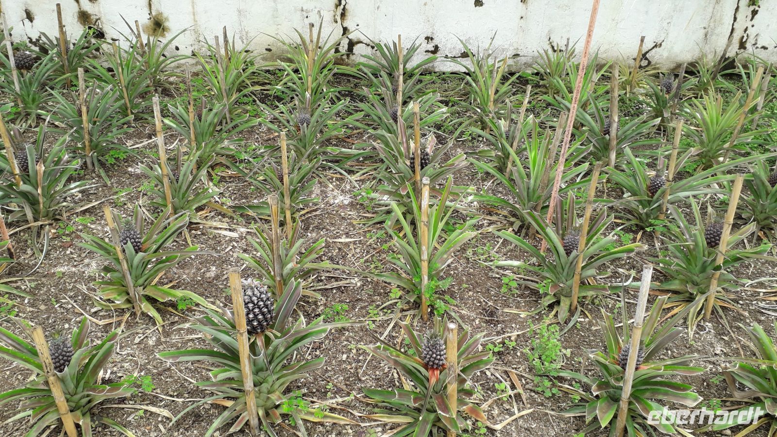 Zum Schluss lernen wir, wie hier auf der Insel Ananaspflanzen wachsen. 12 bis 18 Monate vergehen, bis eine Frucht heranreifen kann. Die Innentemperatur in den Ananasgewächshäusern ist sehr warm. Viele können aus diesem Grund gar nicht rein gehen und schauen sich die Pflanzen lediglich von außen an. Im Laden kosten wir einen Ananasbrand.